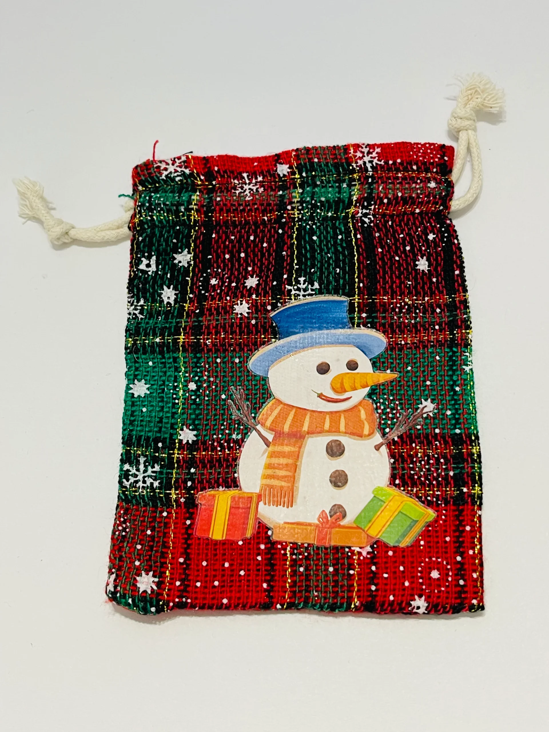 Lot de 5 sachets cadeaux en toile de jute avec comme motif bonhomme de neige . 14 x 10 cm.
