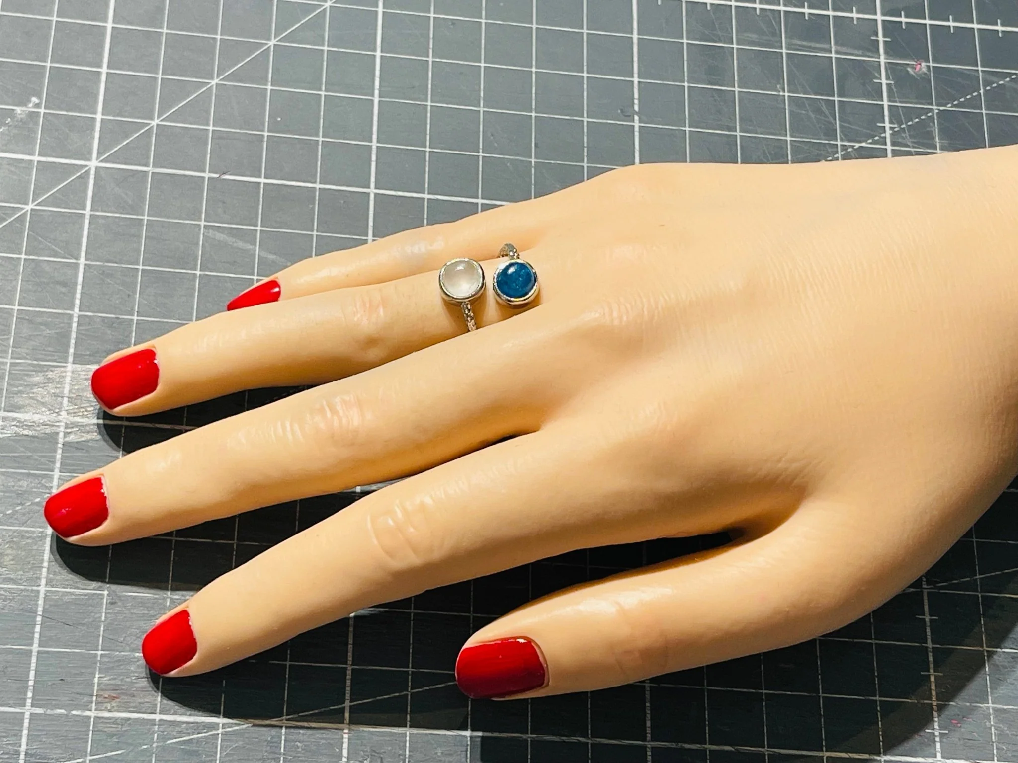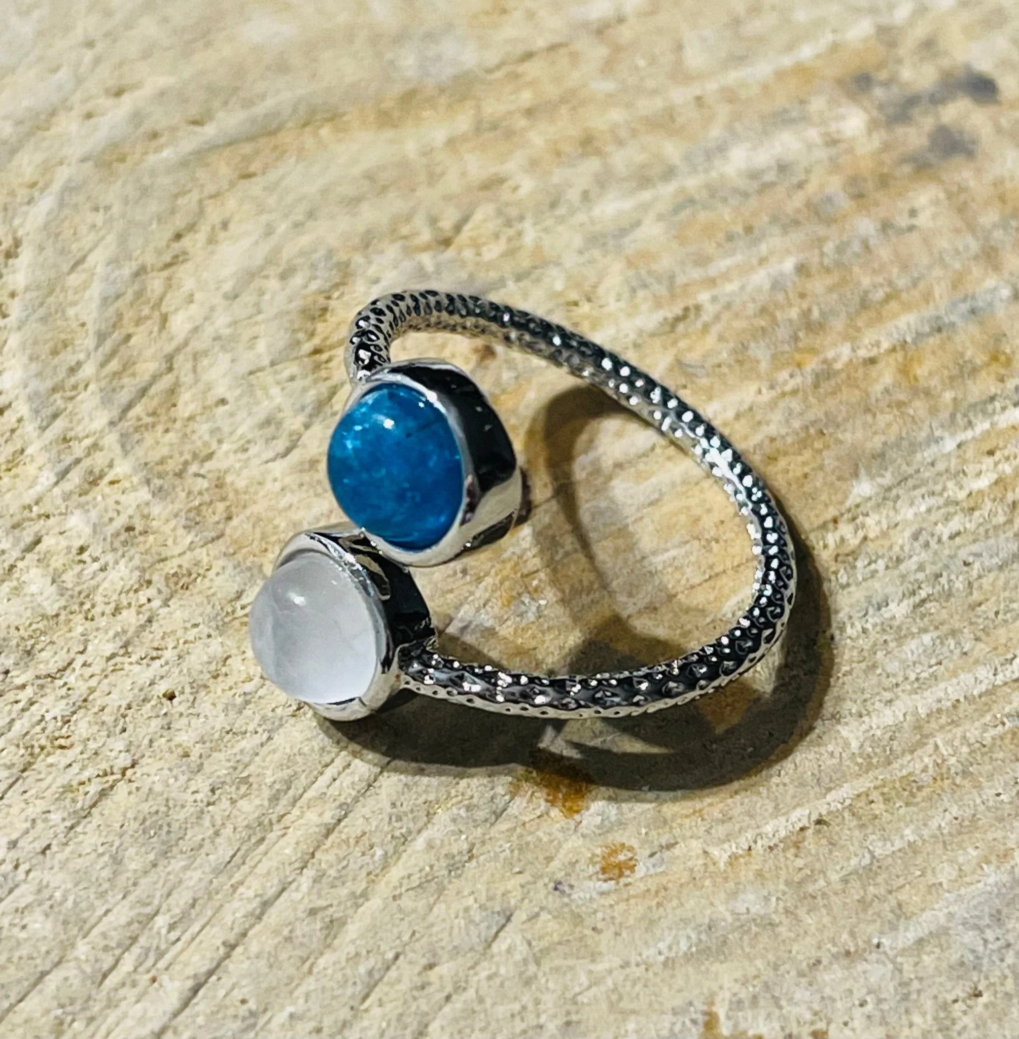 Il s’agit d’une bague avec deux pierres naturelles rondes Apatite et Quartz rose (6 mm). En laiton argenté.Hauteur : 17 mm.Taille réglable du 57-62