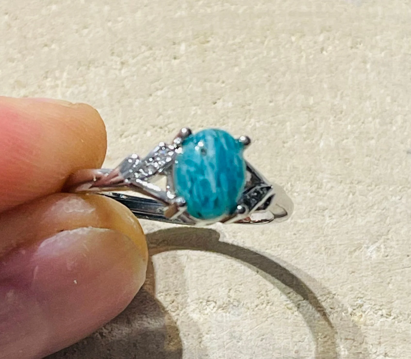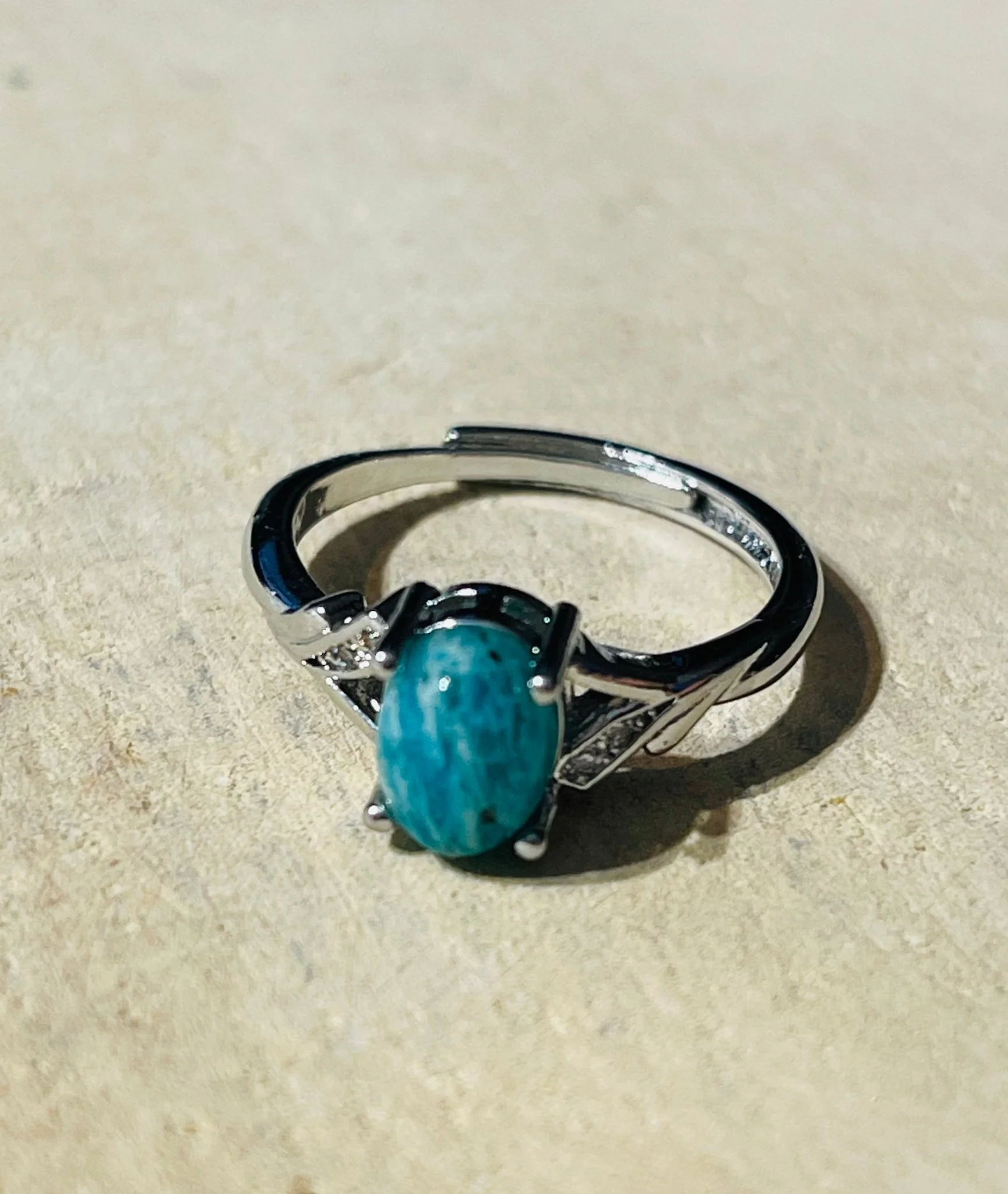 Il s’agit d’une bague en Amazonite ovale (8 x 6 mm) et Diamants Cz sur les côtés. En laiton argenté.Taille réglable du 55-60.