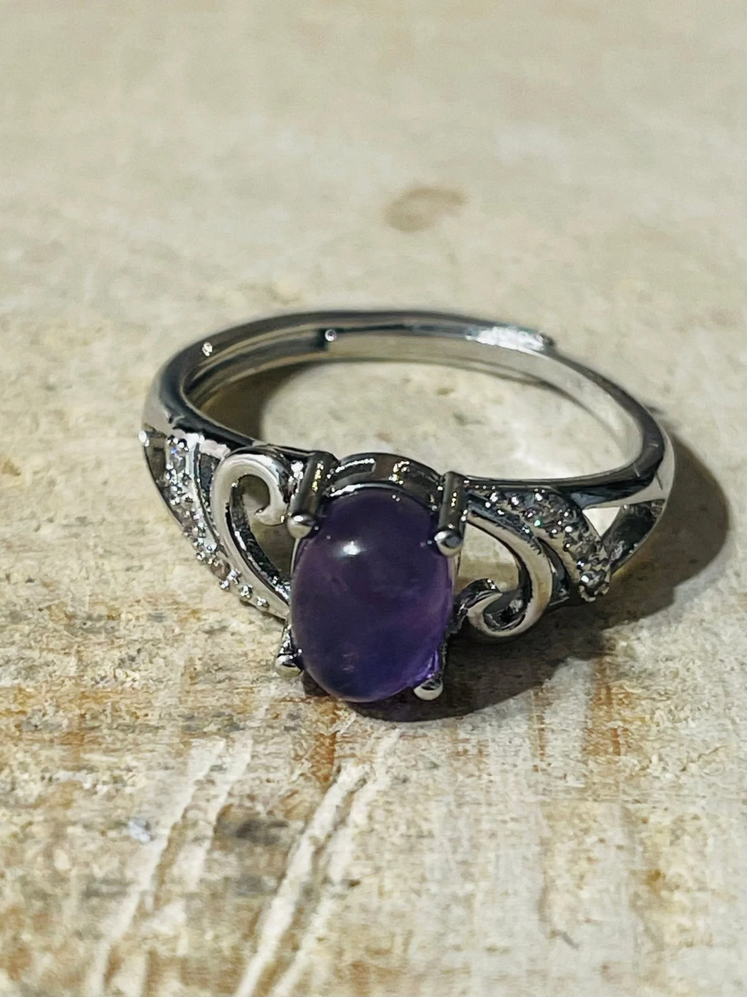 Il s’agit d’une bague en Amethyste ovale (8 x 6 mm). En laiton argenté.Taille réglable du 57-62