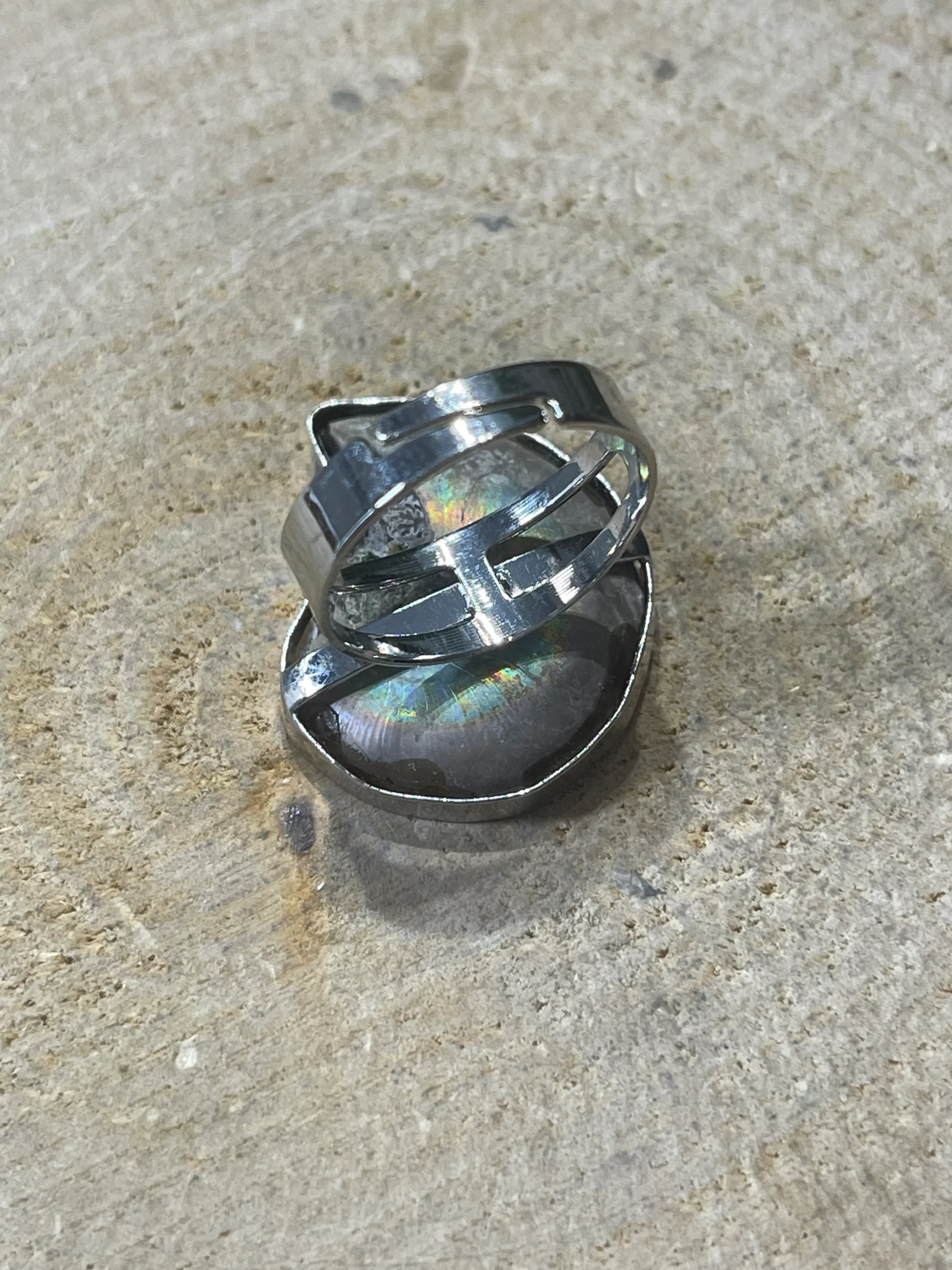 Bague sertie d’une Ammonite. Le dos est brut et on peut apercevoir les couleurs arc en ciel qui est assez rare.Dimensions : 3-4 cm. Support en laiton argenté.