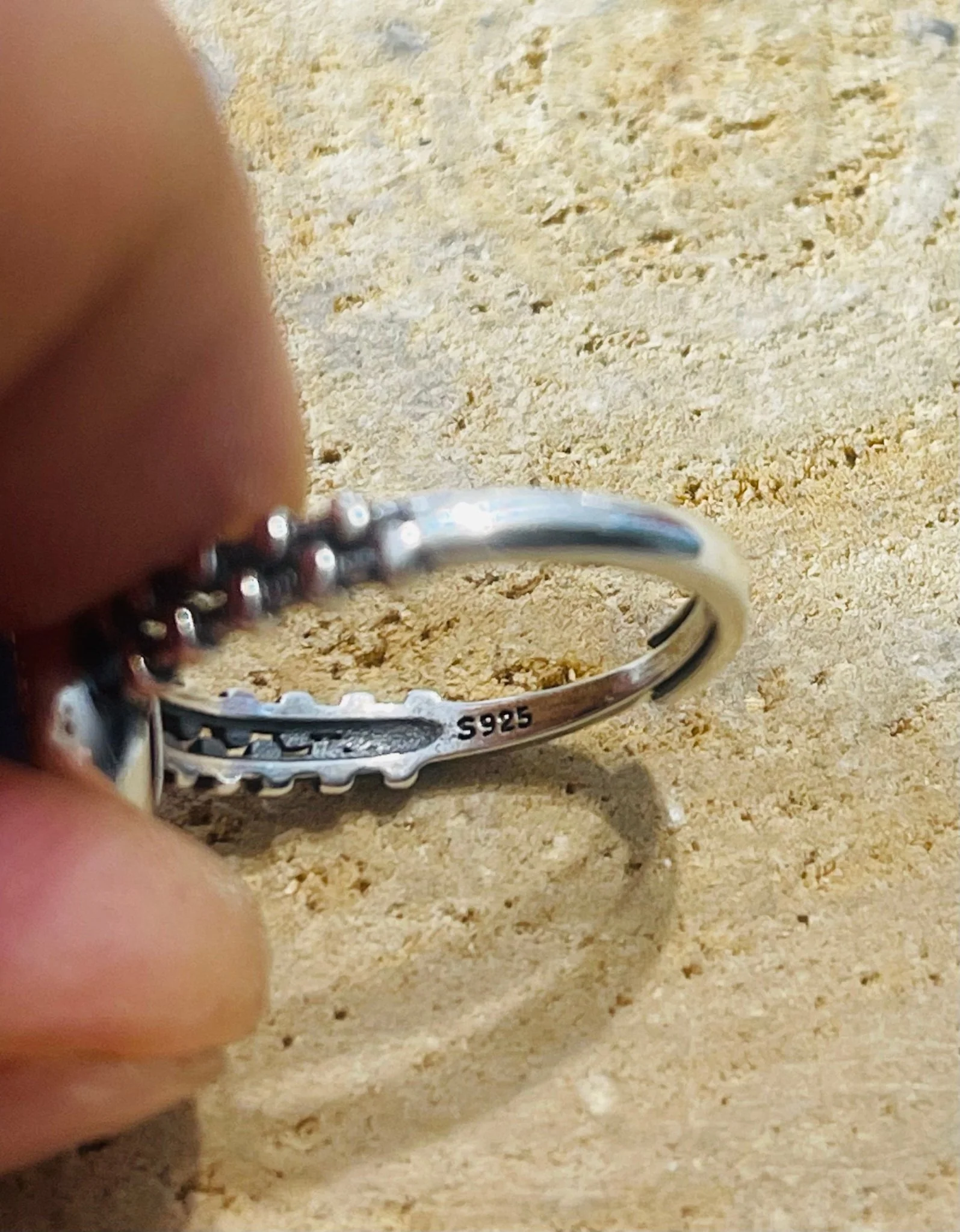 Il s’agit d’une bague en argent 925 sertie d’une Cyanite (8×6 mm). Poinçon S925 à l’intérieur de la bague. Taille réglable du 51-54.
