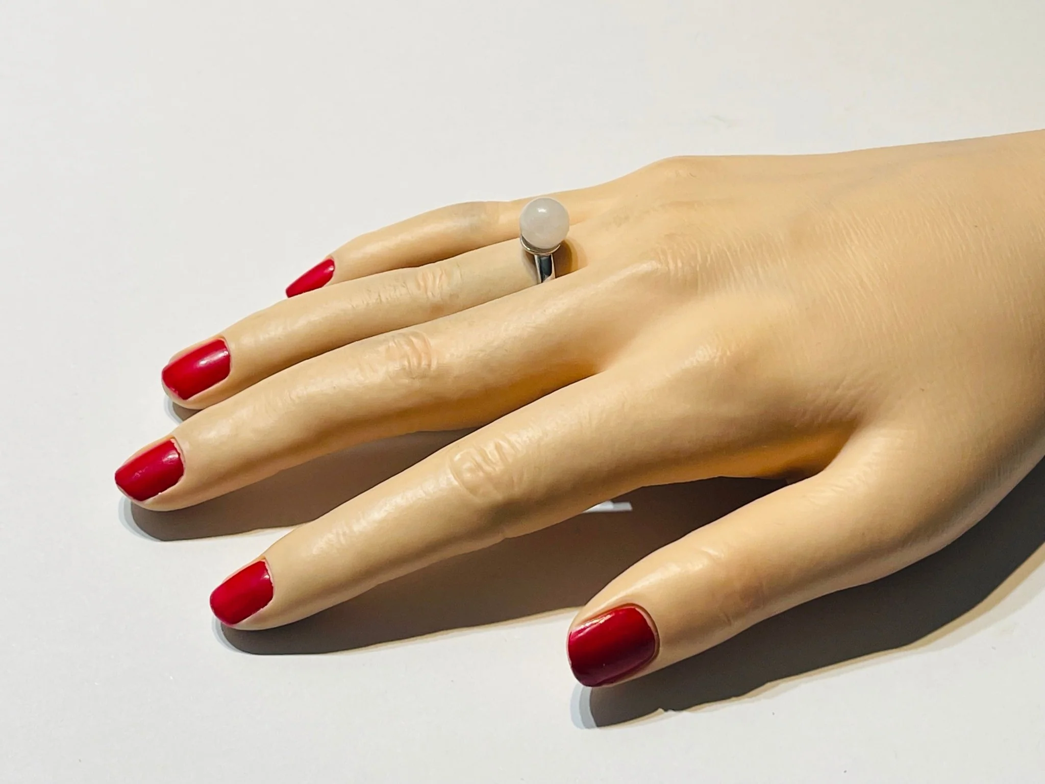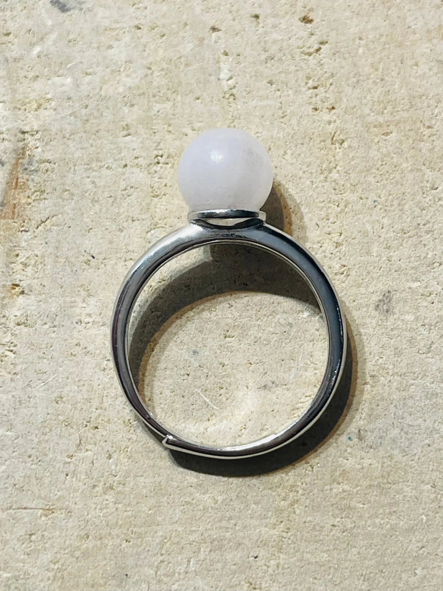 Il s’agit d’une bague en argent 925 sertie d’une perle en quartz rose (8mm).