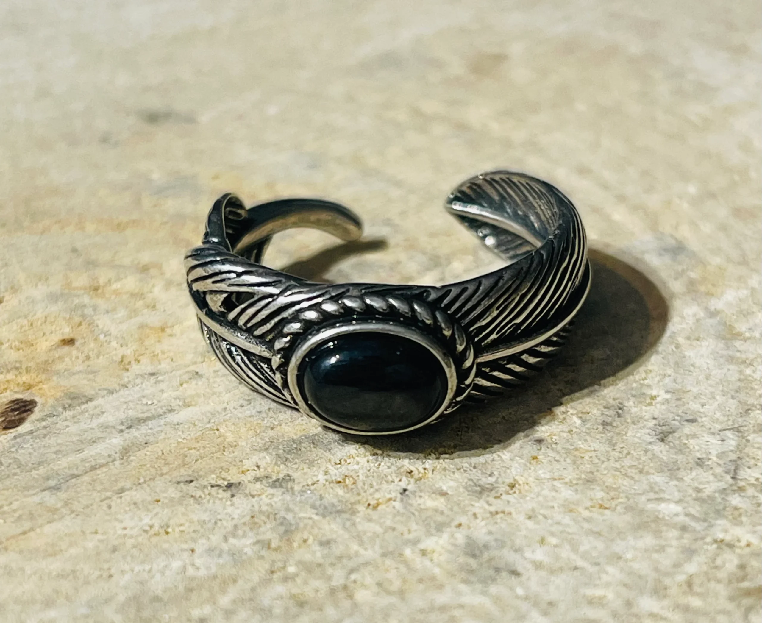 Bague en forme de plume. Sertie d’une hypersthène (9×6 mm). En laiton argenté. Taille réglable : 61-65 Vertus : pierre de réconciliation et d’empathie.
