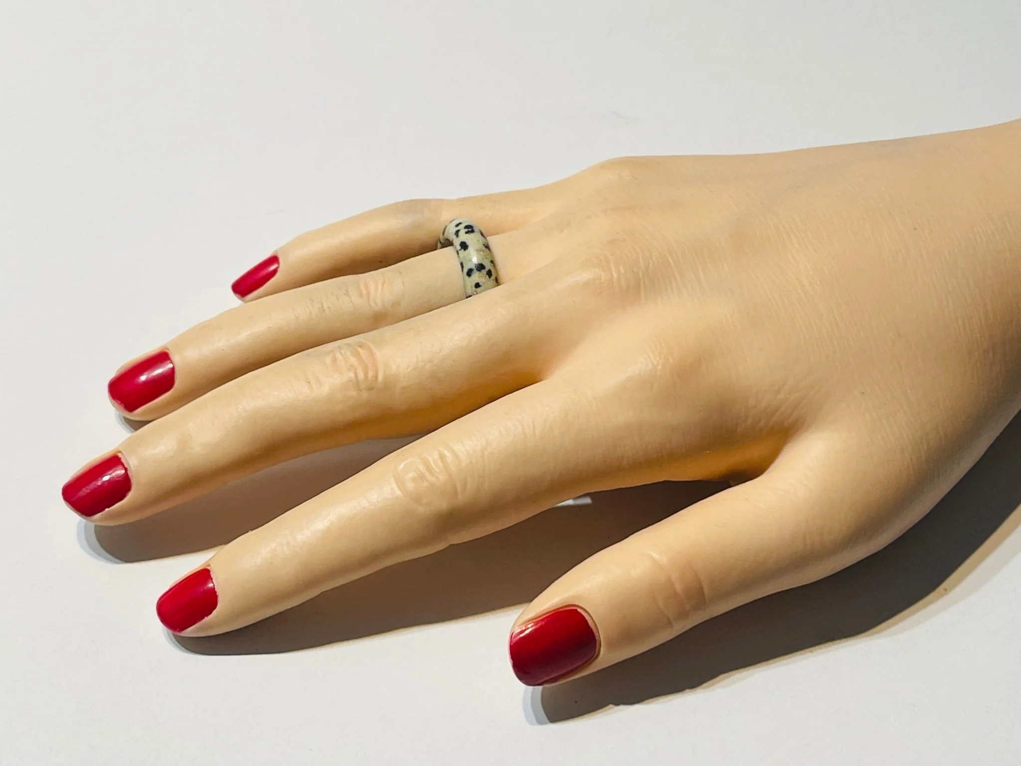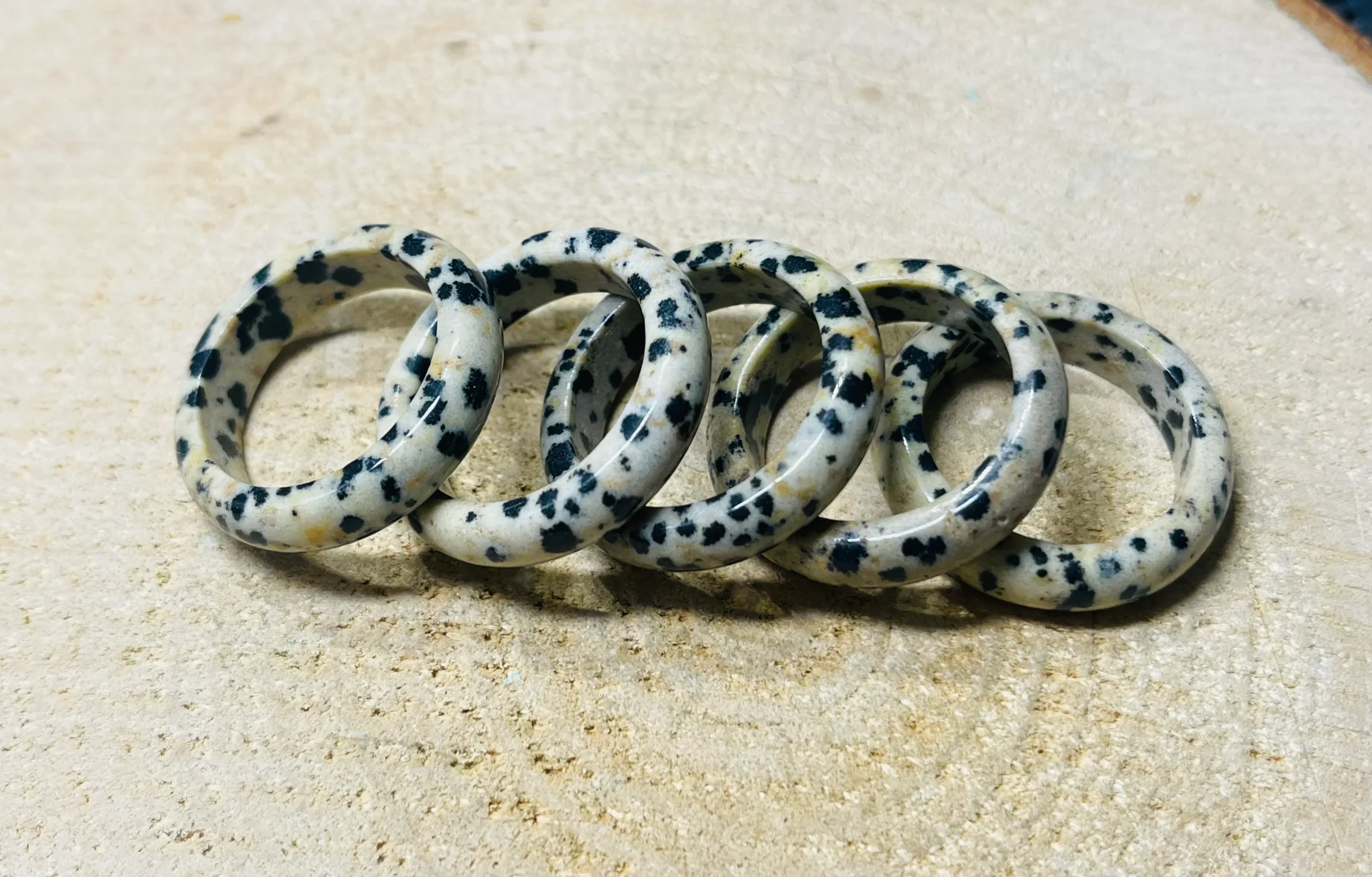 Il s’agit de bague entièrement faite en Jaspe Dalmatien.