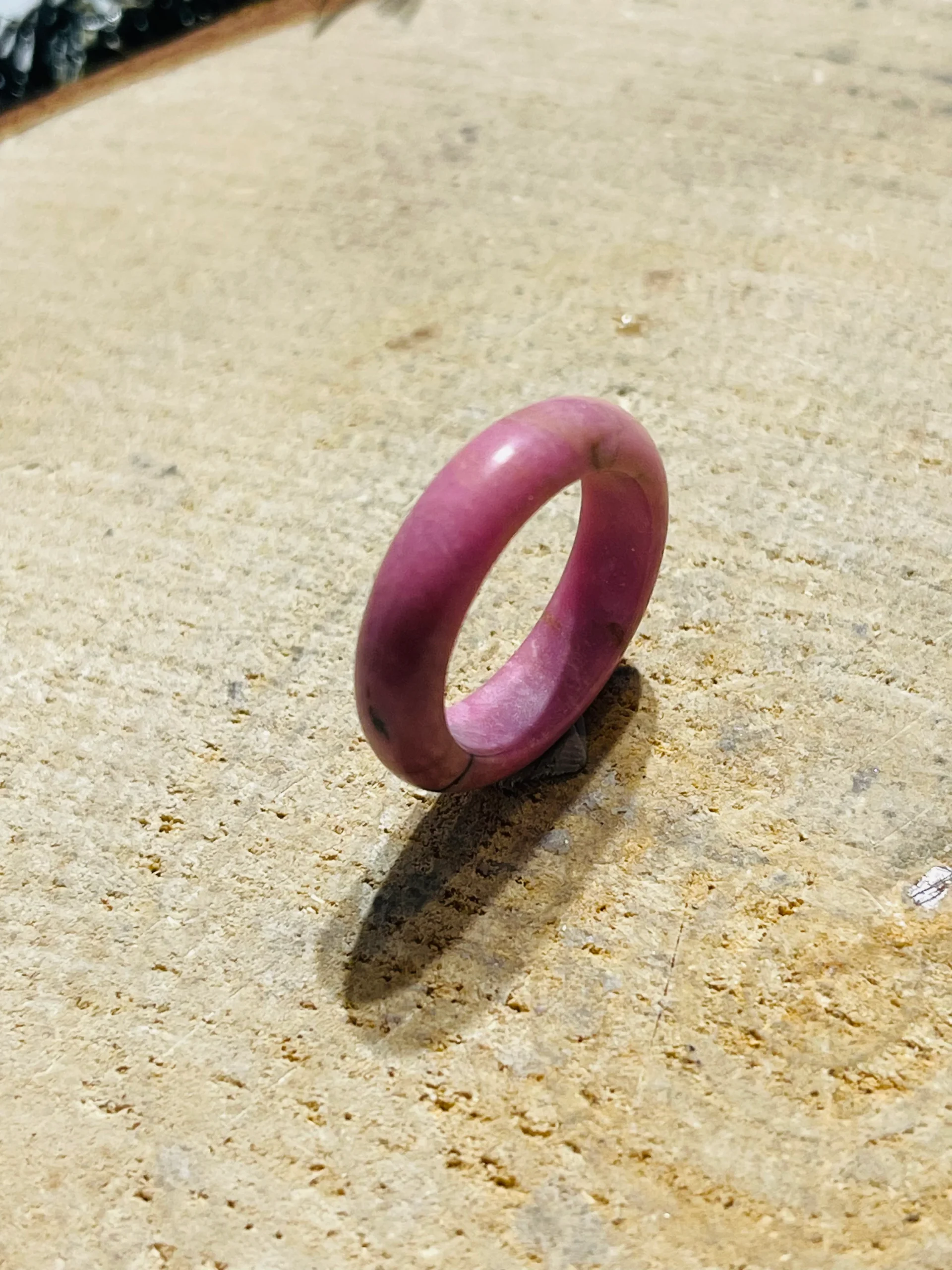 Il s’agit d’une bague entièrement faite en Rhodonite naturelle. Chaque bague est unique. Hauteur : 6 mm. Taille 60. Vertus : diminuer les angoisses et apaise. La rhodonite est une pierre liée à l’énergie du coeur. Elle est donc très plébiscitée par les amoureux.
