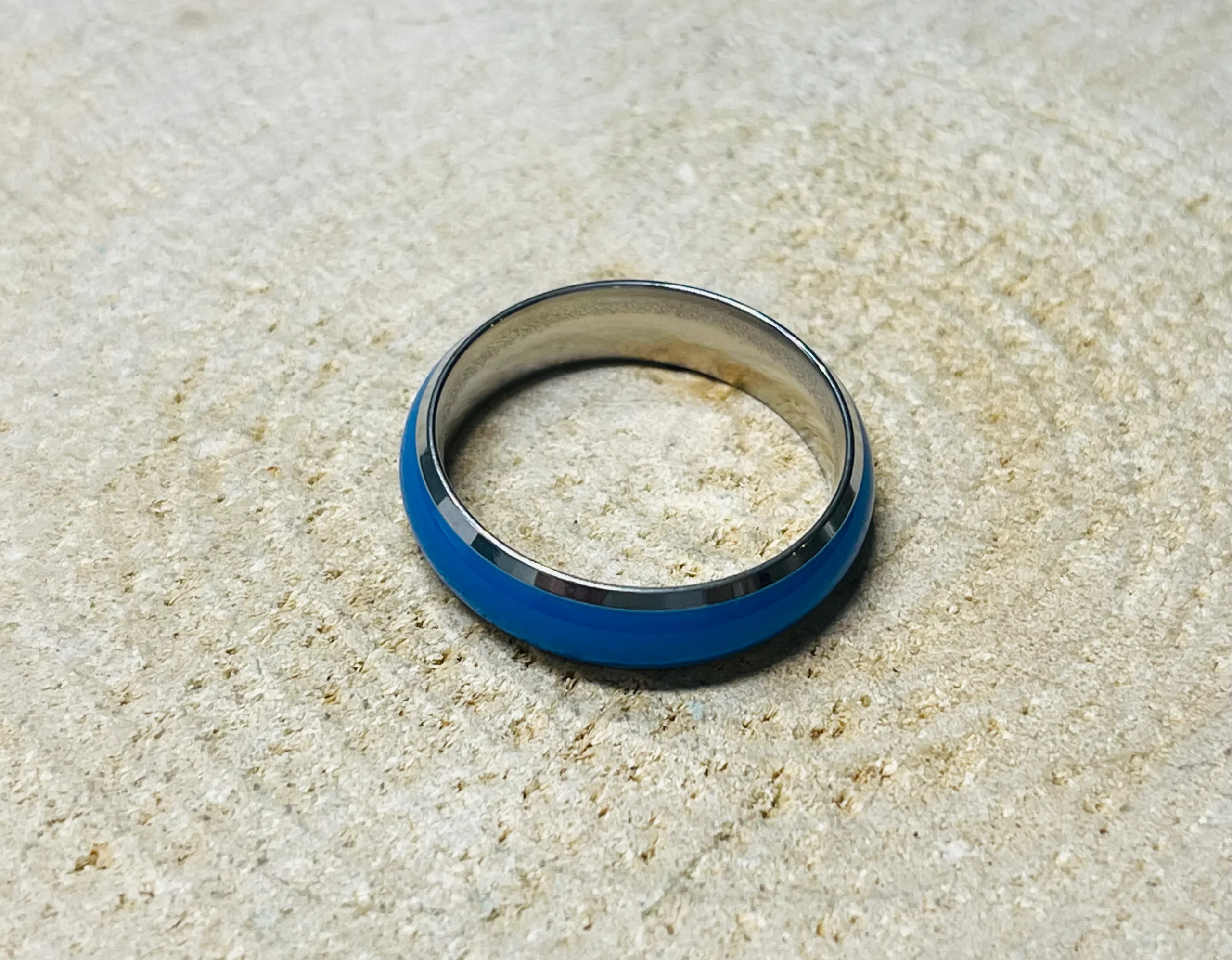 Il s’agit d’une bague phosphorescente bleue en Acier inoxydable. Elle brillera dans la nuit si vous l’approchez d’une source lumineuse. Hauteur : 6 mm.Taille 64.