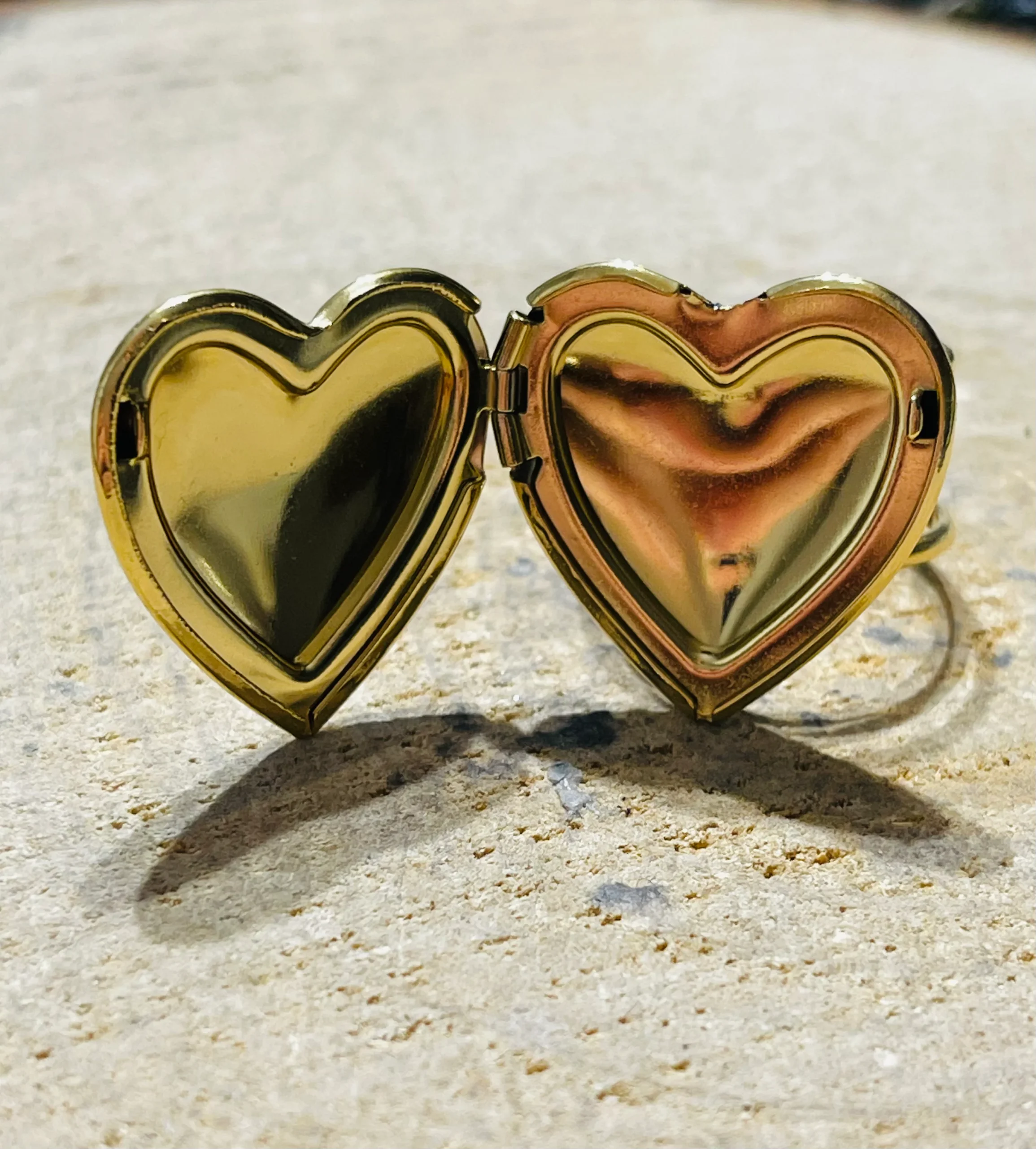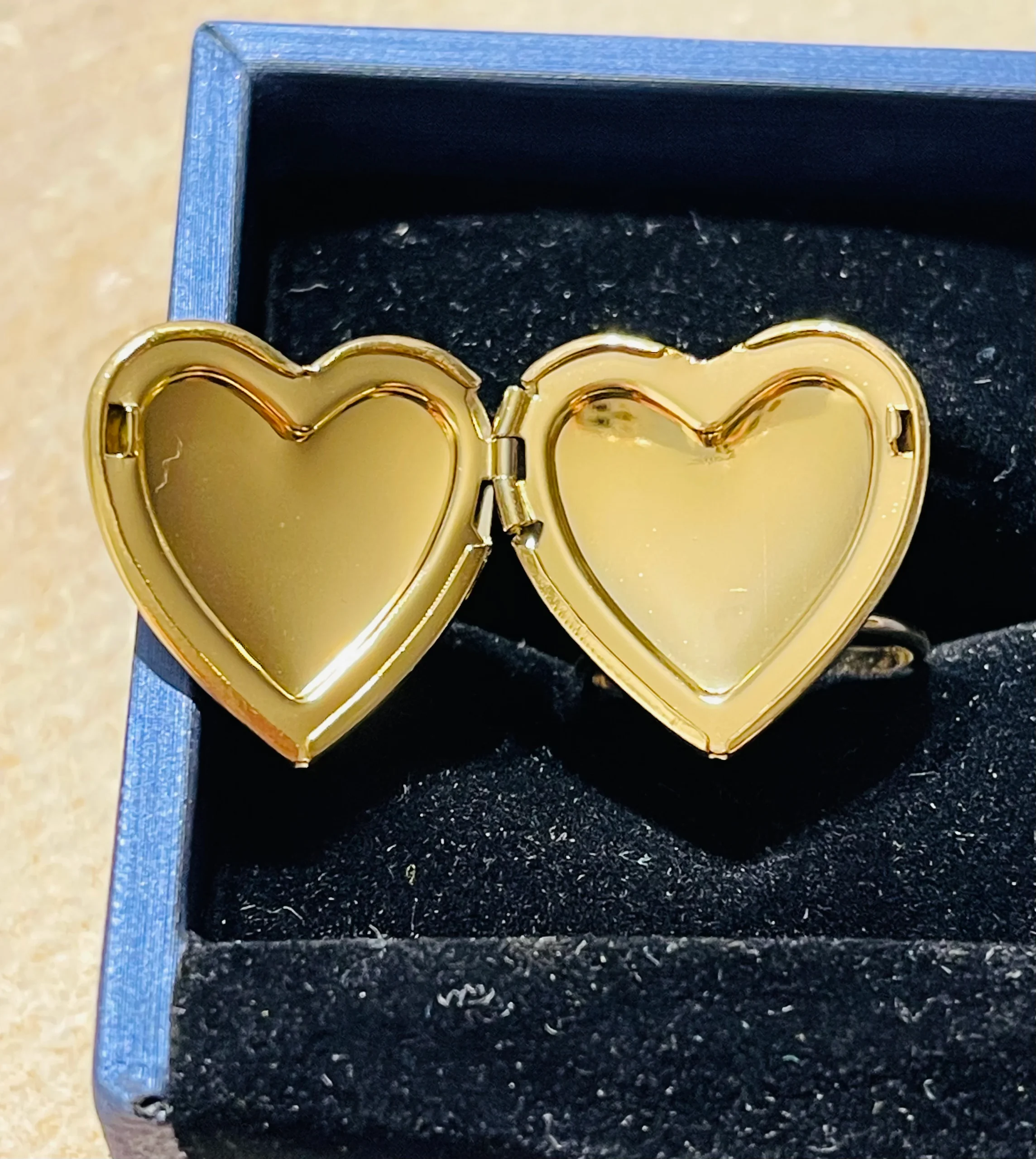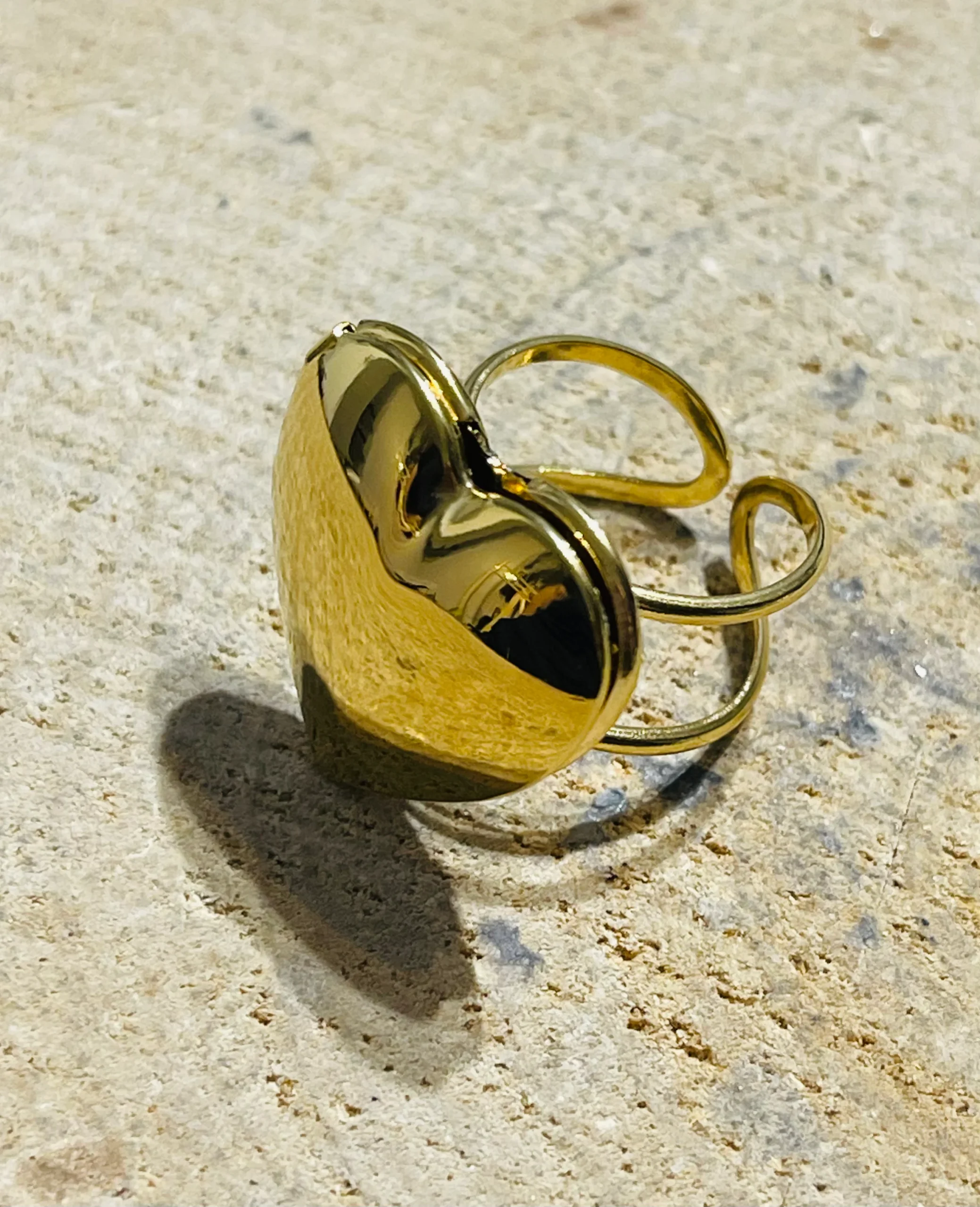 Bague porte photo en forme de cœur. En acier inoxydable doré. Des photos à portée de doigt. Taille réglable 54-57 Hauteur : 23 mm. Belle finition.