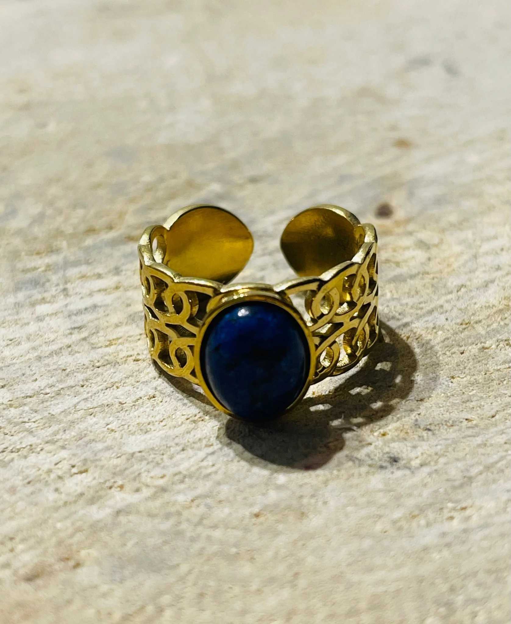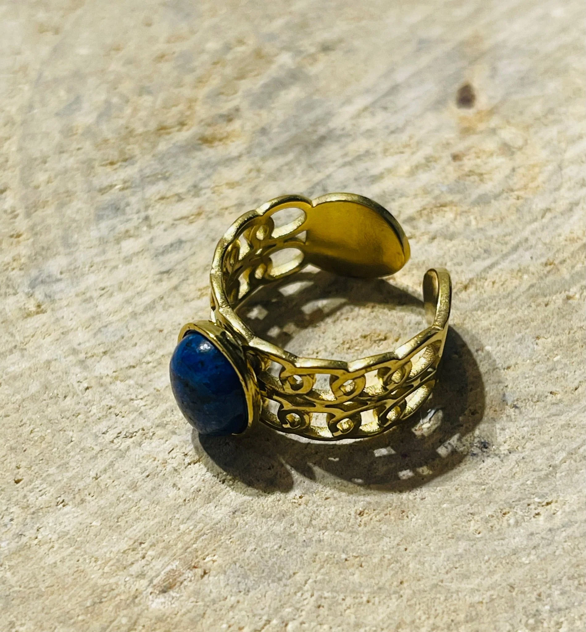Bague sertie d’un Lapis lazuli cabochon. En acier inoxydable doré. Taille réglable 54-57 Hauteur : 12 mm. Très solide et de belle qualité.
