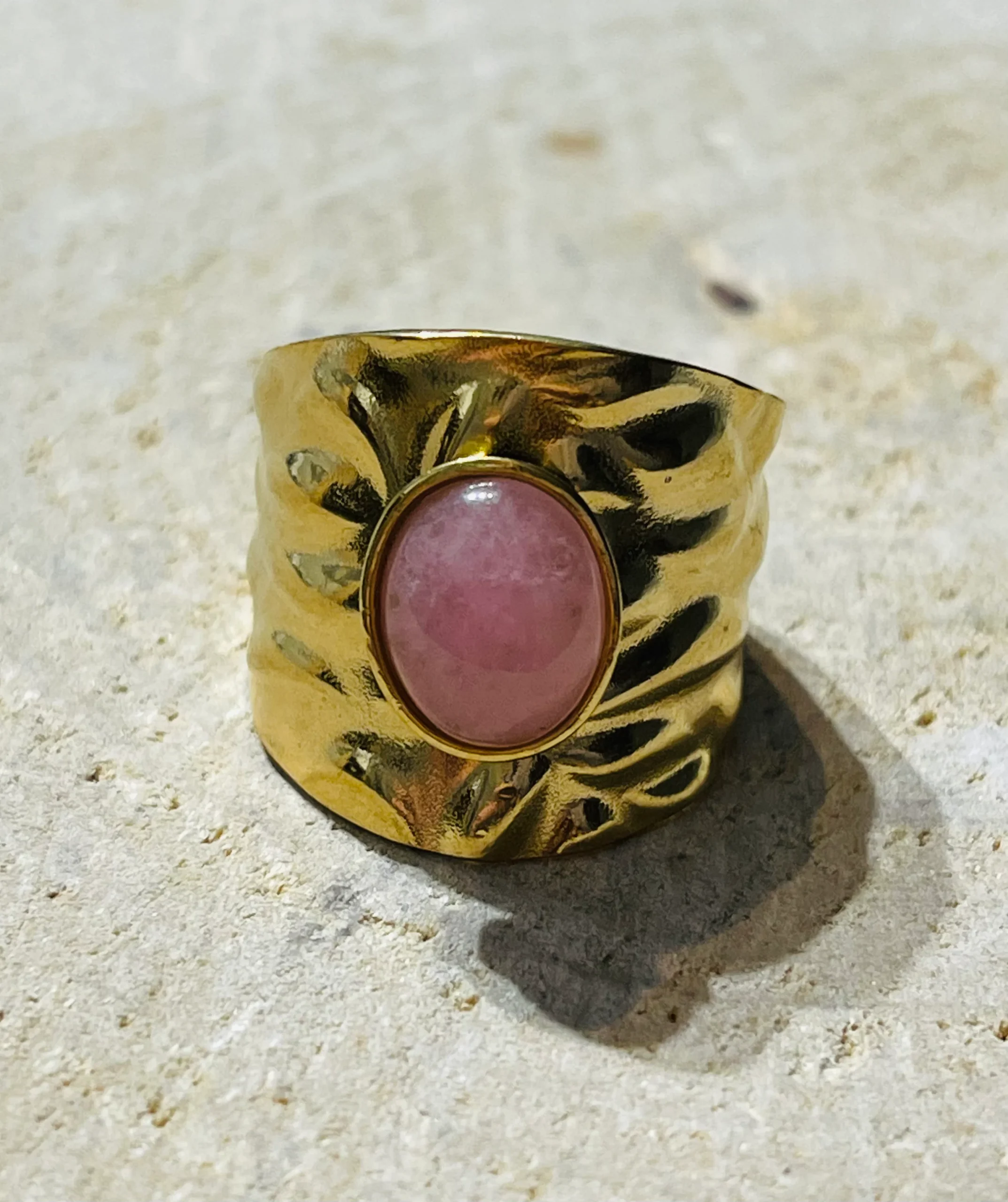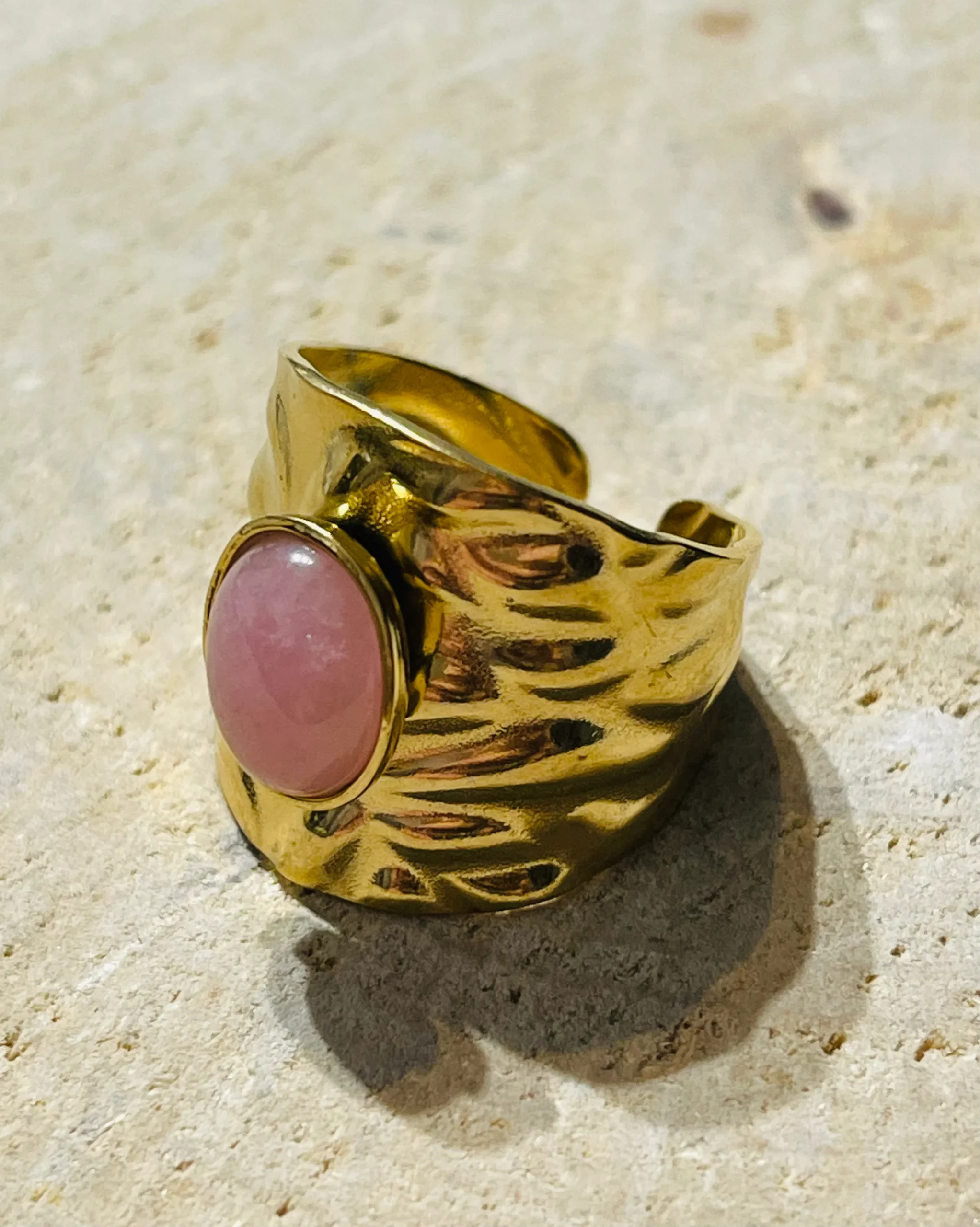 Bague sertie d’un Quartz rose cabochon. En acier inoxydable doré. Taille réglable 54-57 Hauteur : 20 mm. Très solide et de belle qualité.