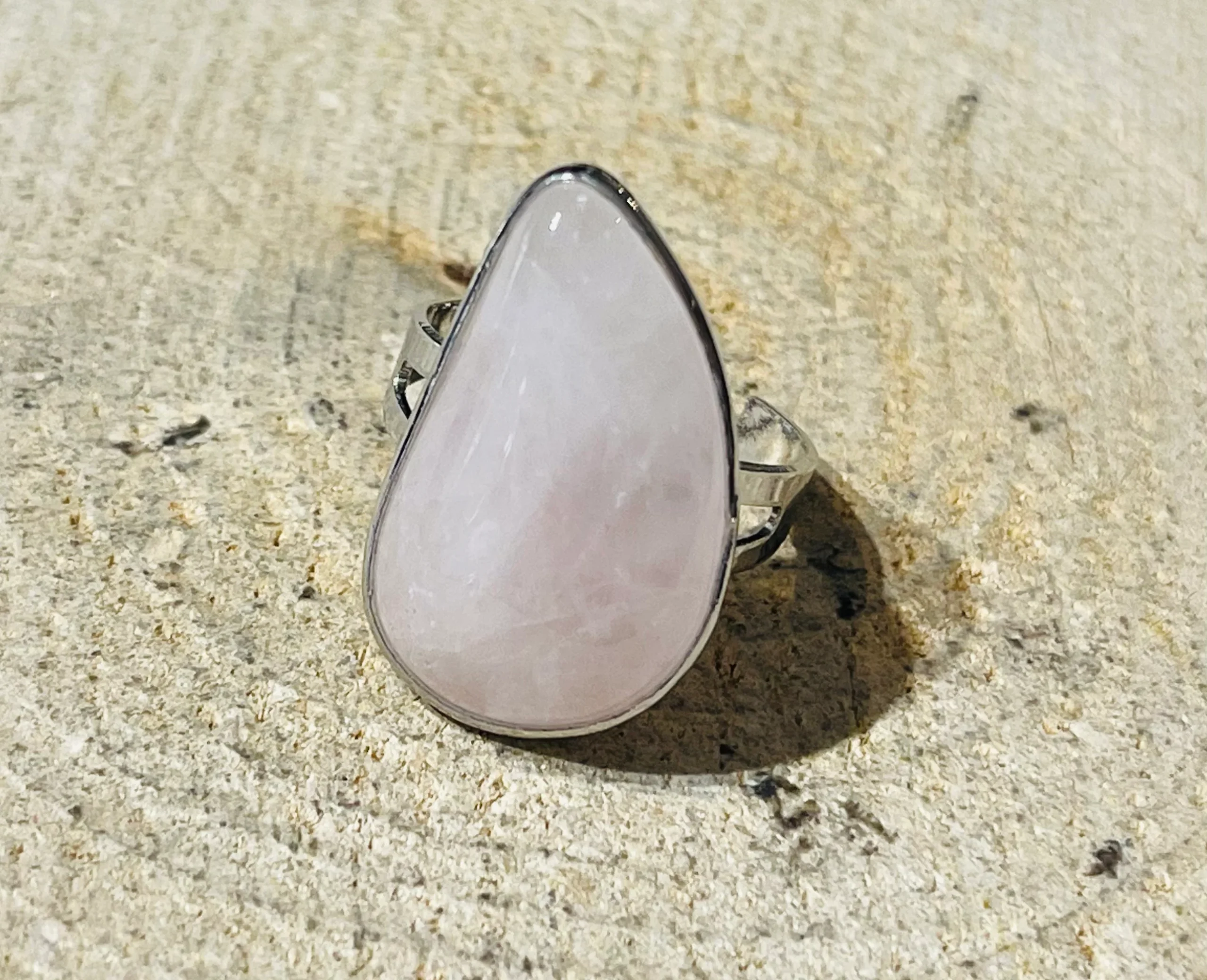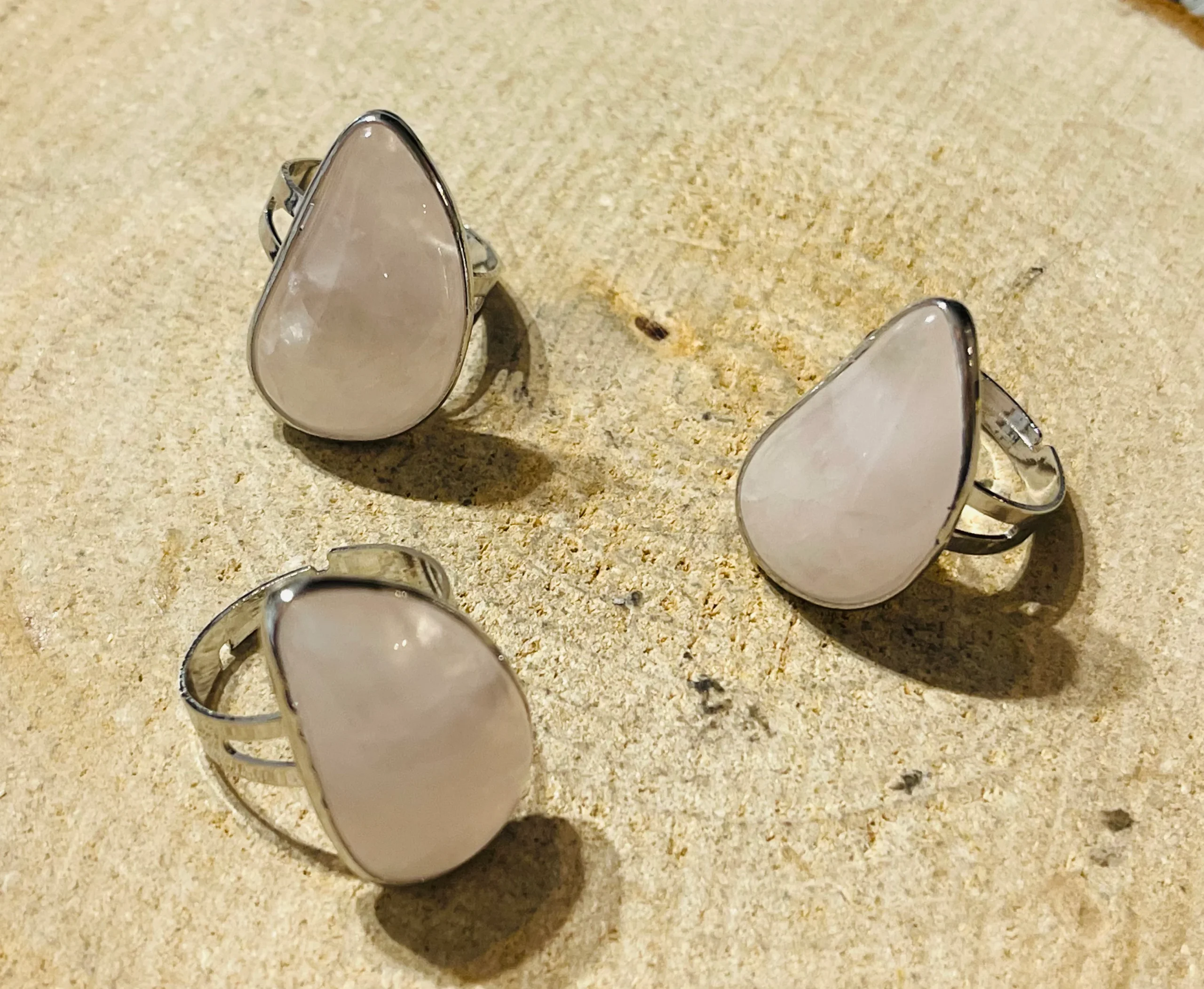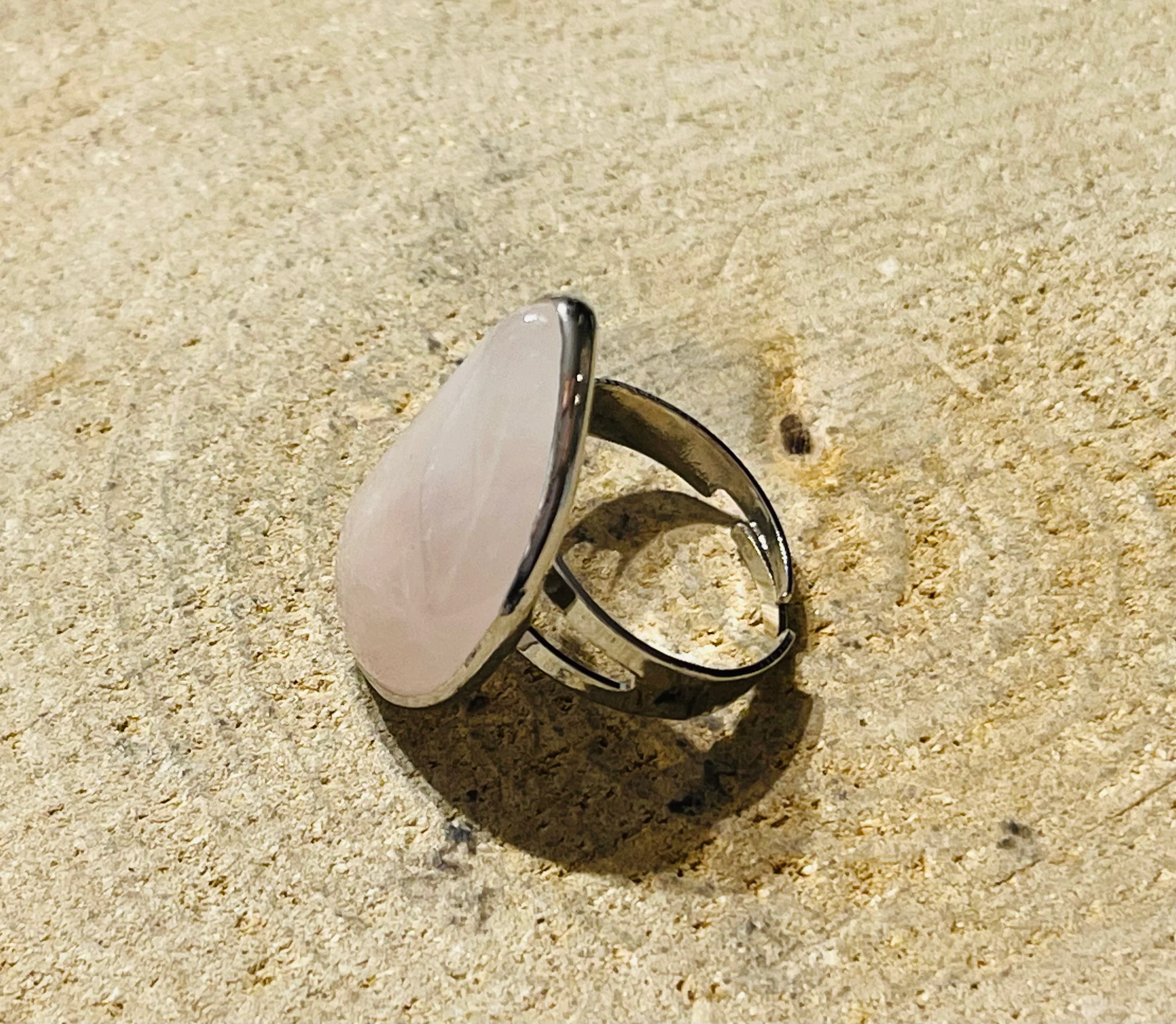 Il s’agit de bague sertie d’un cabochon en Quartz rose. En laiton argenté.Environ 2,6 x 1,8 cmTaille réglable 57-65