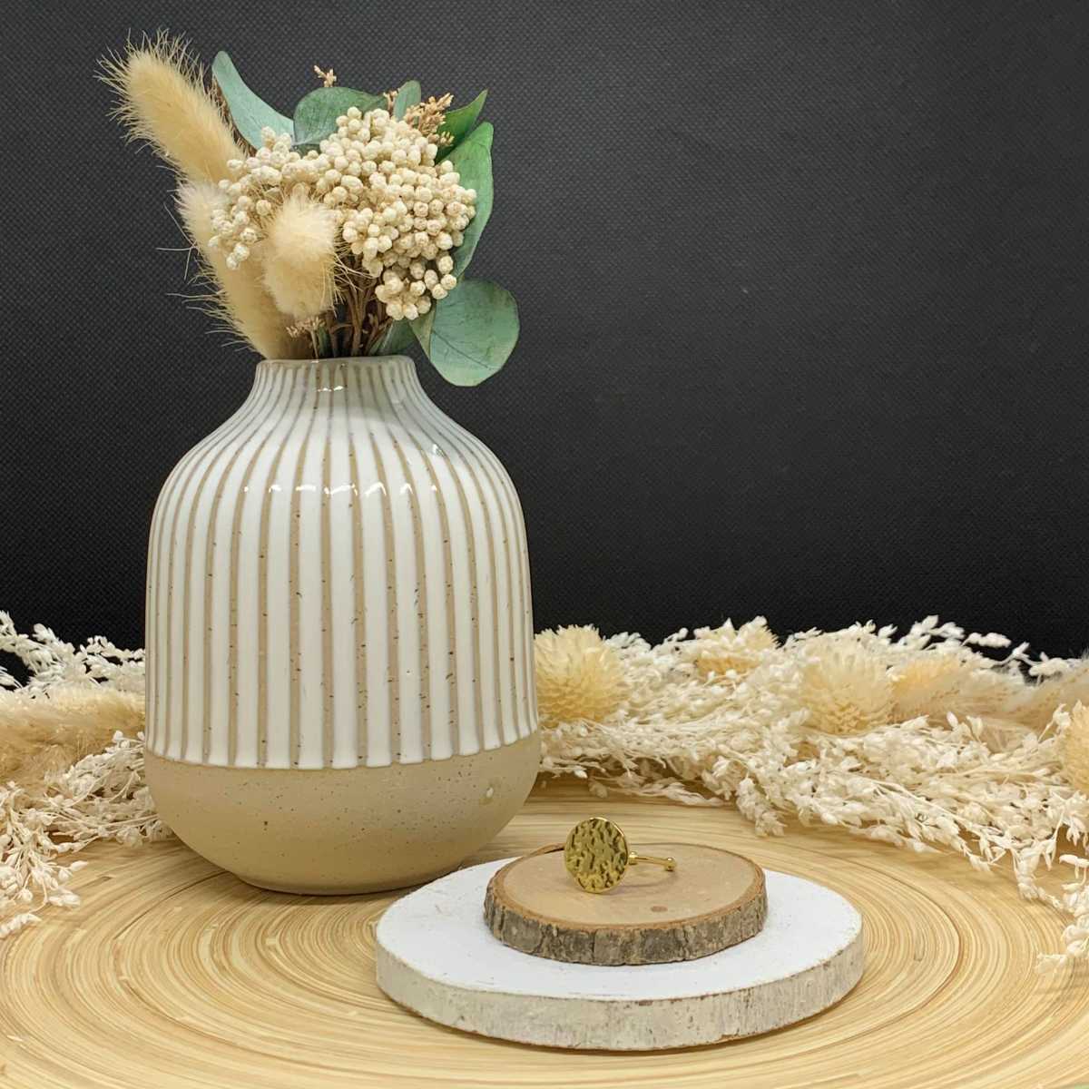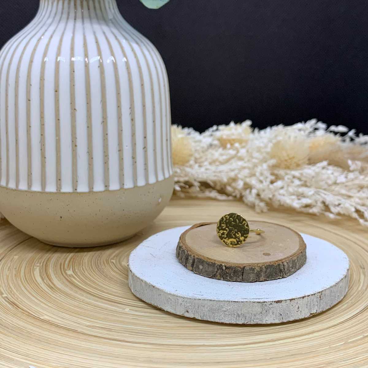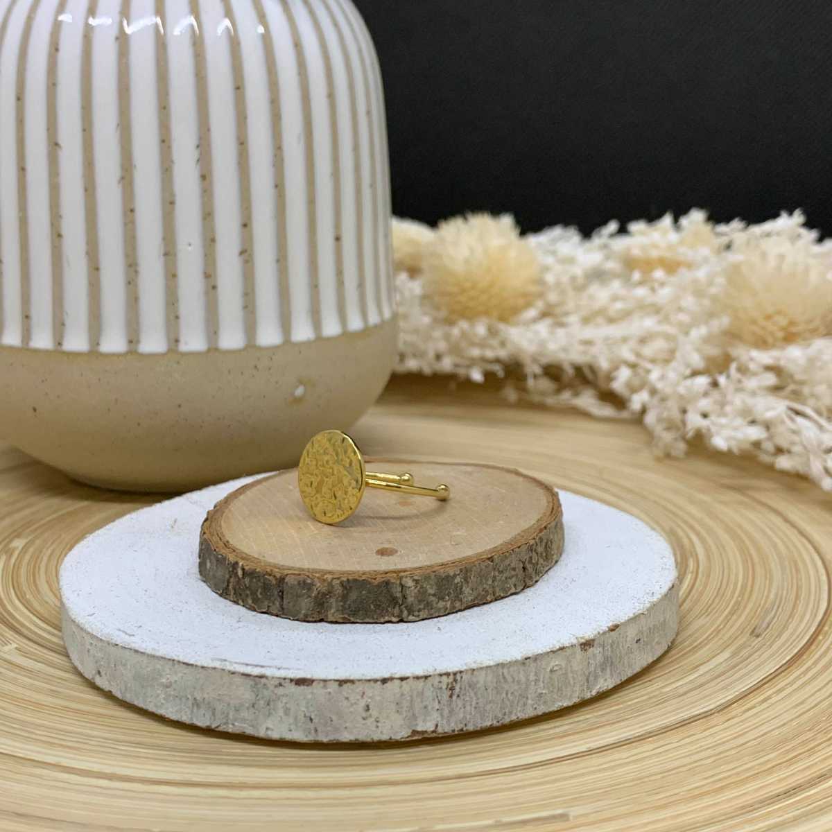 Bague dorée réglable en acier inoxydable. Jolie bague ornée d’un rond martelé très tendance. La bague sonia est une bague réglable, elle épousera parfaitement la forme de votre doigt.