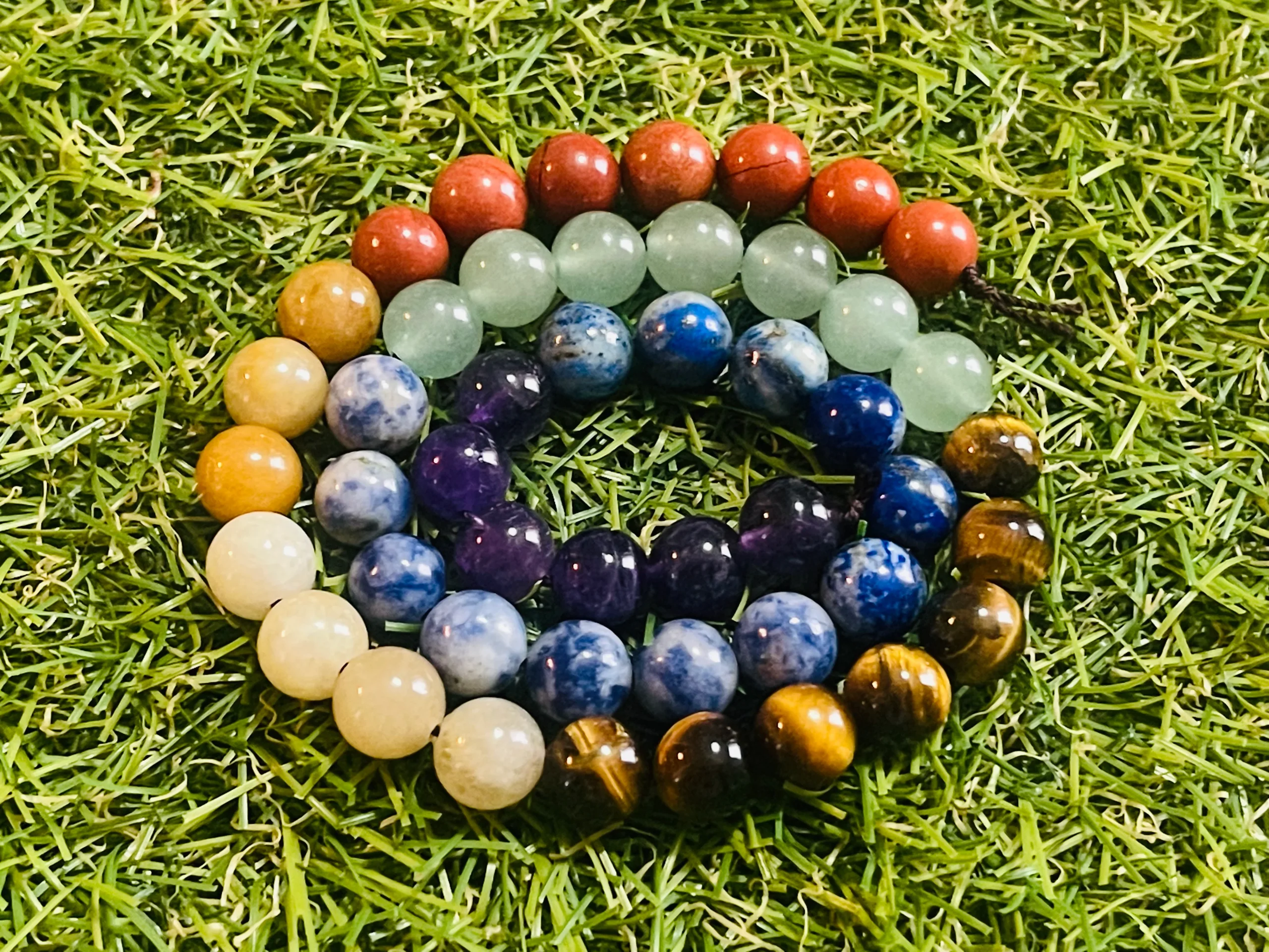 PERLES EN PIERRE NATURELLE 7 CHAKRAS. Il s’agit de perles en pierre naturelle véritable pour bracelet 7 chakras. Vendues en Fil de 40 cm environ.Disponible en 8 mm. Jaspe rouge (Racine). Aventurine jaune / orange (Sacré). Œil de Tigre (Solaire). Aventurine verte (Coeur). Sodalite (Gorge). Lapis-lazuli (3eme oeil). Améthyste (Couronne).