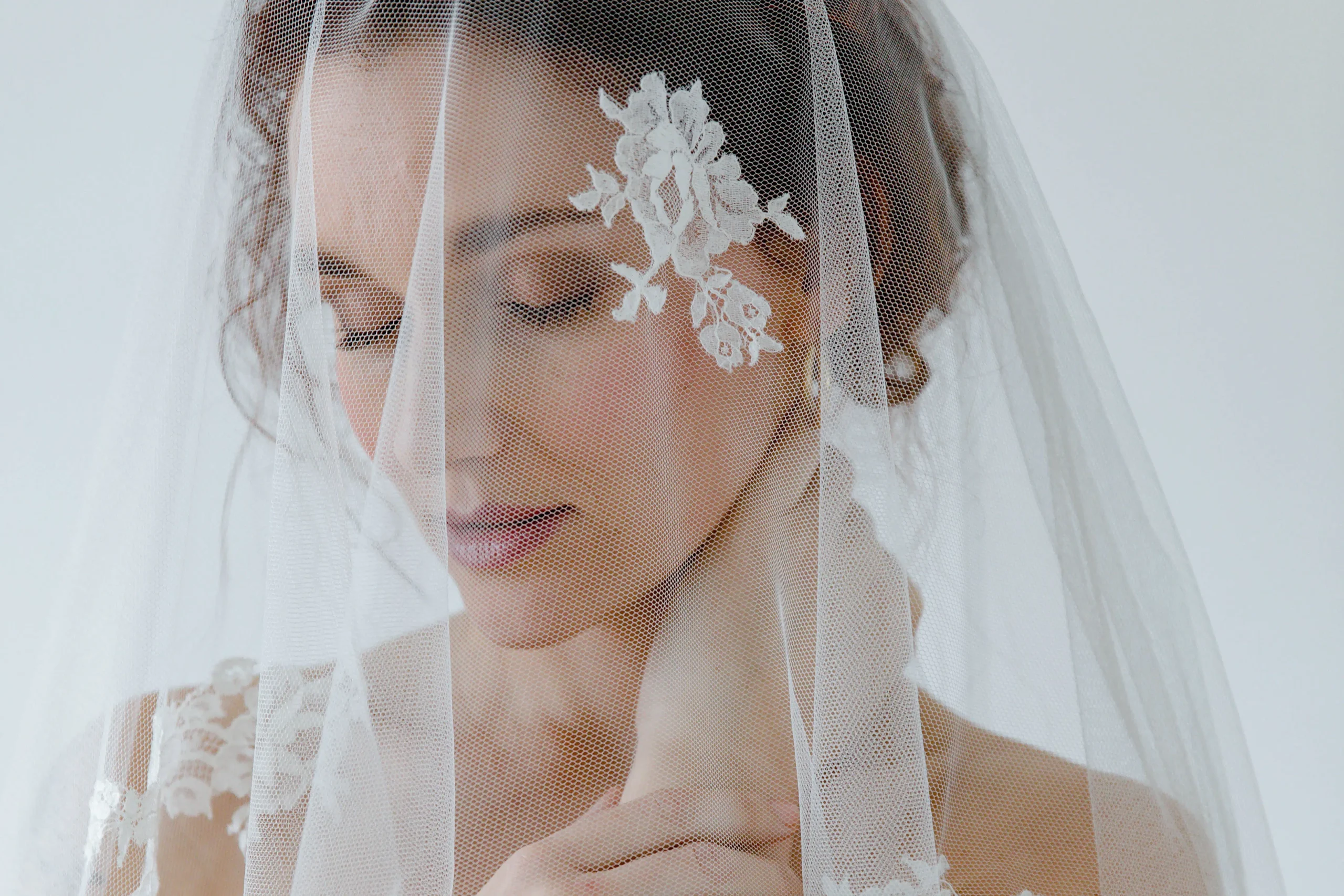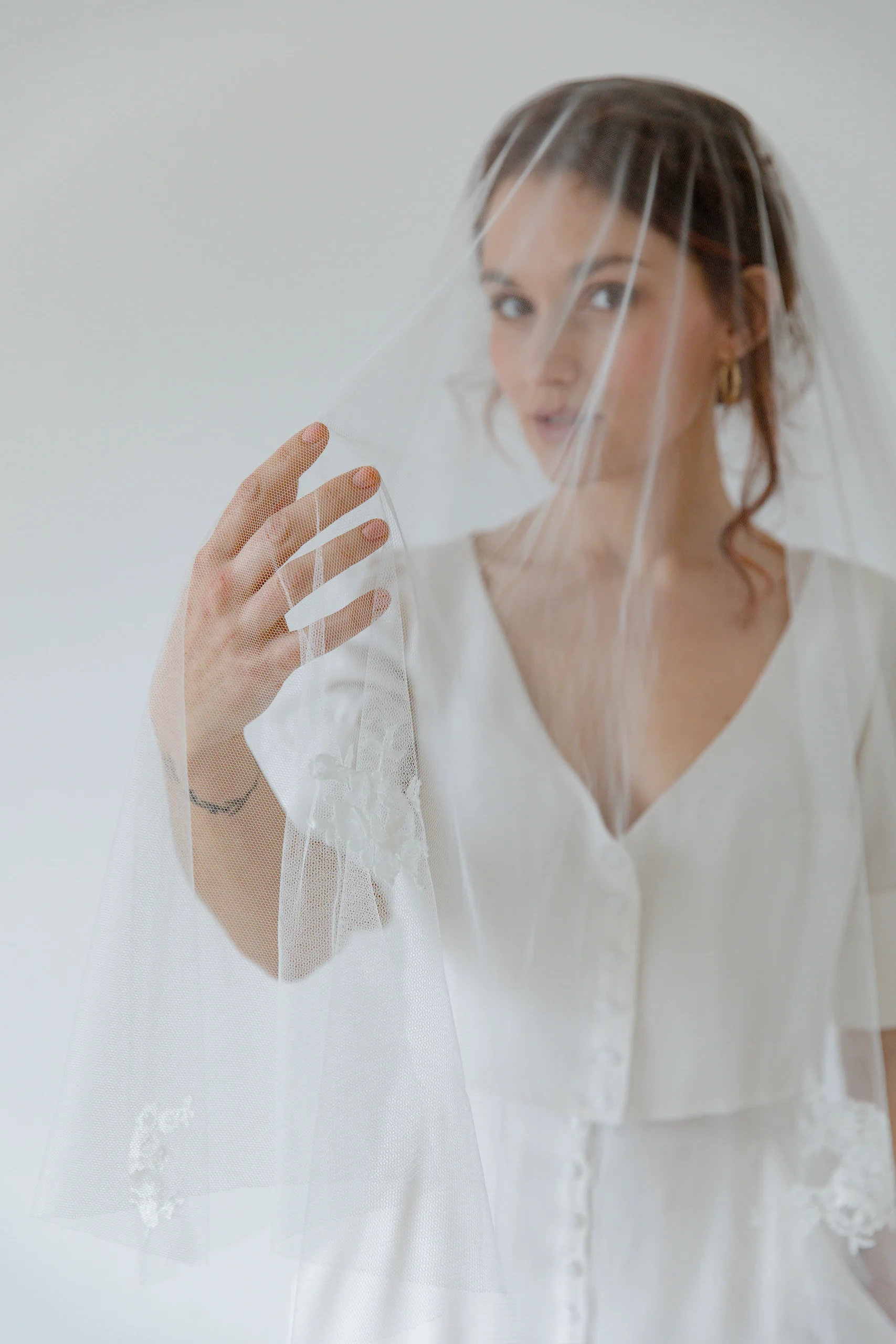 Voile de mariée en tulle, parsemé de délicates application de dentelle de calais découpée et cousu à la main. Un voile original pour complété votre look de mariée.