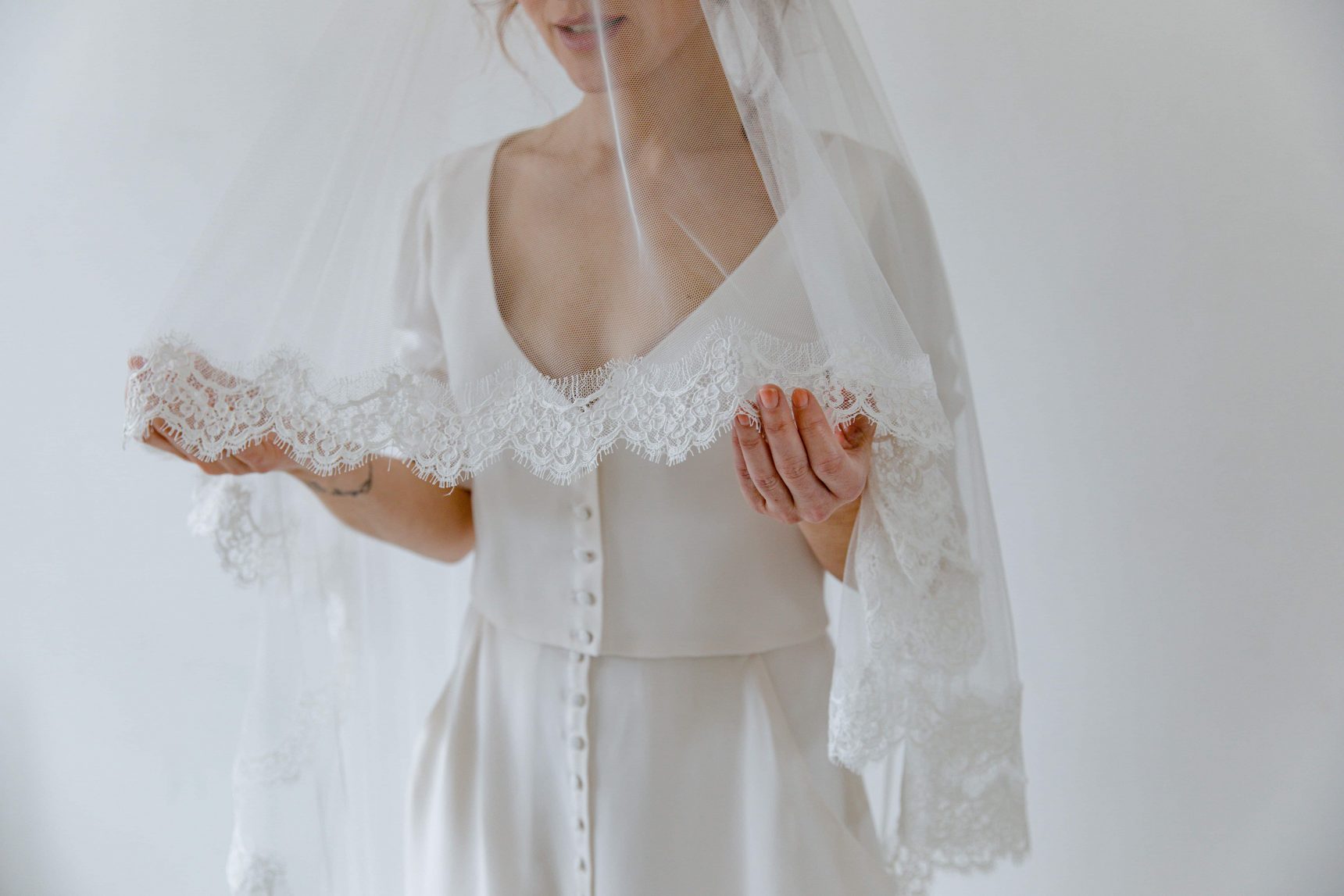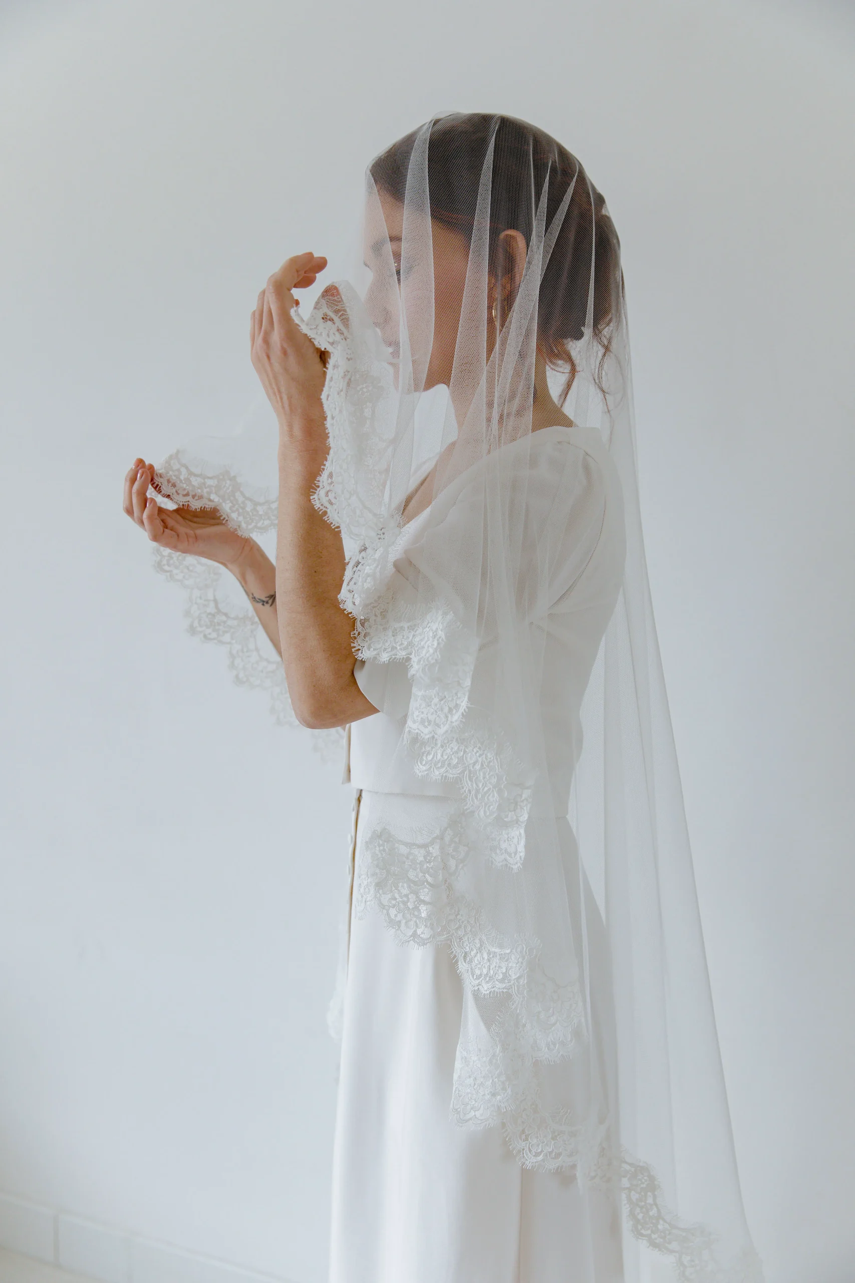 « Découvrez notre magnifique voile de mariée en tulle, une pièce maîtresse de votre tenue de mariage. Ce voile est confectionné avec soin, mettant en valeur sa délicate dentelle de Calais–Caudry® BIO (66%) festonnée, ornée de motifs floraux élégants. Cette dentelle exceptionnelle ajoute une touche d’authenticité et de sophistication à votre look nuptial.