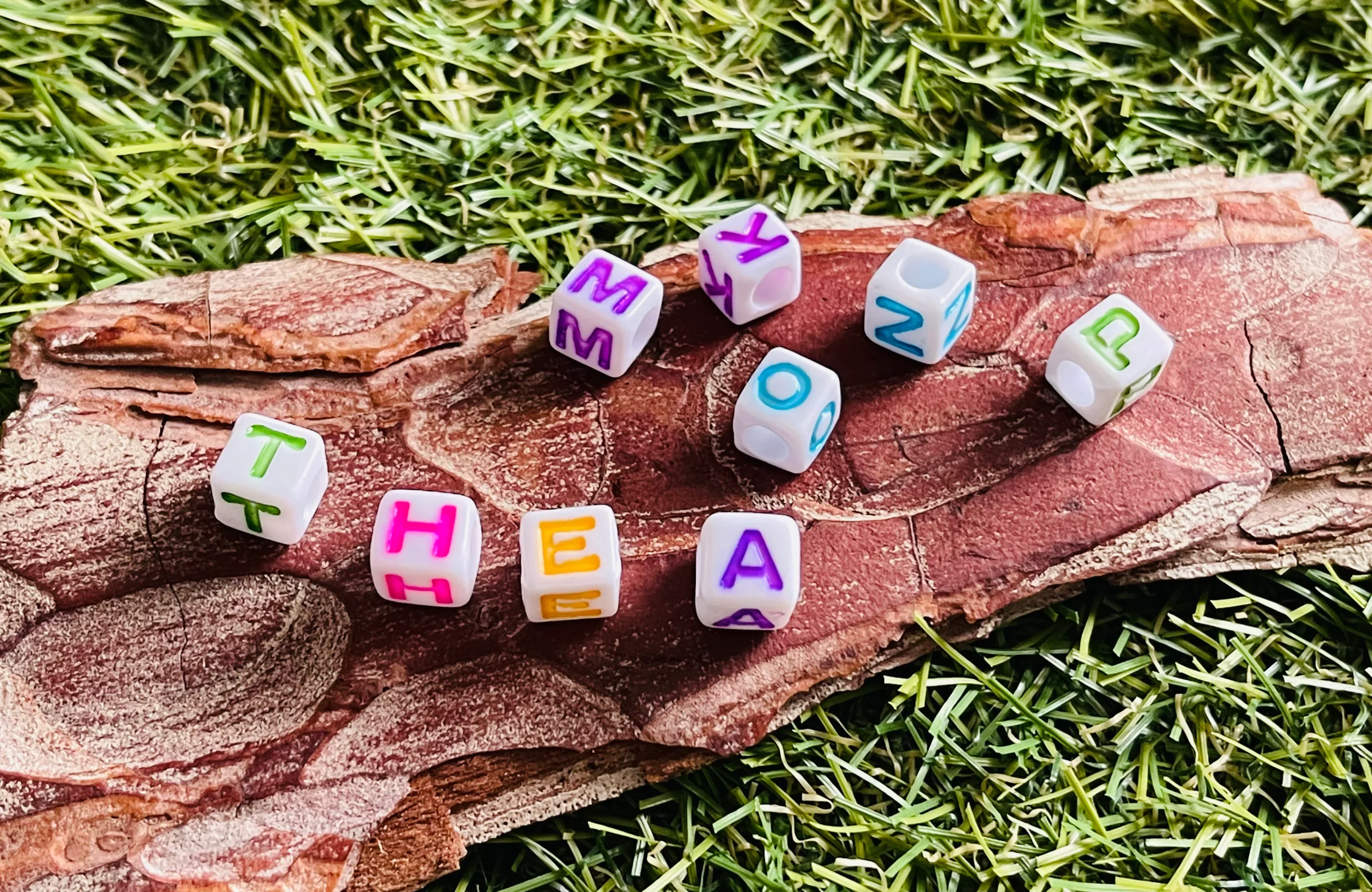 Lot d’environ 200 intercalaires Lettre cube pour bracelet. Lettre sur les 4 côtés en couleur. Lettres en vrac. Trou à l’horizontal. En acrylique.Dimensions : 7 x 7 mm.