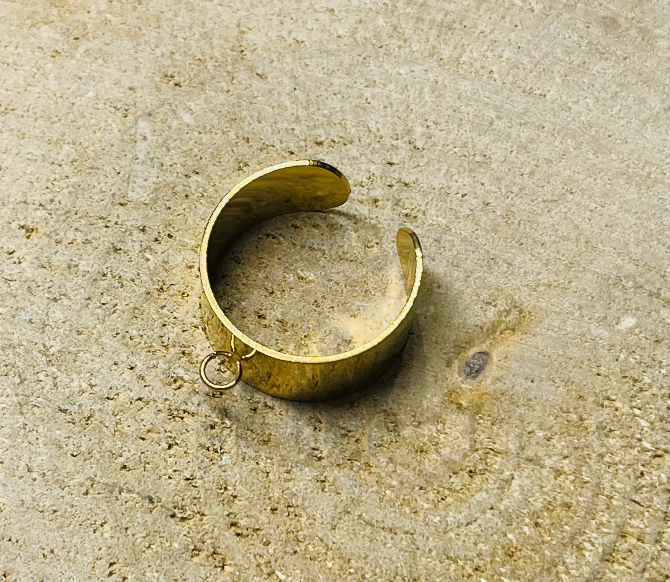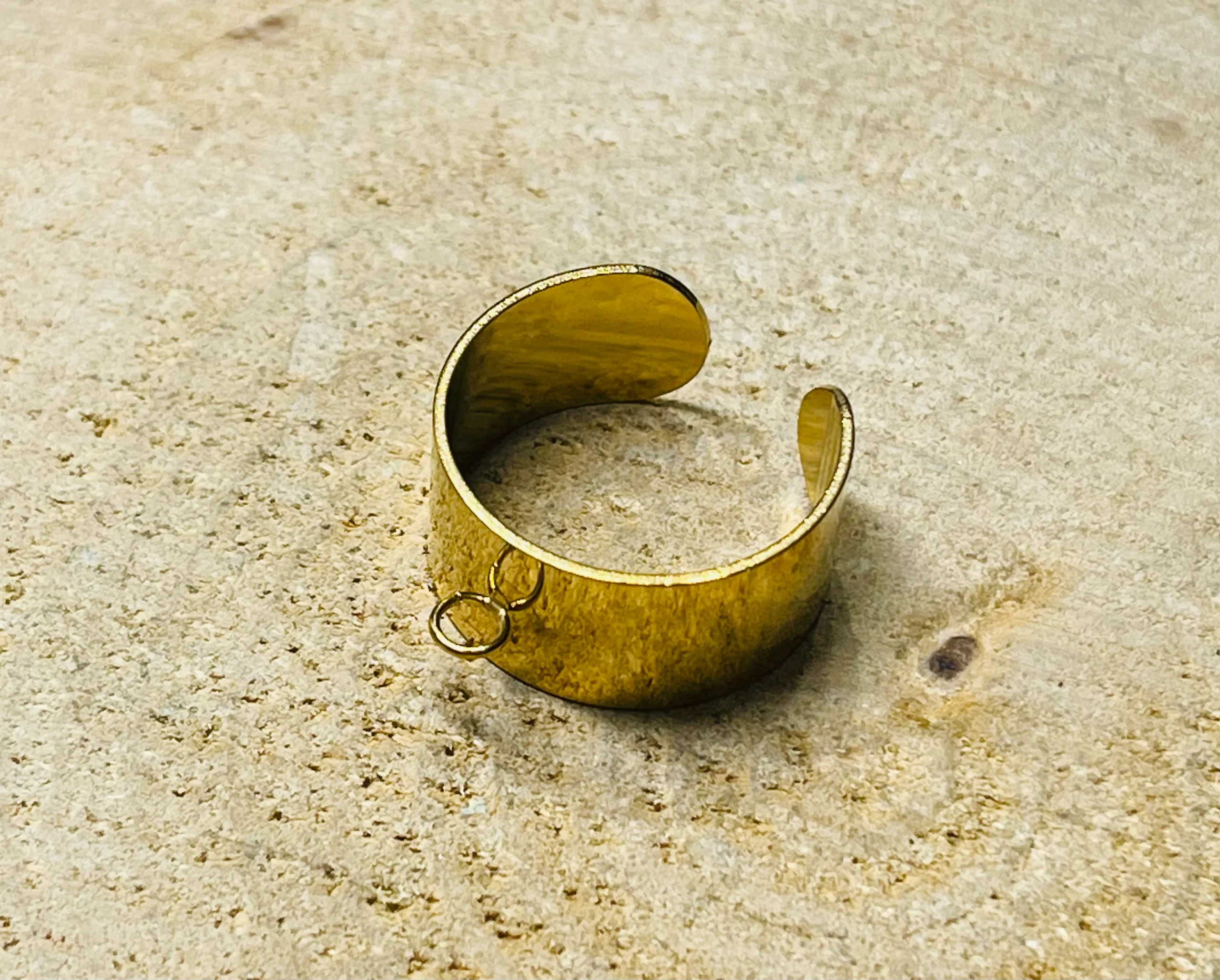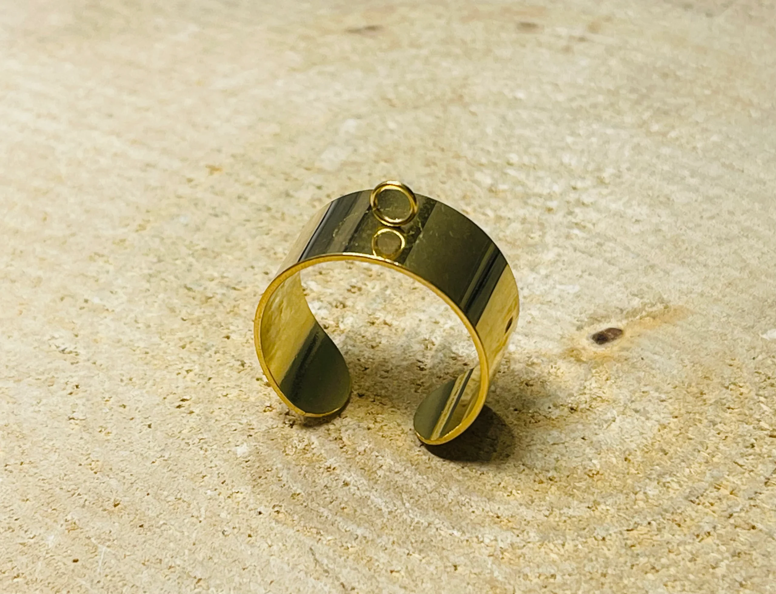 Il s’agit d’un lot de 5 bagues pour création. Taille réglable (57 à 61). En acier inoxydable doré. Hauteur : 10 mm