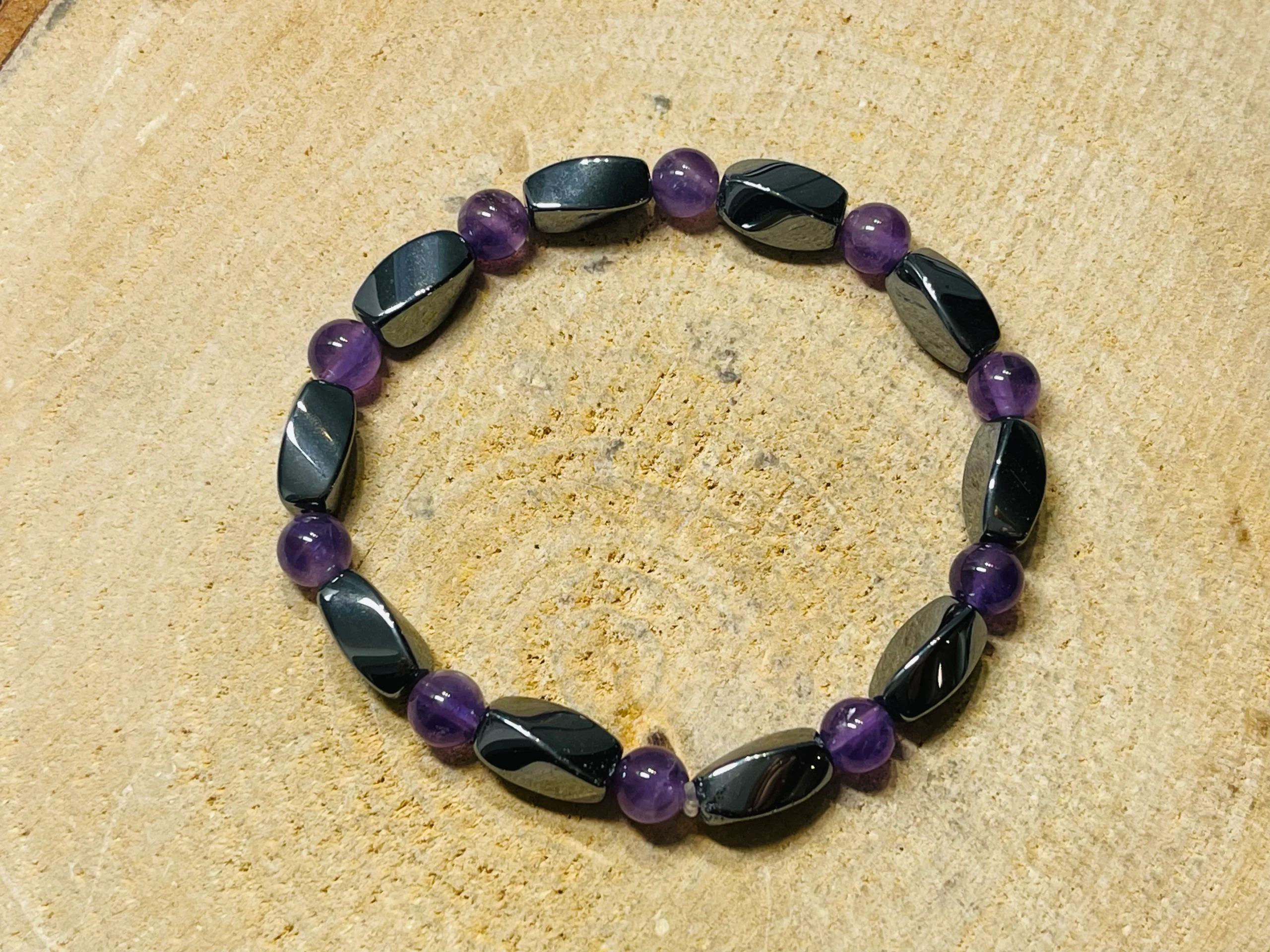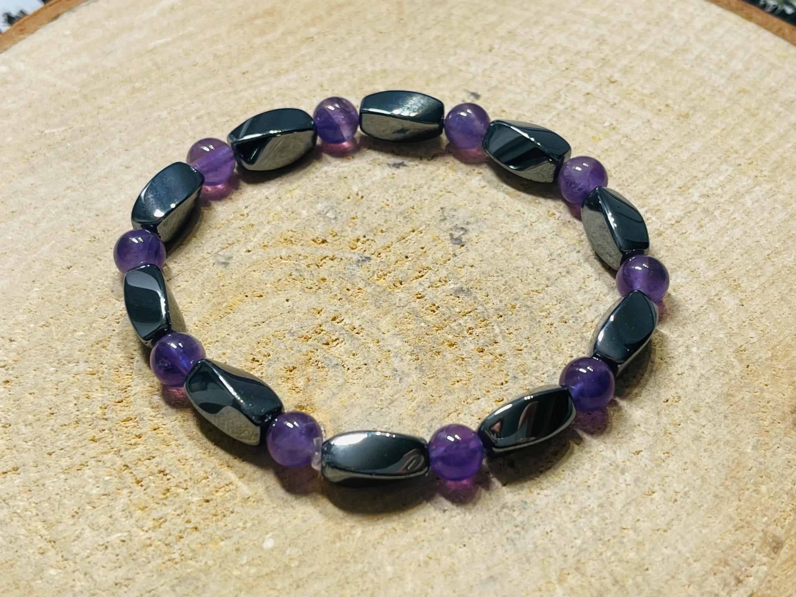 Il s’agit d’un lot de 5 bracelets en perles naturelles améthyste 6 mm et hématite synthétique torsion.