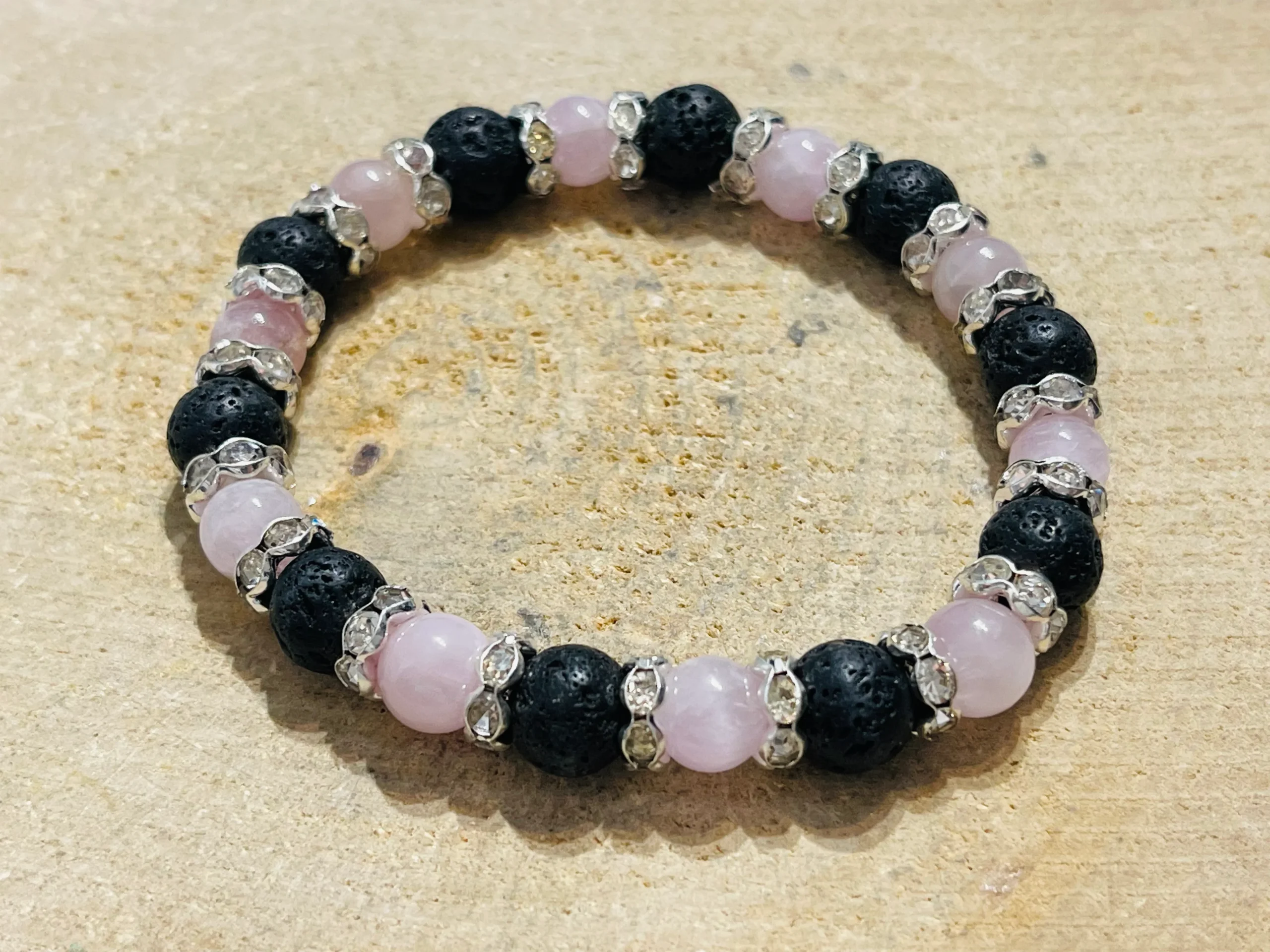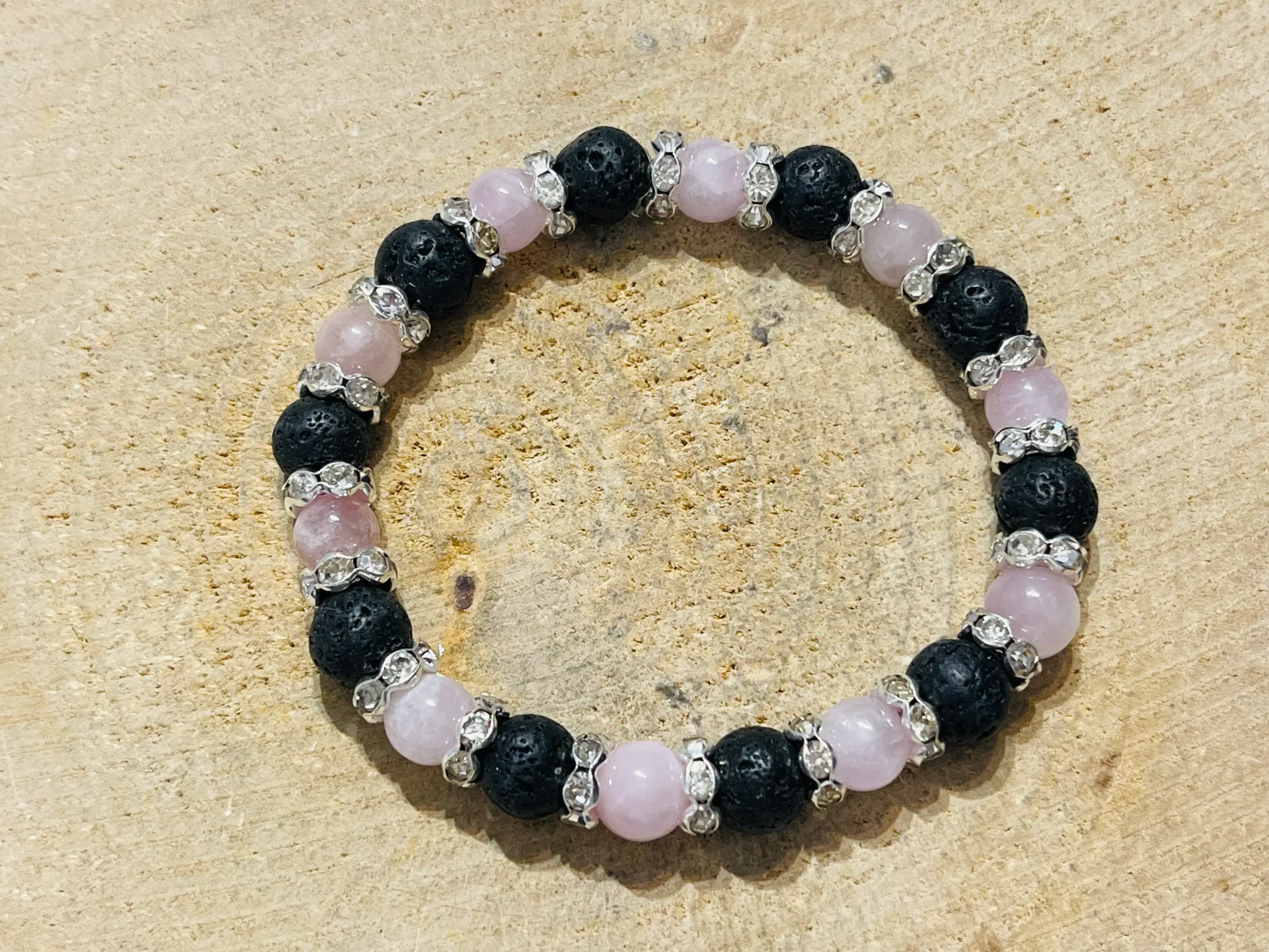 Il s’agit d’un lot de 5 bracelets en perles naturelles Kunzite et Pierre de lave 8 mm.