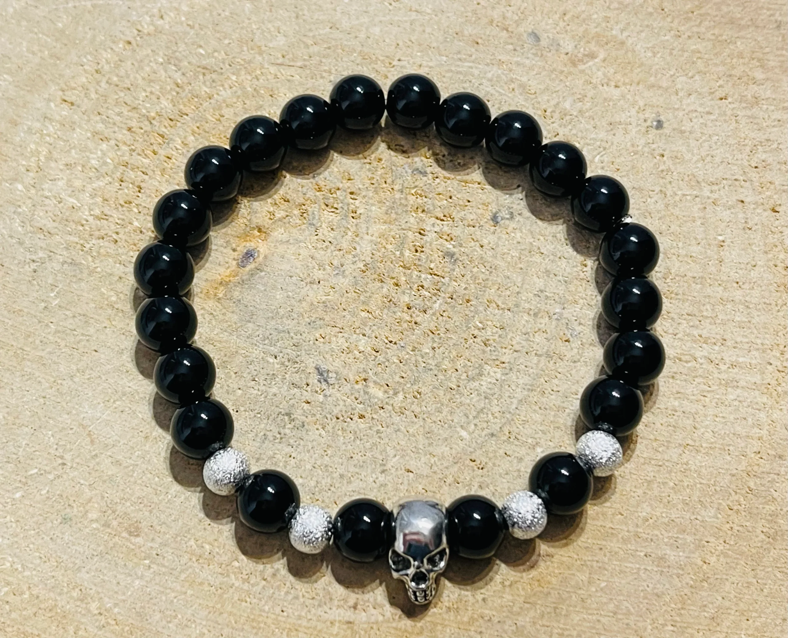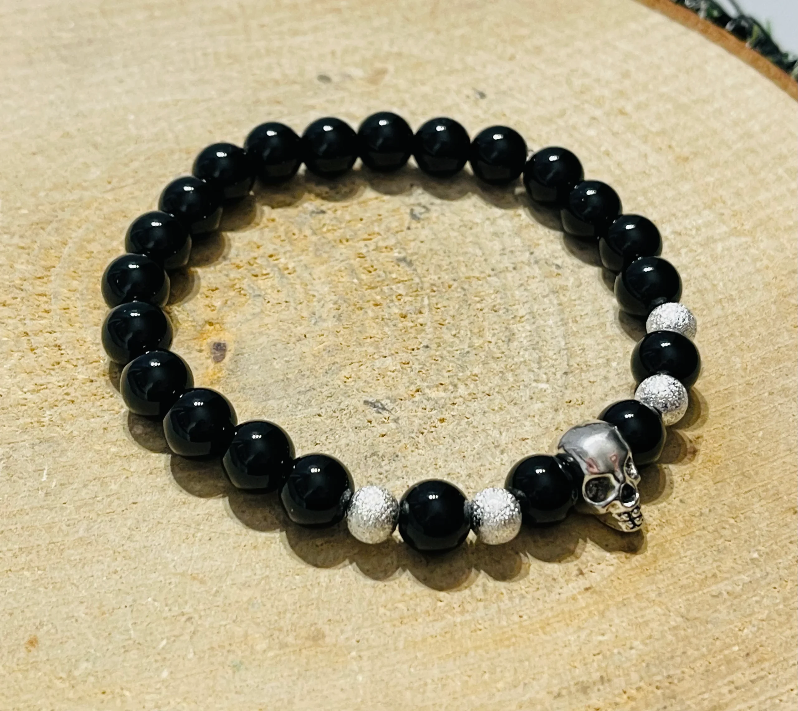 Il s’agit d’un lot de 5 bracelets en perles noires synthétiques 8 mm et tête de mort.