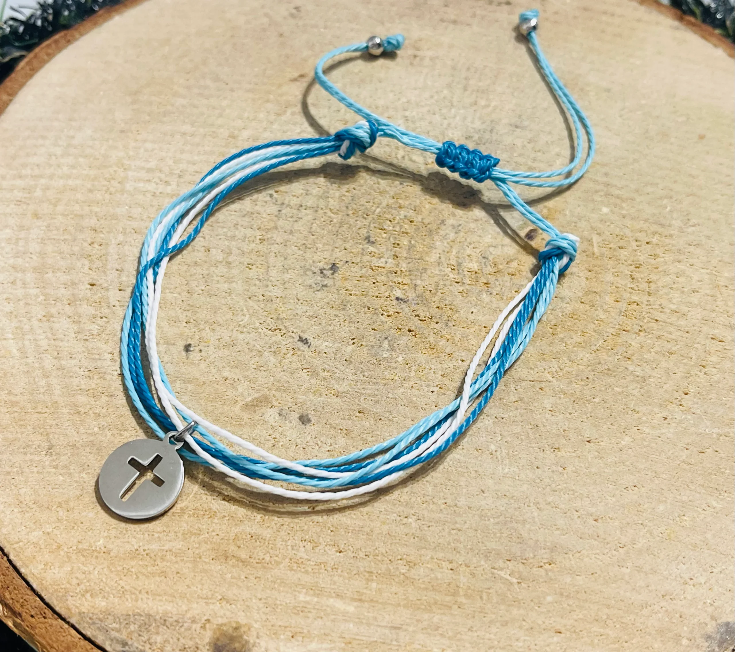 Lot de 5 Bracelets réglables en cordon ciré bleu et croix (55)