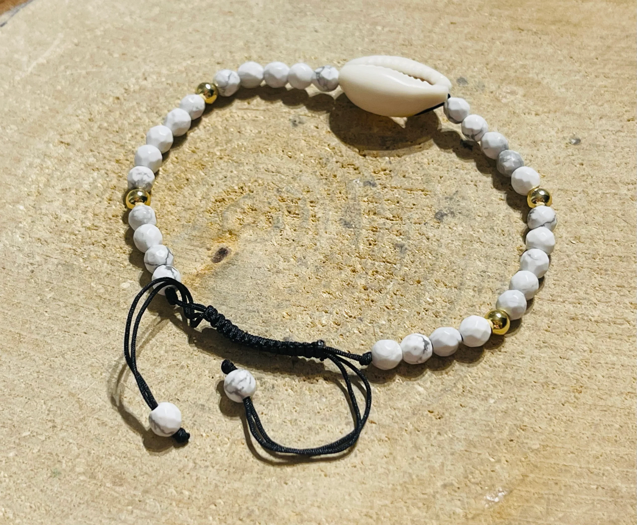 Bracelets en perles naturelles en Howlite facettée et Cauris.