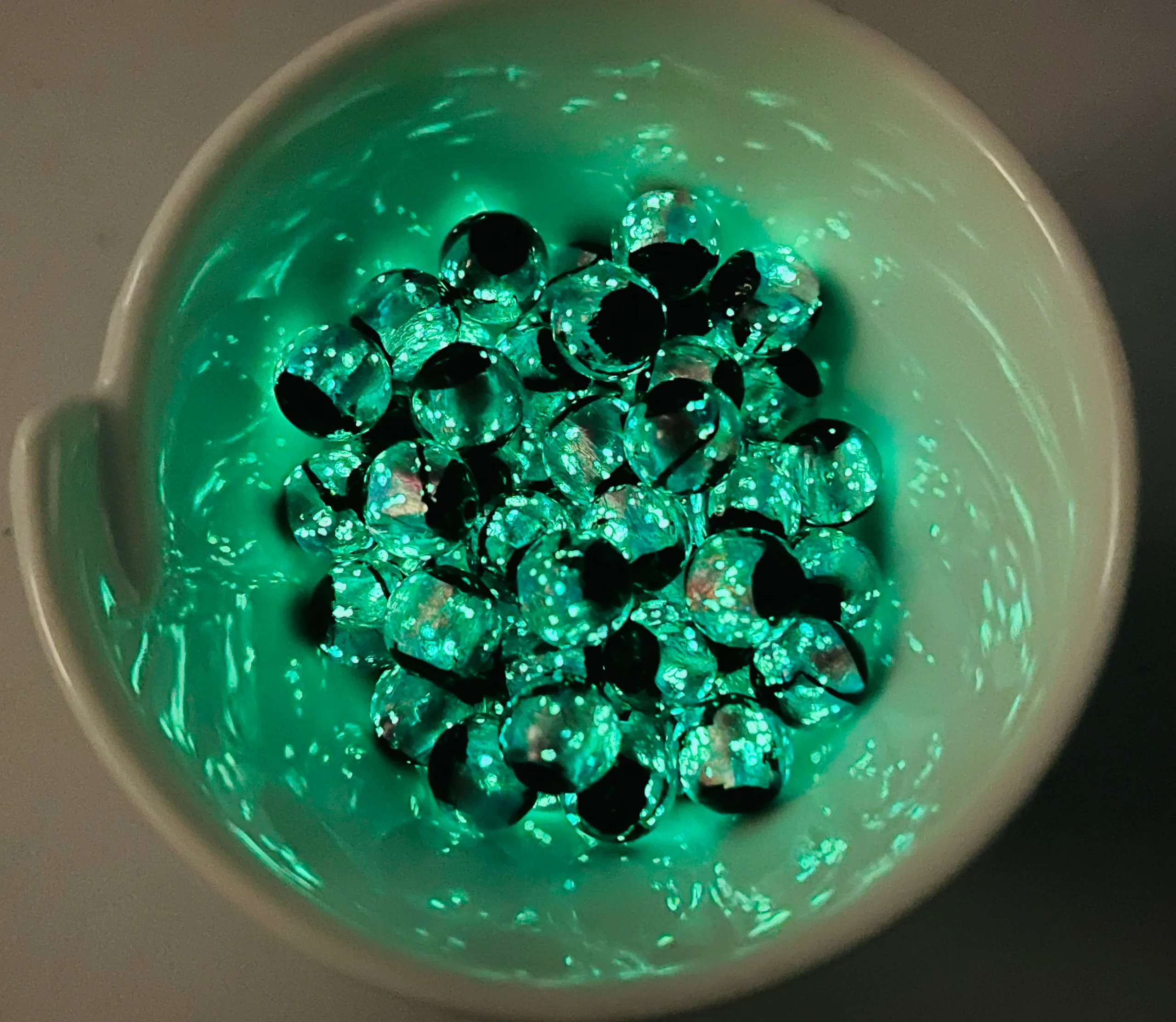 Dans la nuit ces perles deviennent phosphorescentes ce qui en font des perles rares car leur fabrication ne peuvent se faire qu’à la main.