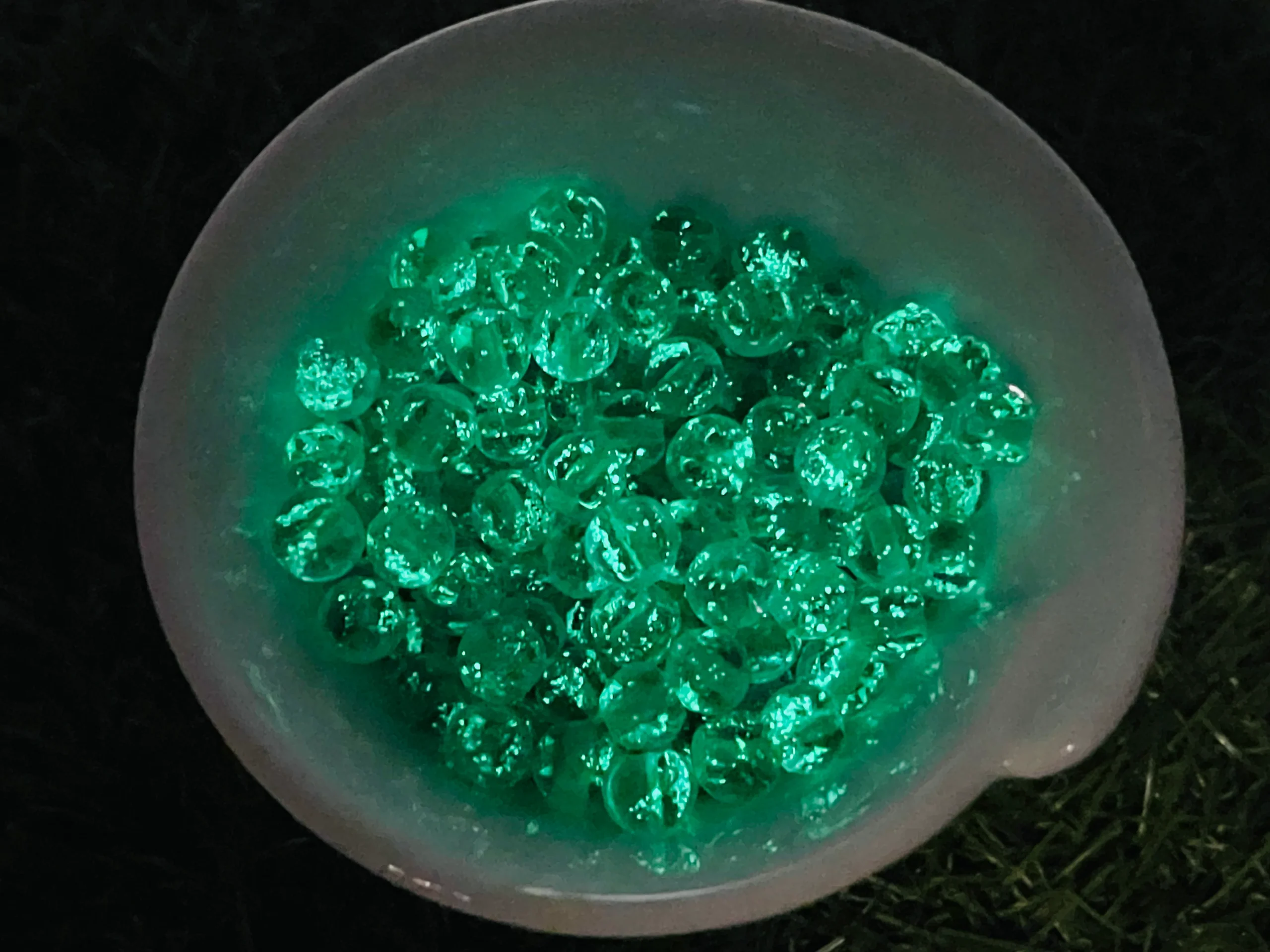 Dans la nuit ces perles deviennent phosphorescentes ce qui en font des perles rares car leur fabrication ne peuvent se faire qu’à la main.