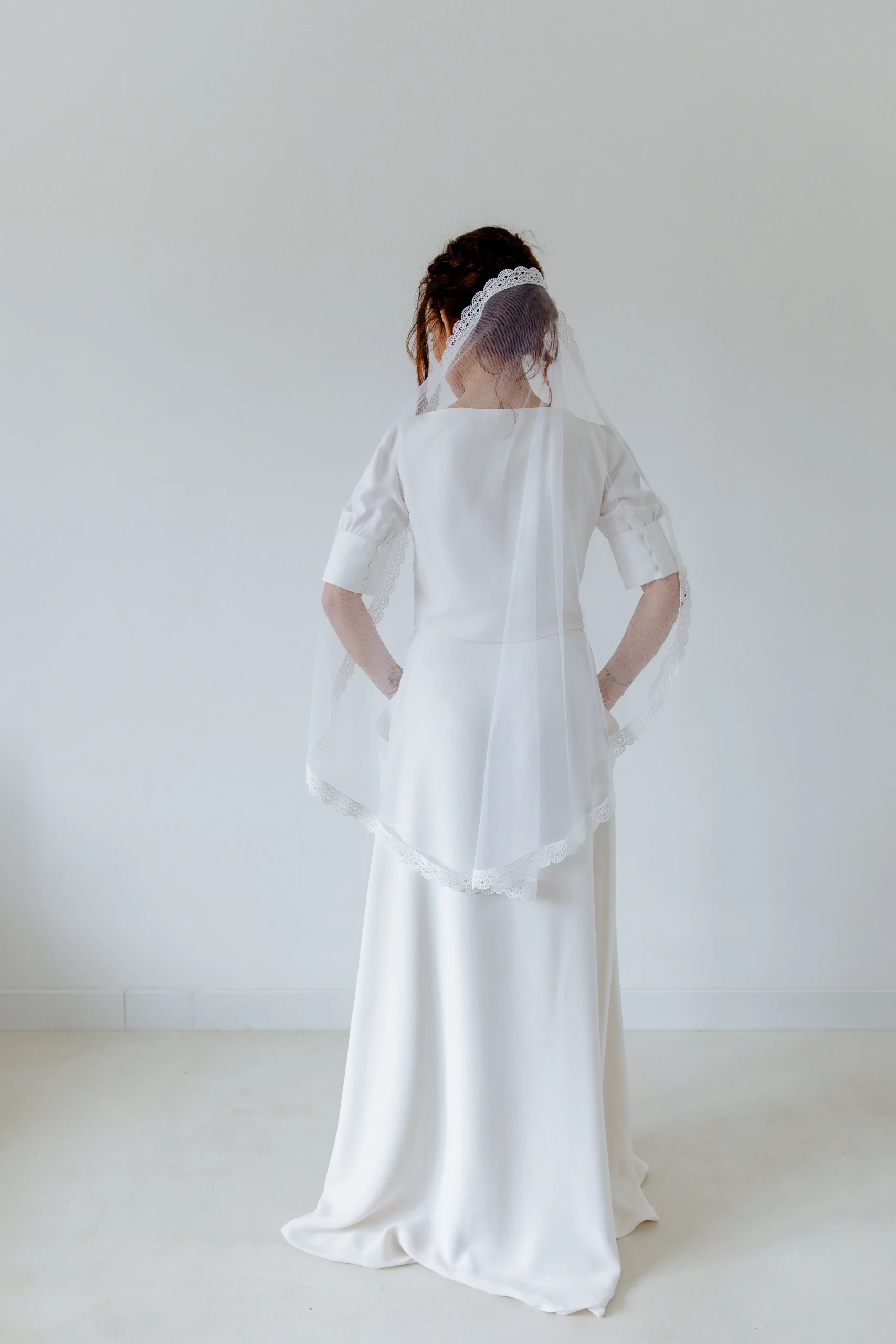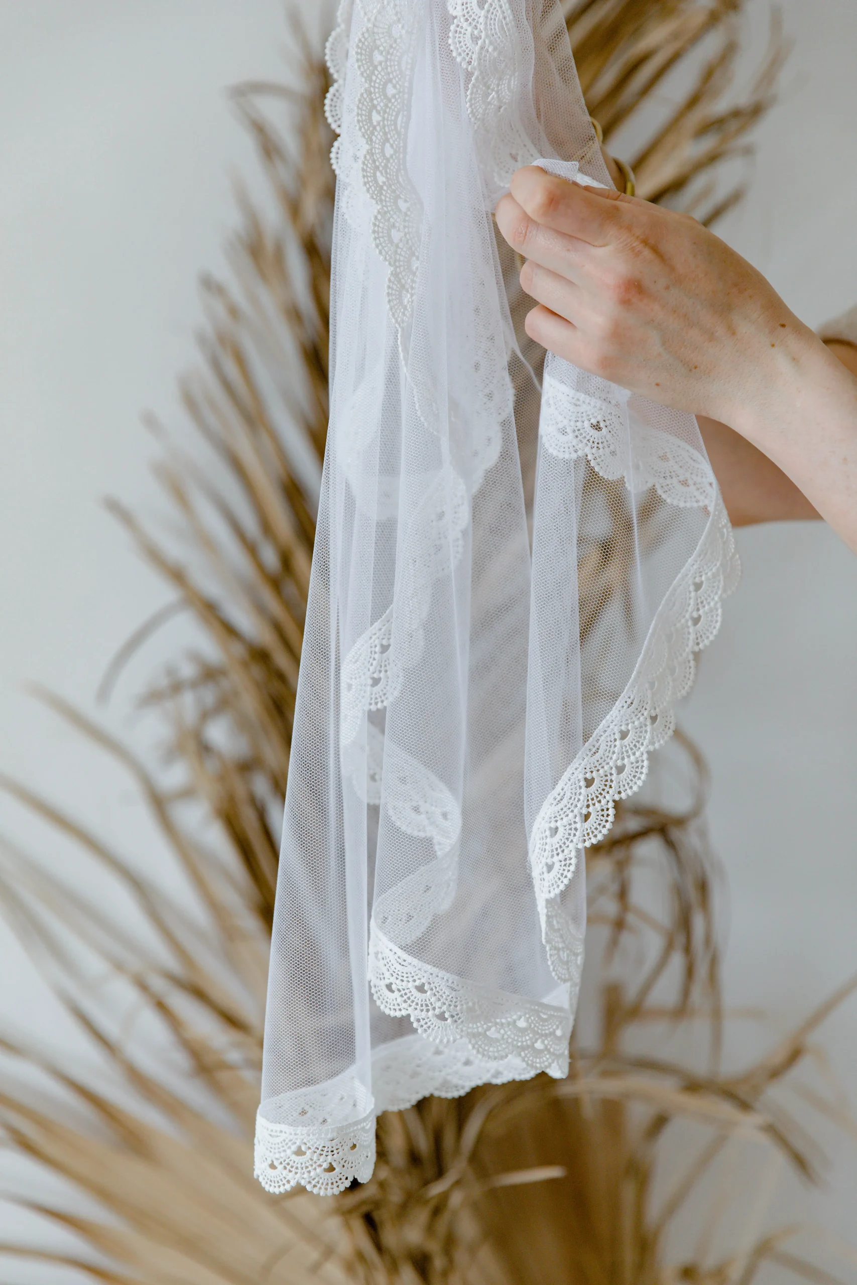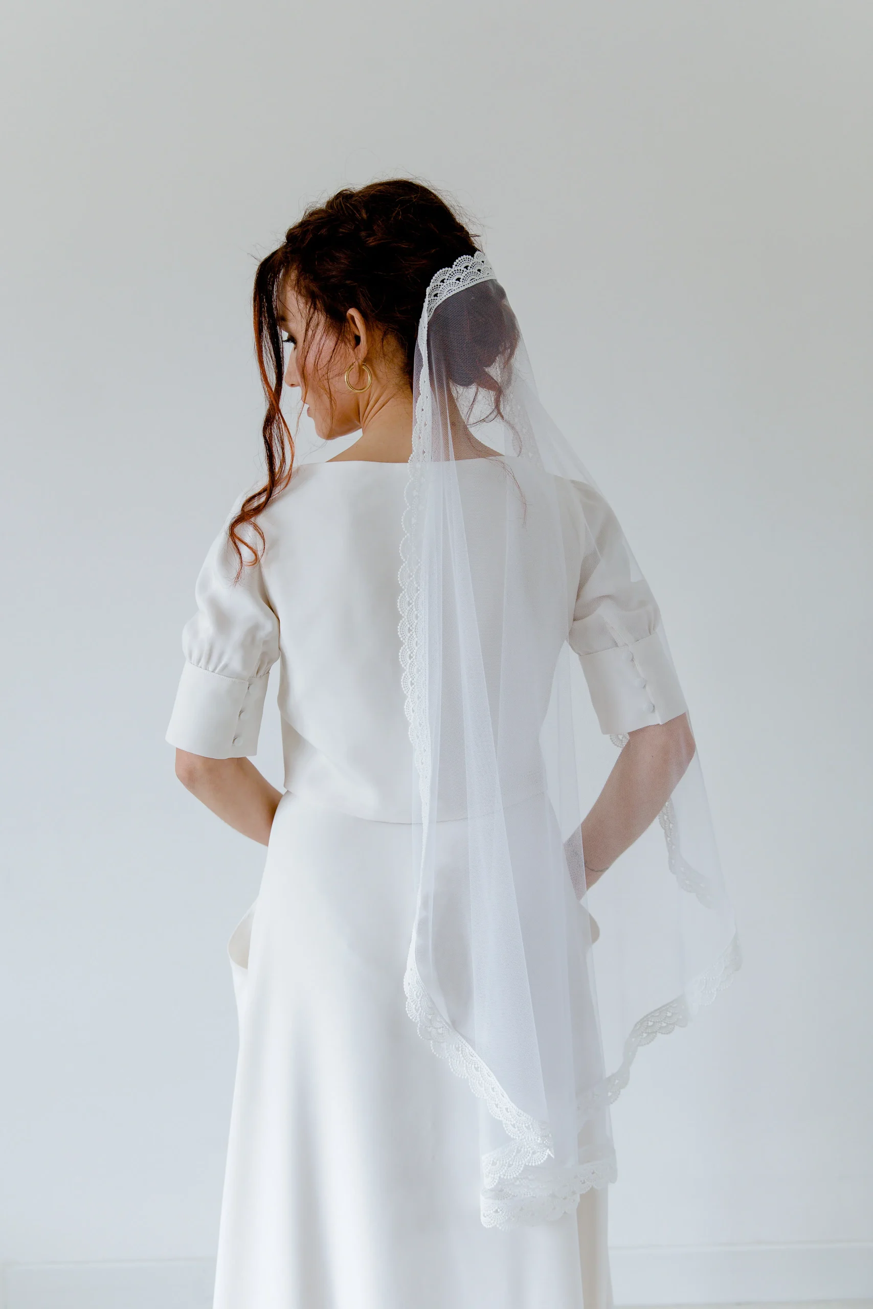 Découvrez notre élégant voile de mariée en tulle, subtilement rehaussé d’une délicate guipure. Son design moderne et transparent en fait l’accessoire parfait pour compléter divers styles de robes de mariée. Confectionné à 100 % avec des matériaux certifiés Oeko-Tex, ce voile est synonyme de qualité et de respect de l’environnement. De plus, il est fabriqué près de Nantes, garantissant une production locale de haute qualité.