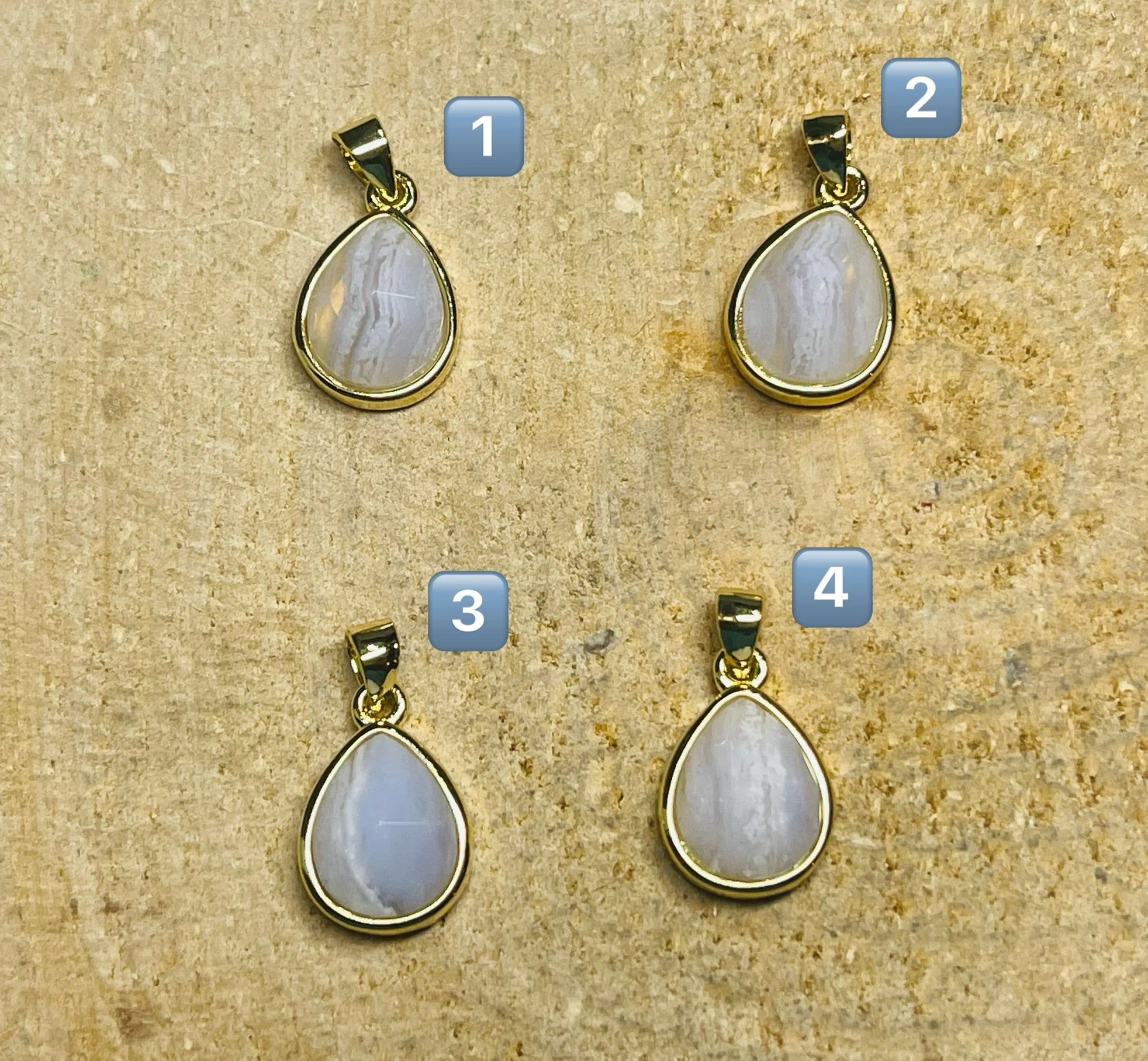 PENDENTIF EN CALCEDOINE. De forme goutte d’eau facetté. Bélière en laiton doré. Dimensions : 1,5 x 1 x 0,5 cm.