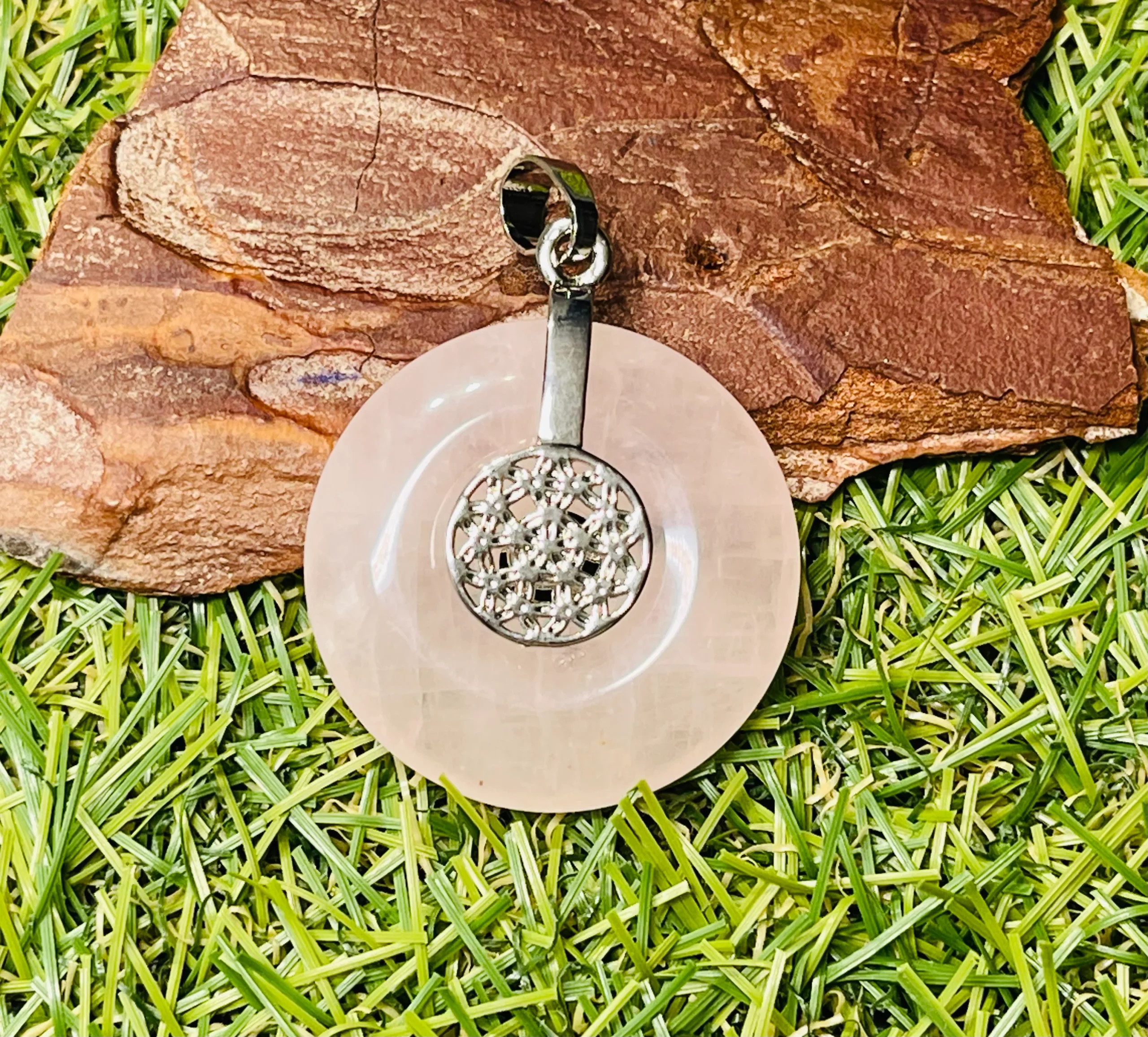 Il s’agit d’un pendentif donut / pi chinois en Quartz rose.Bélière en forme de fleur de vie en laiton argenté recto verso.Diamètre : 35 mm. Vertus : renforce les sentiments d’amour, la tendresse et adoucie les coeurs durs. Il est également porteur de paix.