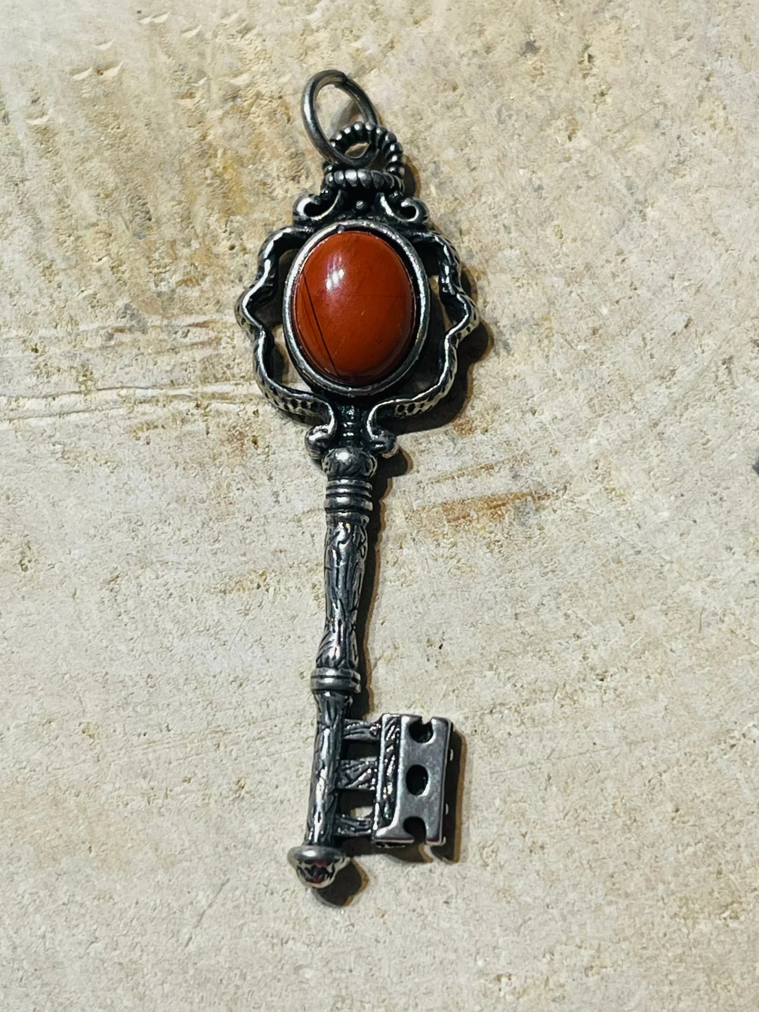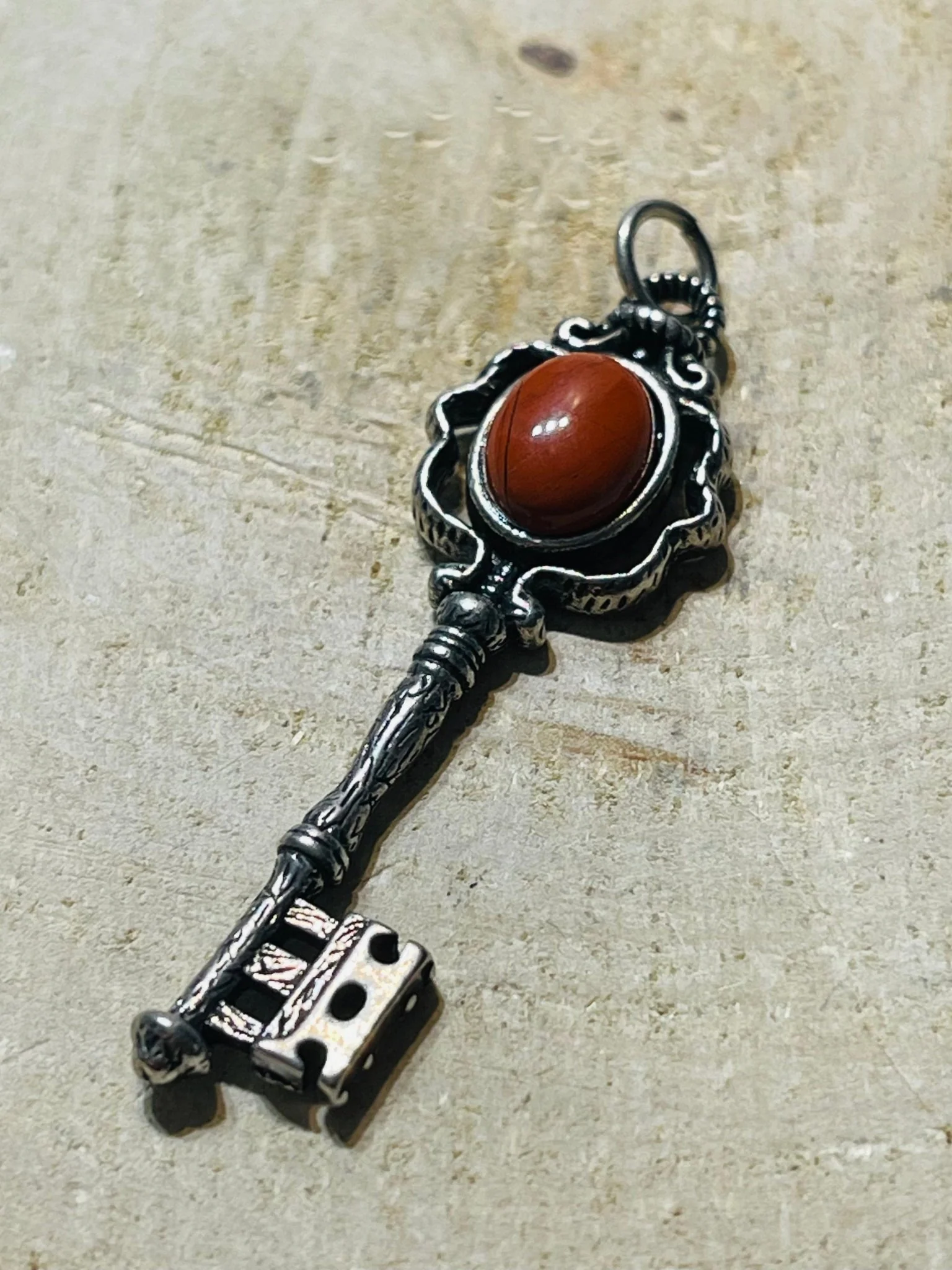 Pendentif en Jaspe rouge. En forme de clé. En laiton argenté. 53 × 17 mm. Chaque clé est différente selon le stock.