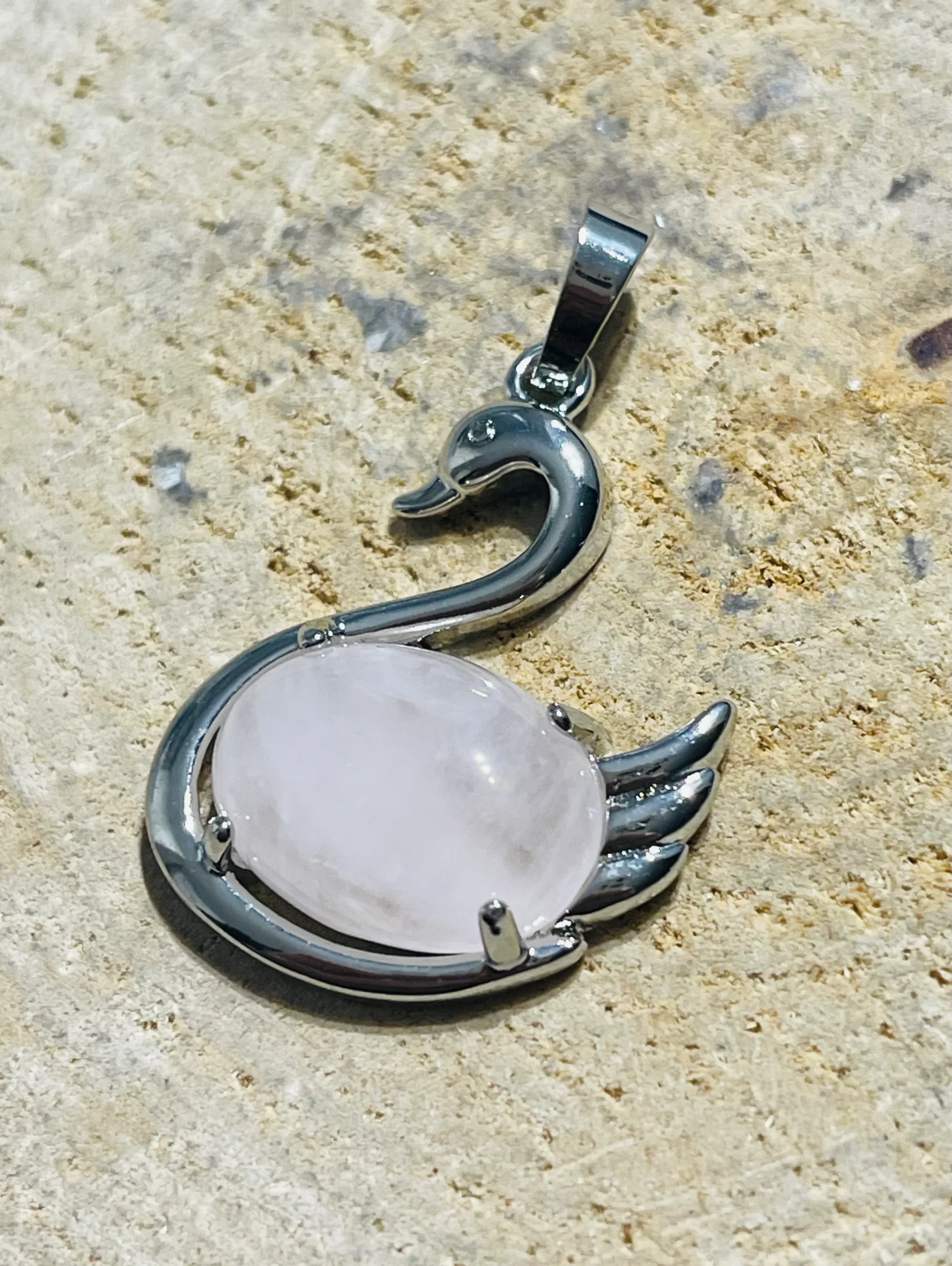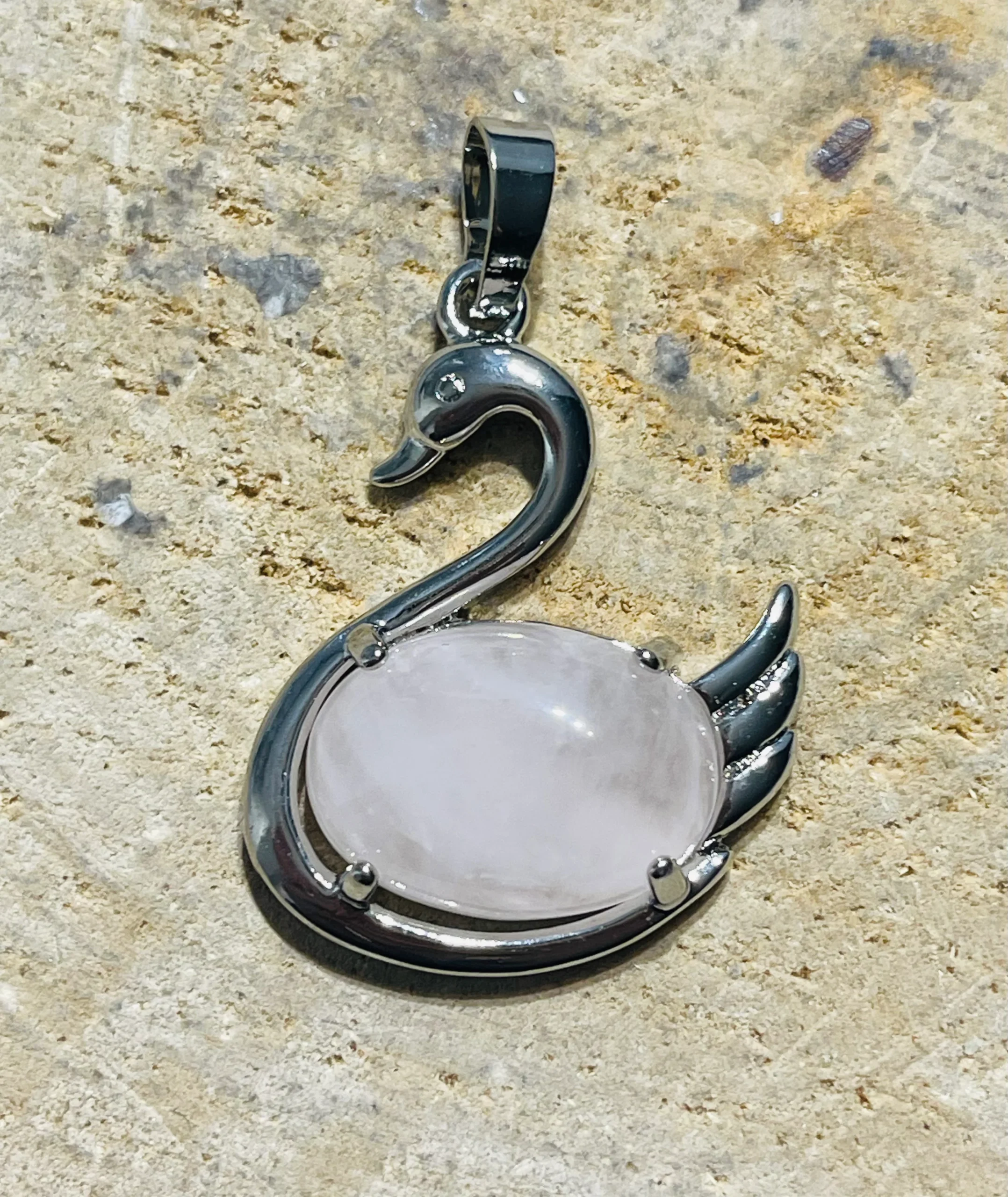 Il s’agit d’un Pendentif en Quartz rose en forme de cygne. En laiton argenté. 32 × 25 mm.