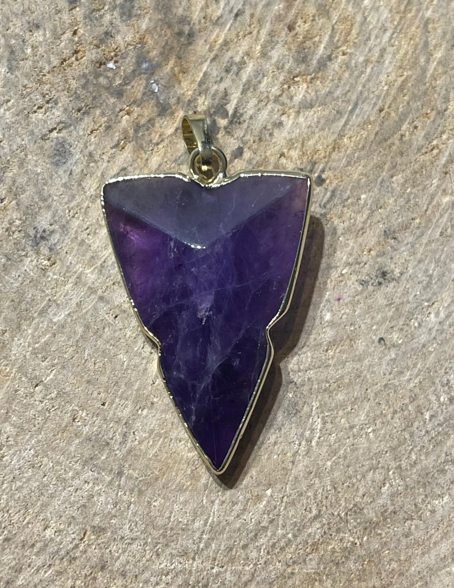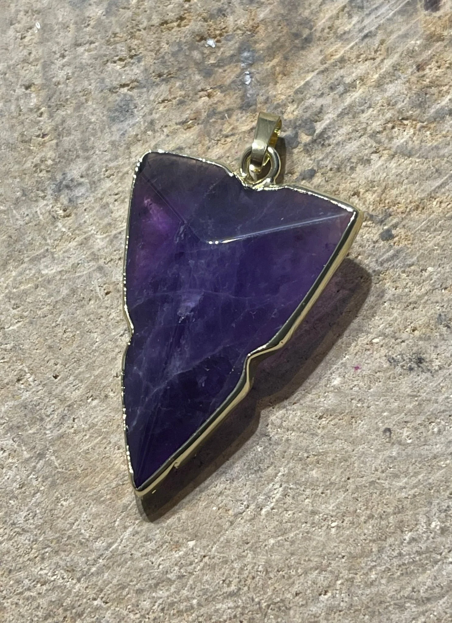 Pendentif en forme de flèche. En améthyste. En laiton doré. 45 × 25 mm avec bélière.