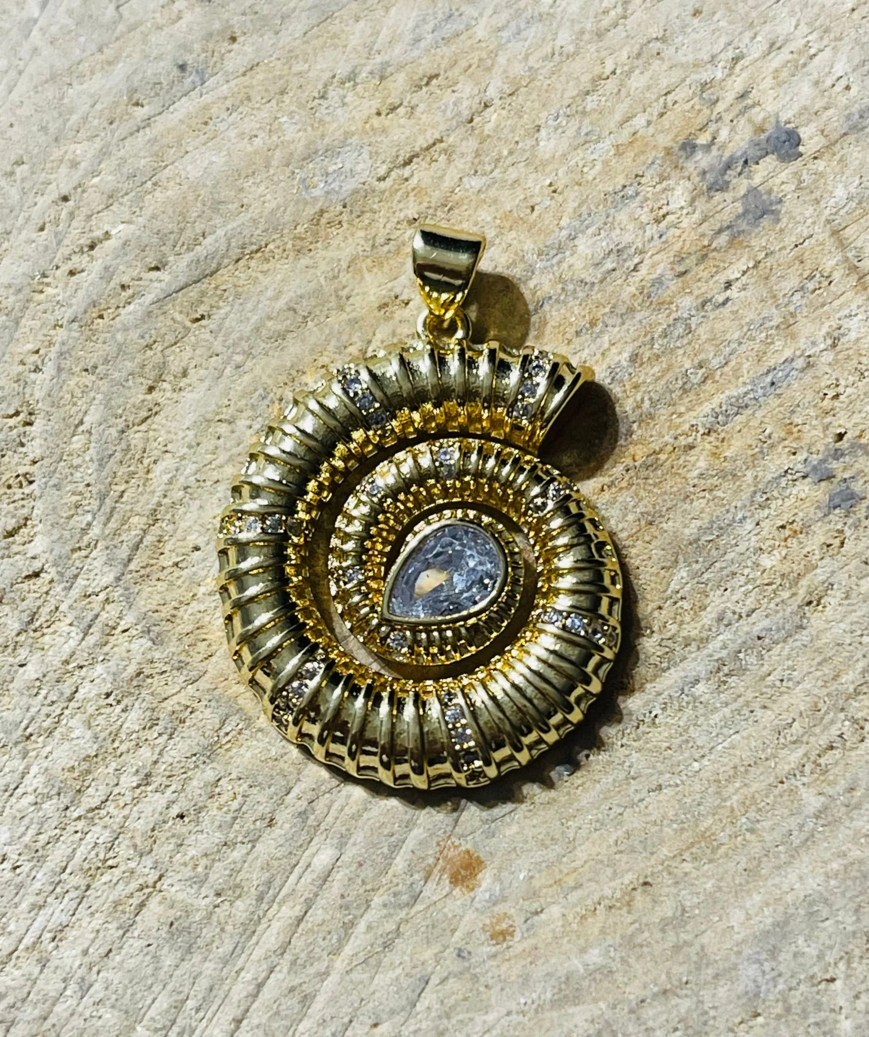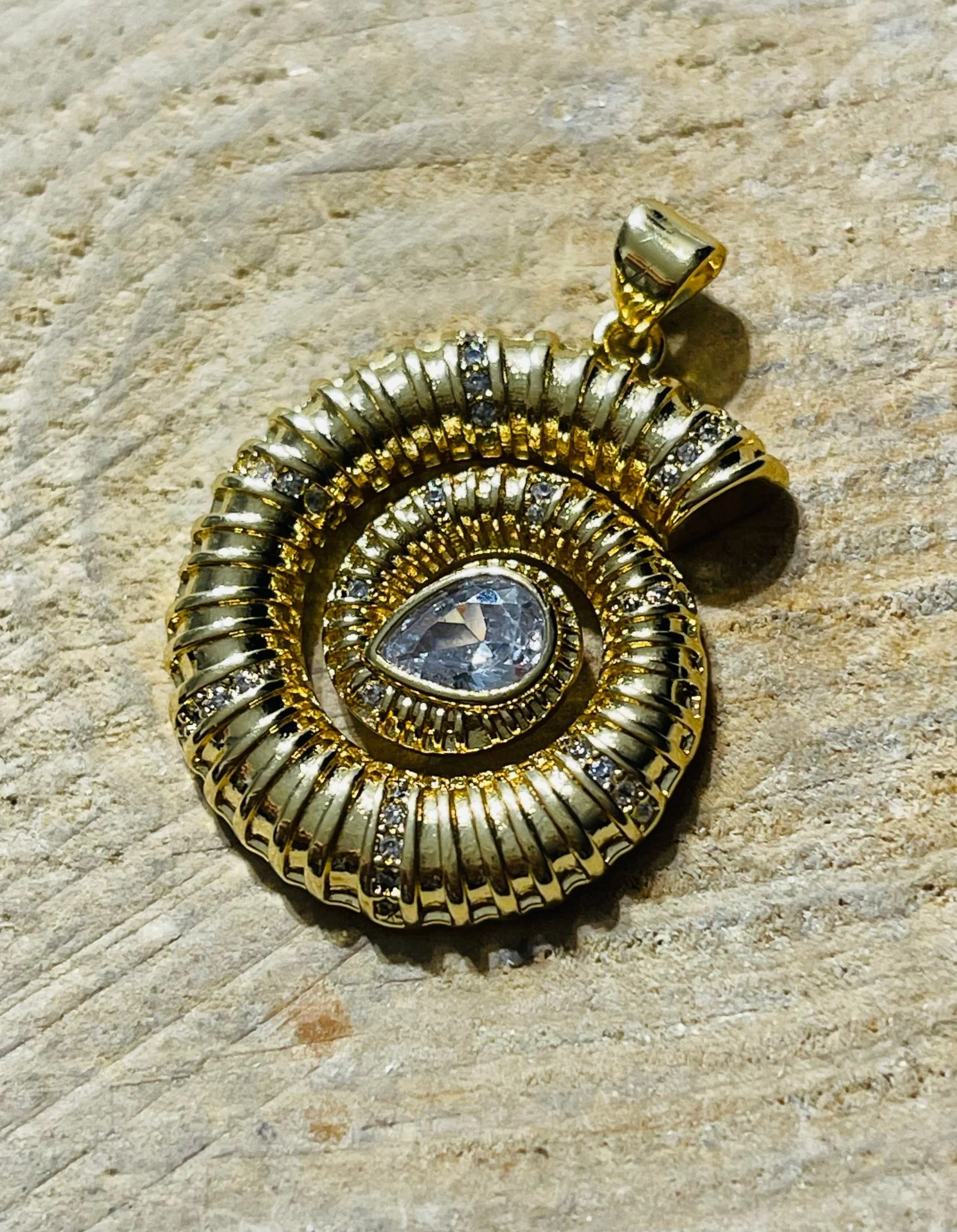 Pendentif en forme d’escargot. En laiton dorĂ©. Serti de diamants cz. 34 Ă— 24 mm avec bĂ©lière.