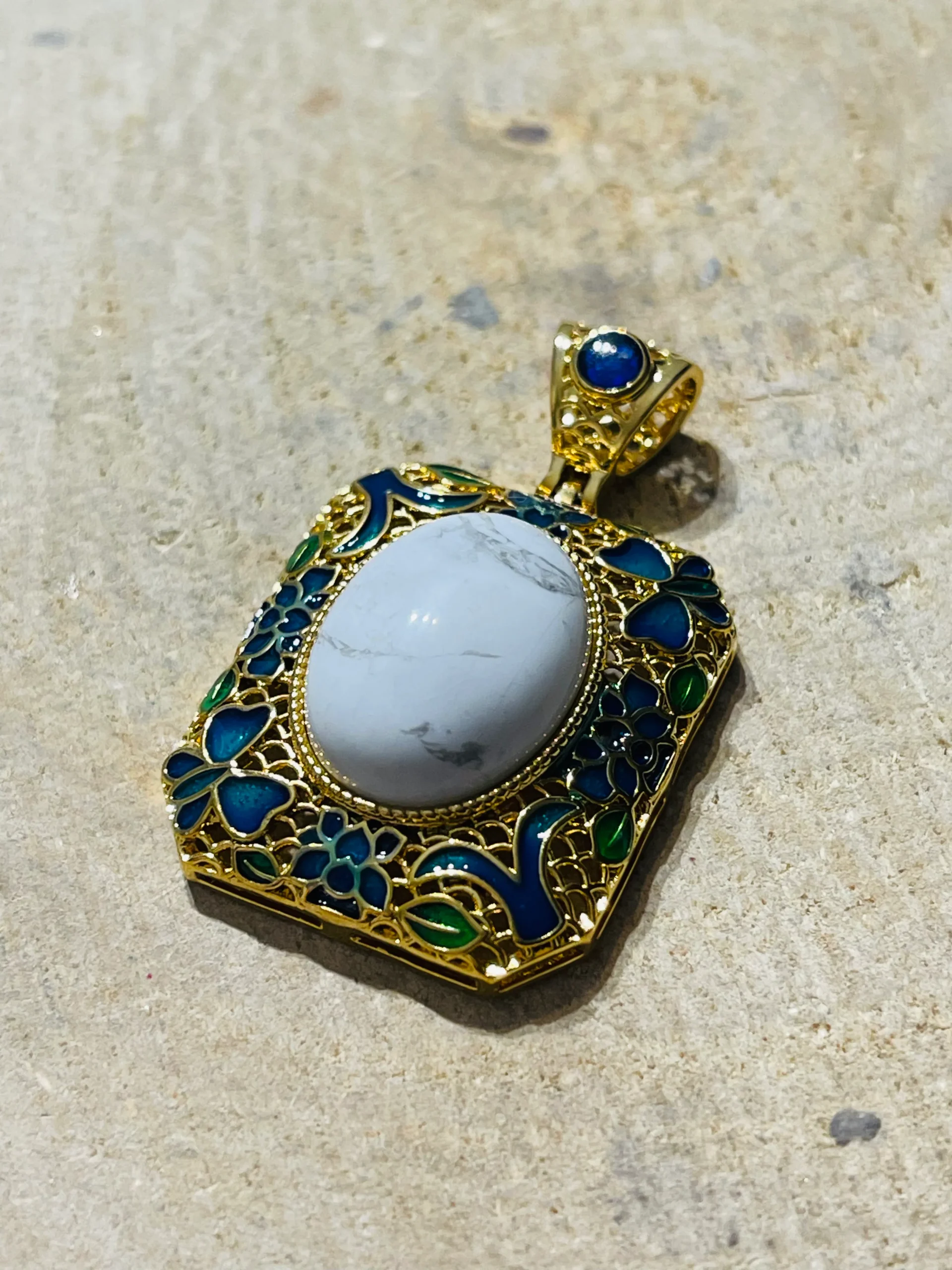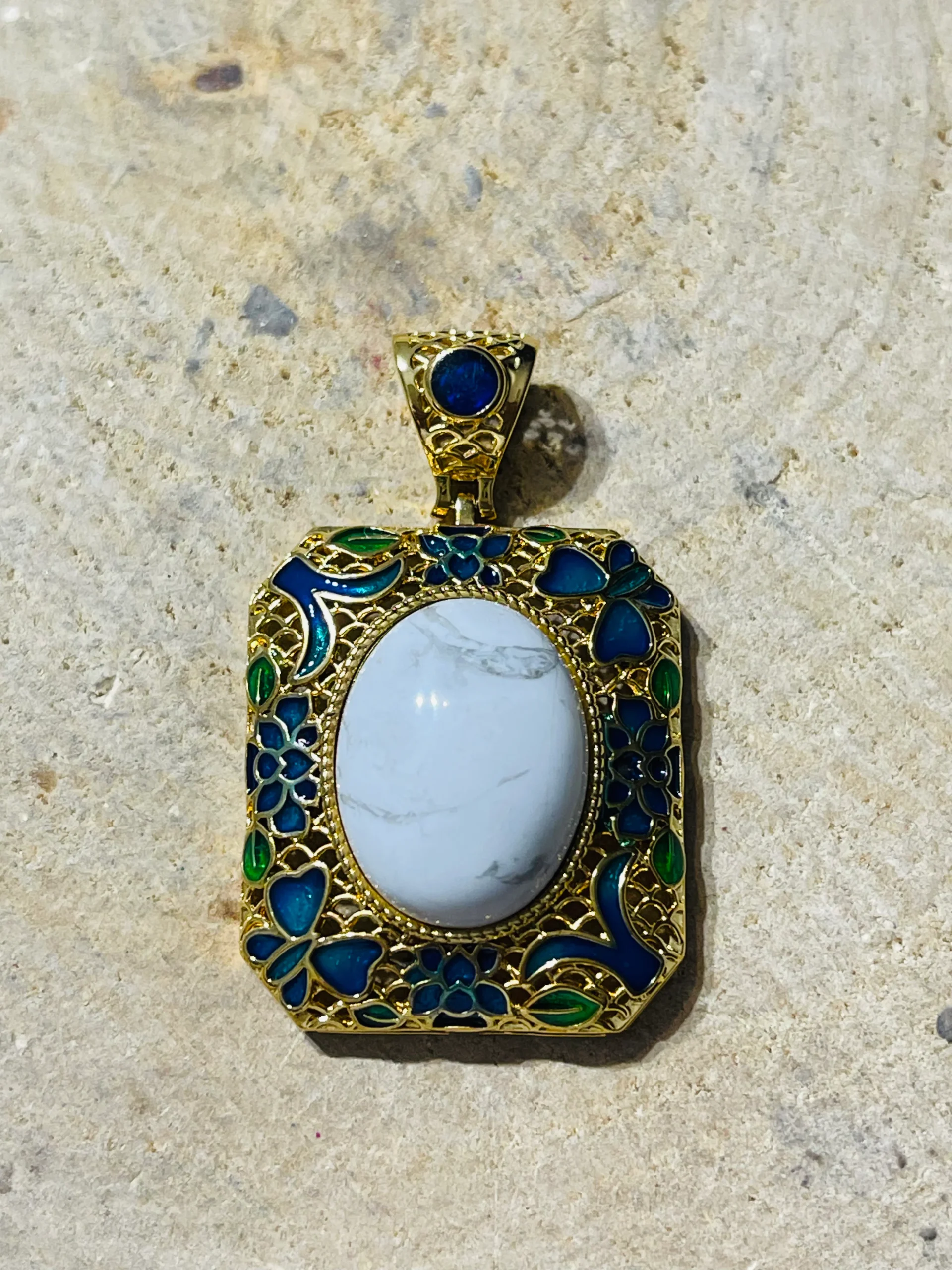 Pendentif serti au centre d’une Howlite (20 x 15 mm). Tout autour des fleurs émaillées. 45 x 28 mm avec bélière. Top qualité.