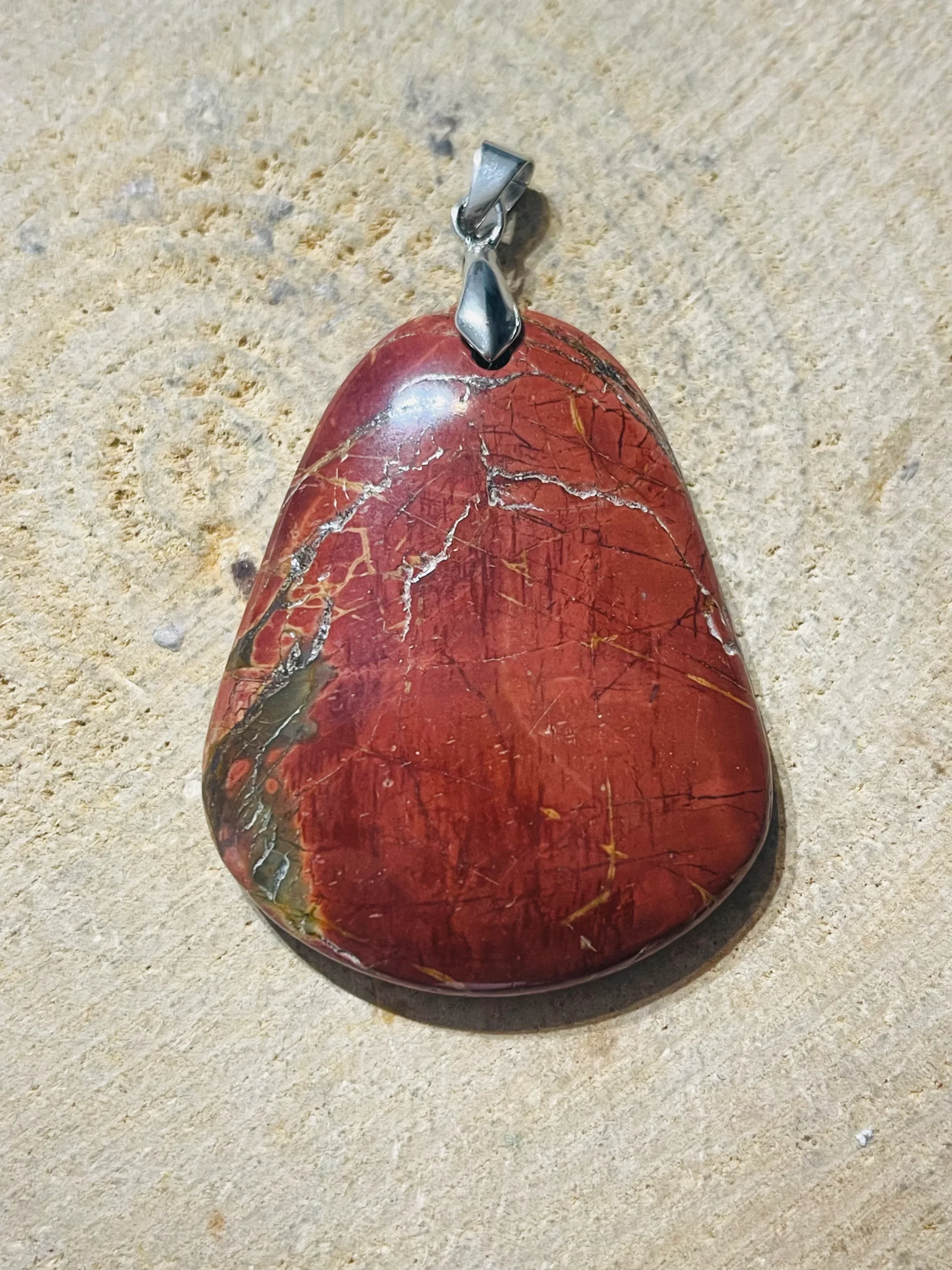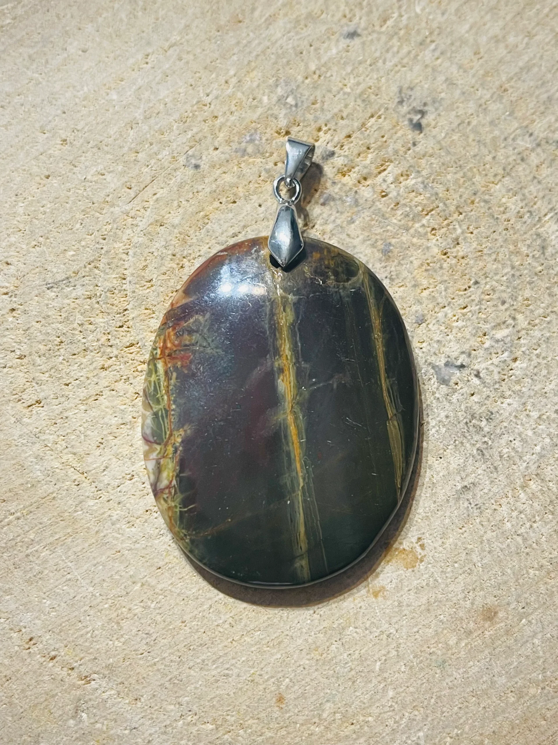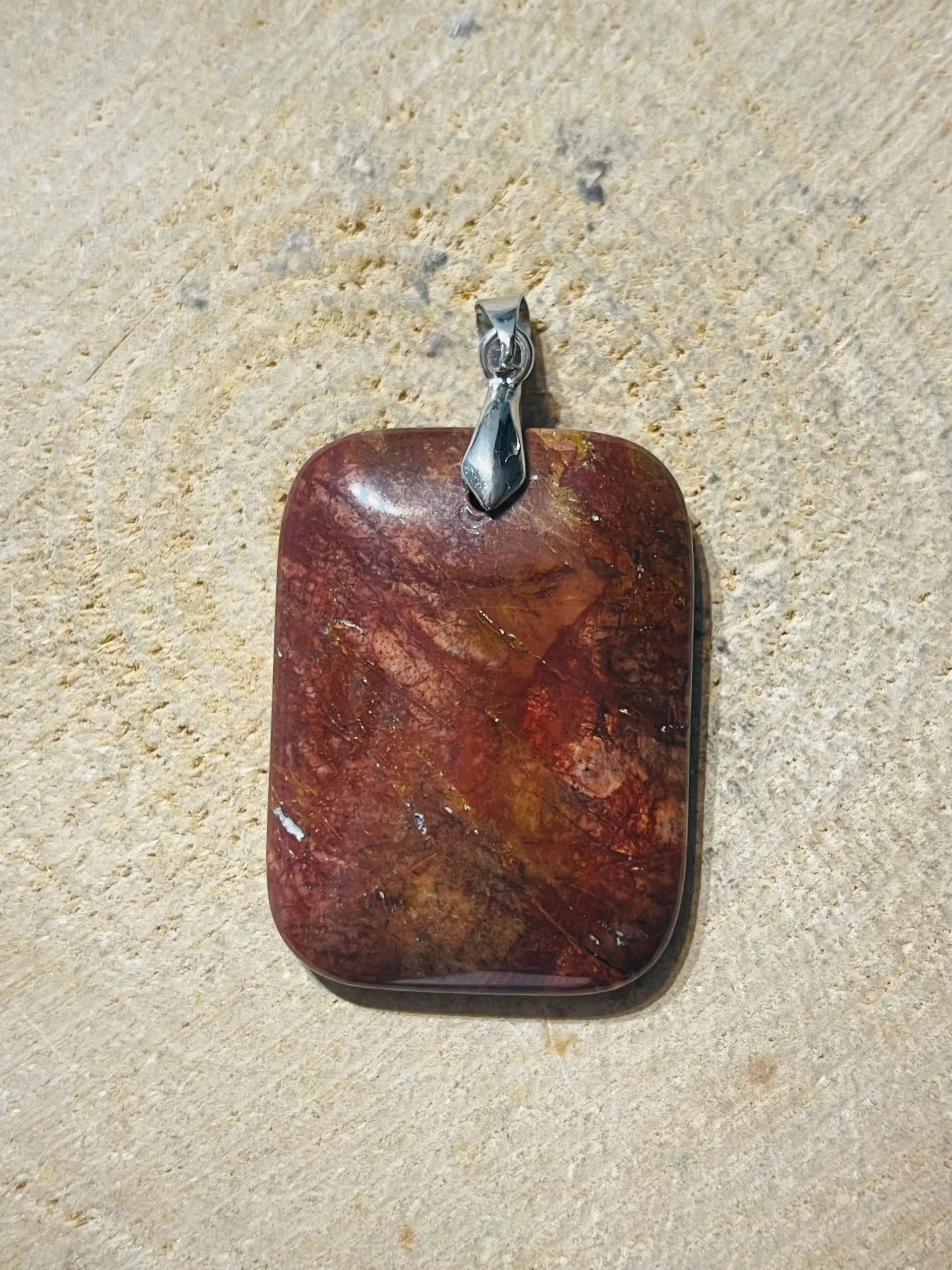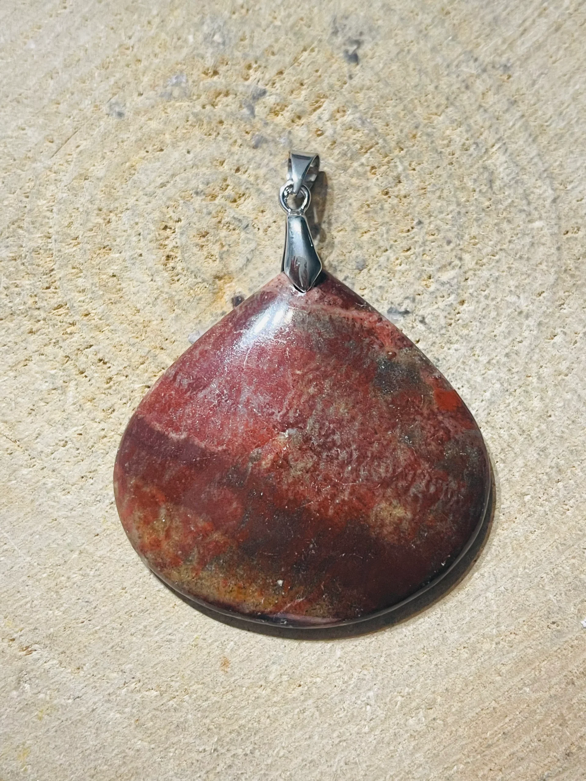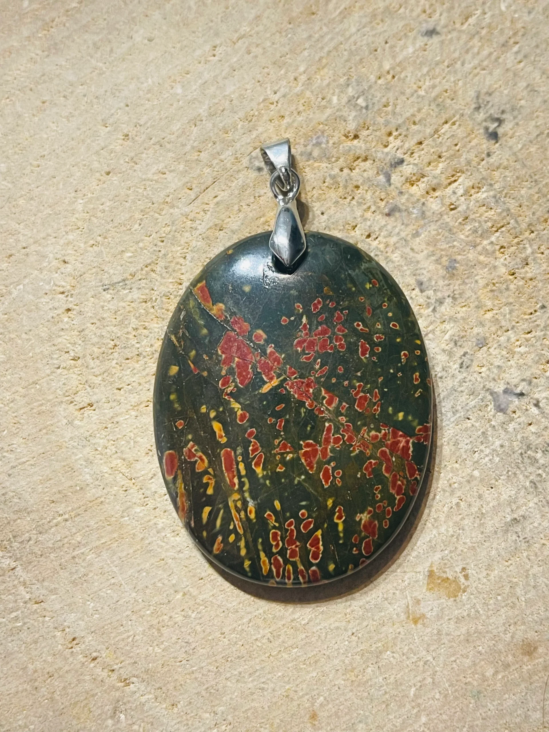 Il s’agit d’un Pendentif en Jaspe Picasso / Jaspe Polychrome cabochon.