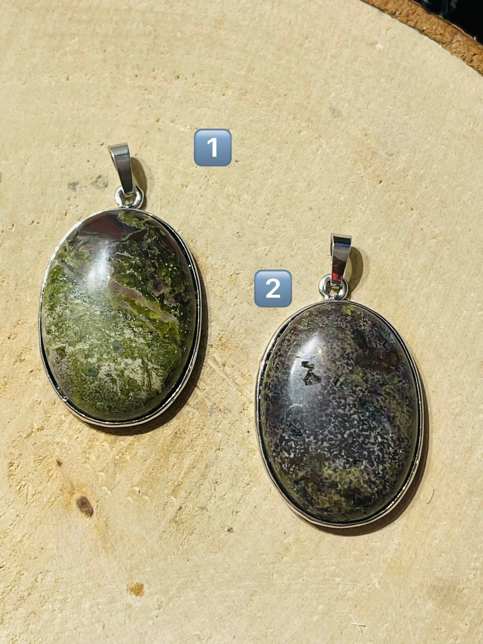 Pendentif ovale en jaspe sang de dragon. En laiton argenté. 48 × 27 mm avec bélière. Vertus : Améliore la force vitale, le courage, la force et la volonté. Il apporte de la joie.