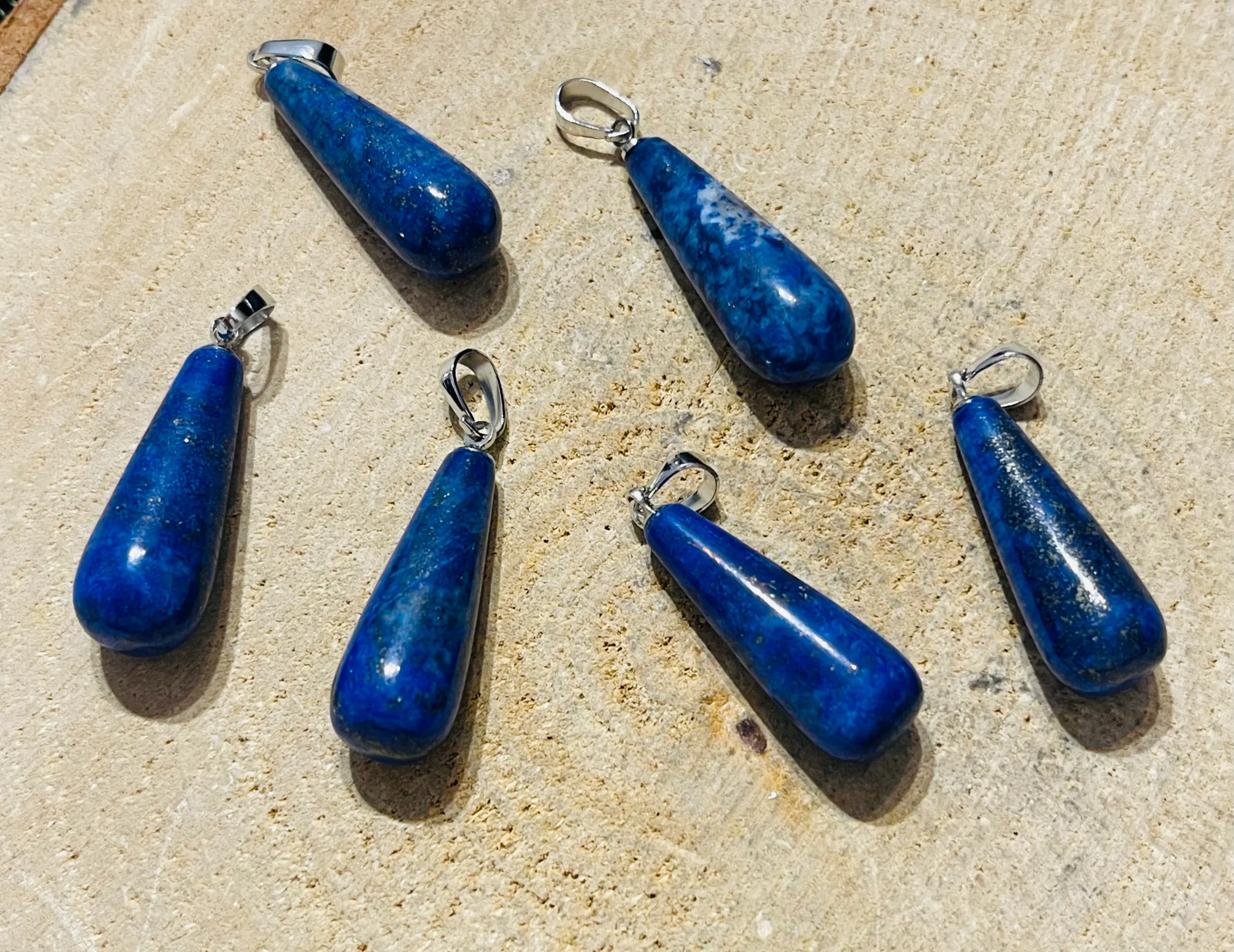 Pendentif en Lapis lazuli. Bélière en laiton argenté. Dimensions : 30 x 10 mm.