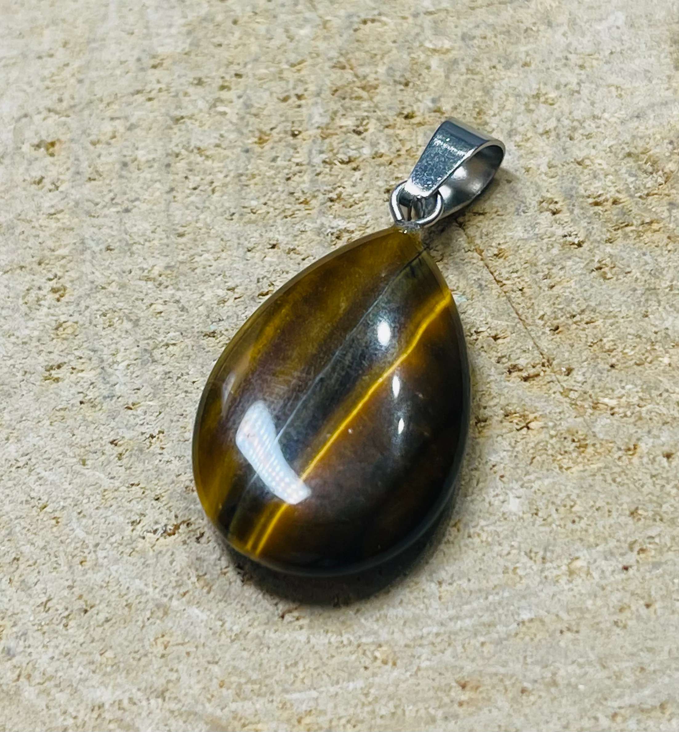 Il s’agit d’un Pendentif en Oeil de tigre cabochon.