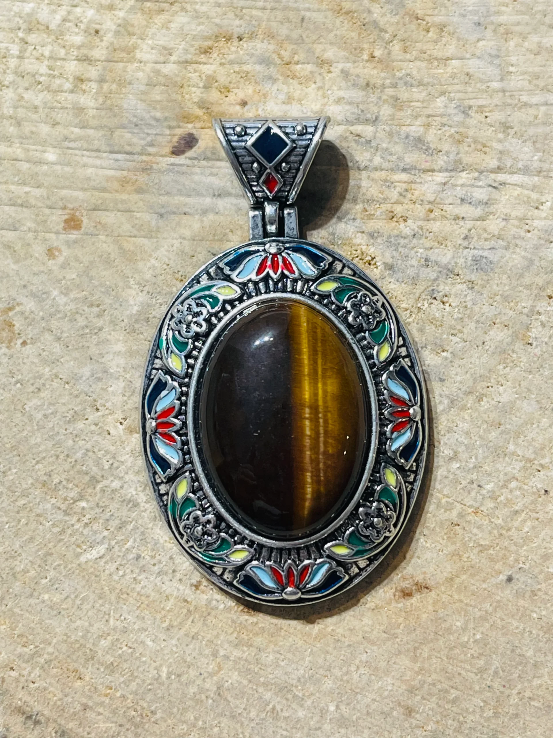 Pendentif serti au centre d’un oeil de tigre (25 X 18 mm). Tout autour des fleurs émaillées et en métal argenté. 55 x 32 mm avec bélière. Top qualité.
