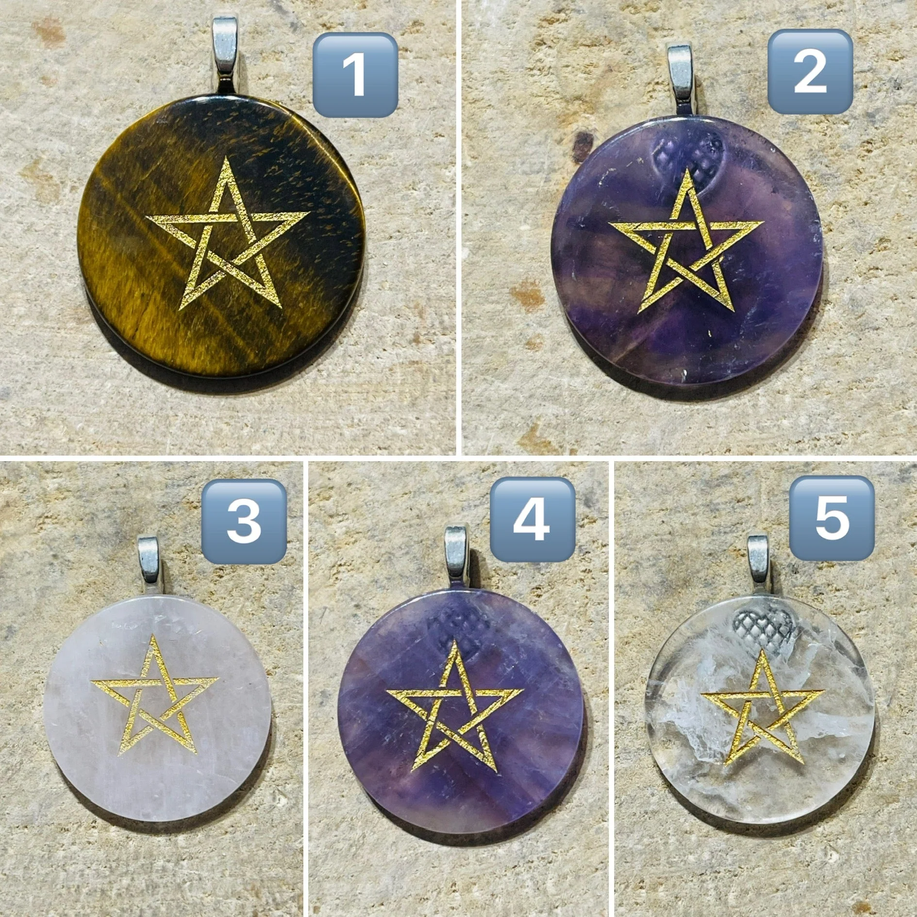 | Variété | 1️⃣ Œil de Tigre, 2️⃣ Améthyste, 3️⃣ Quartz Rose, 4️⃣ Améthyste bis, 5️⃣ Cristal de roche |
