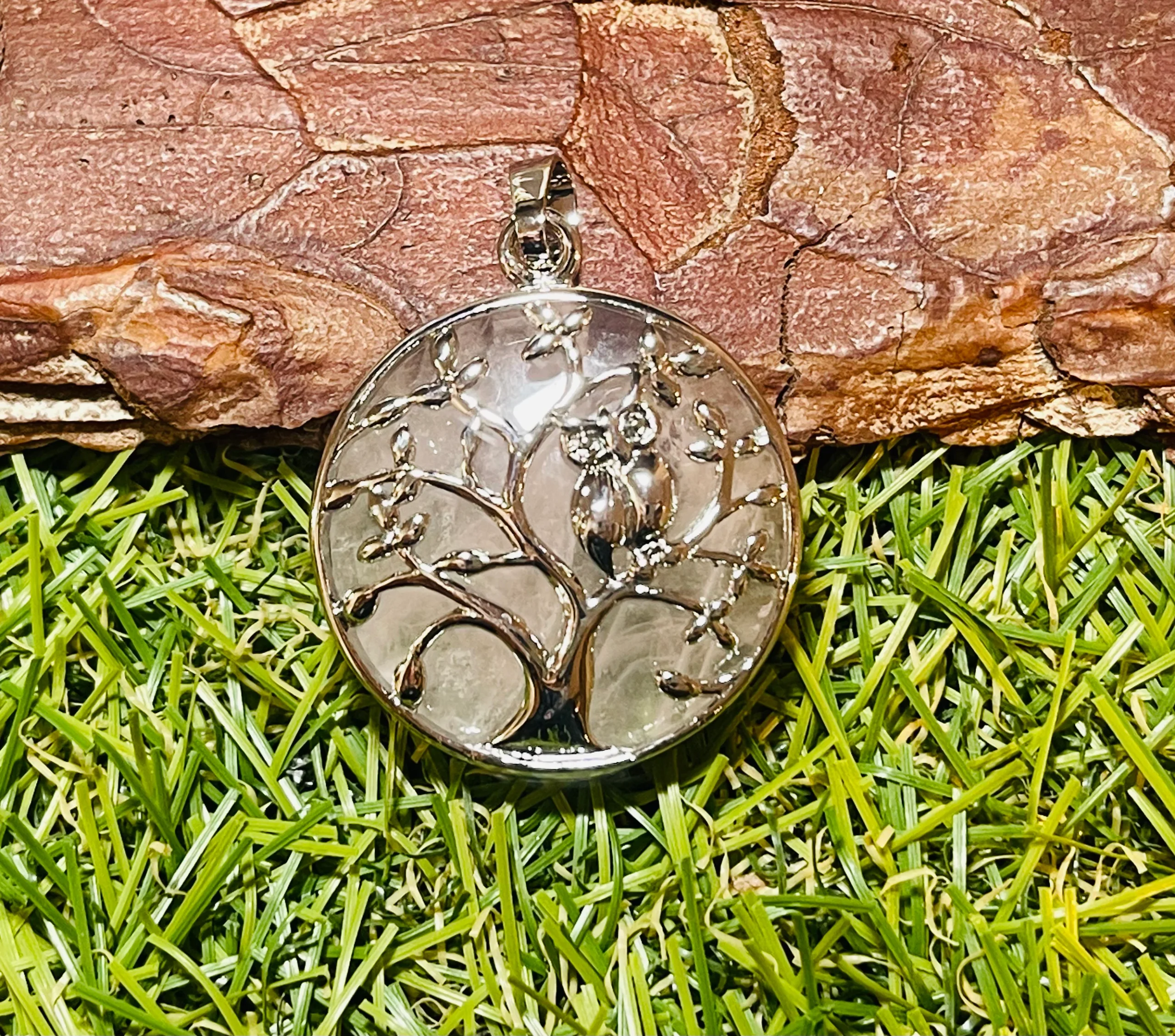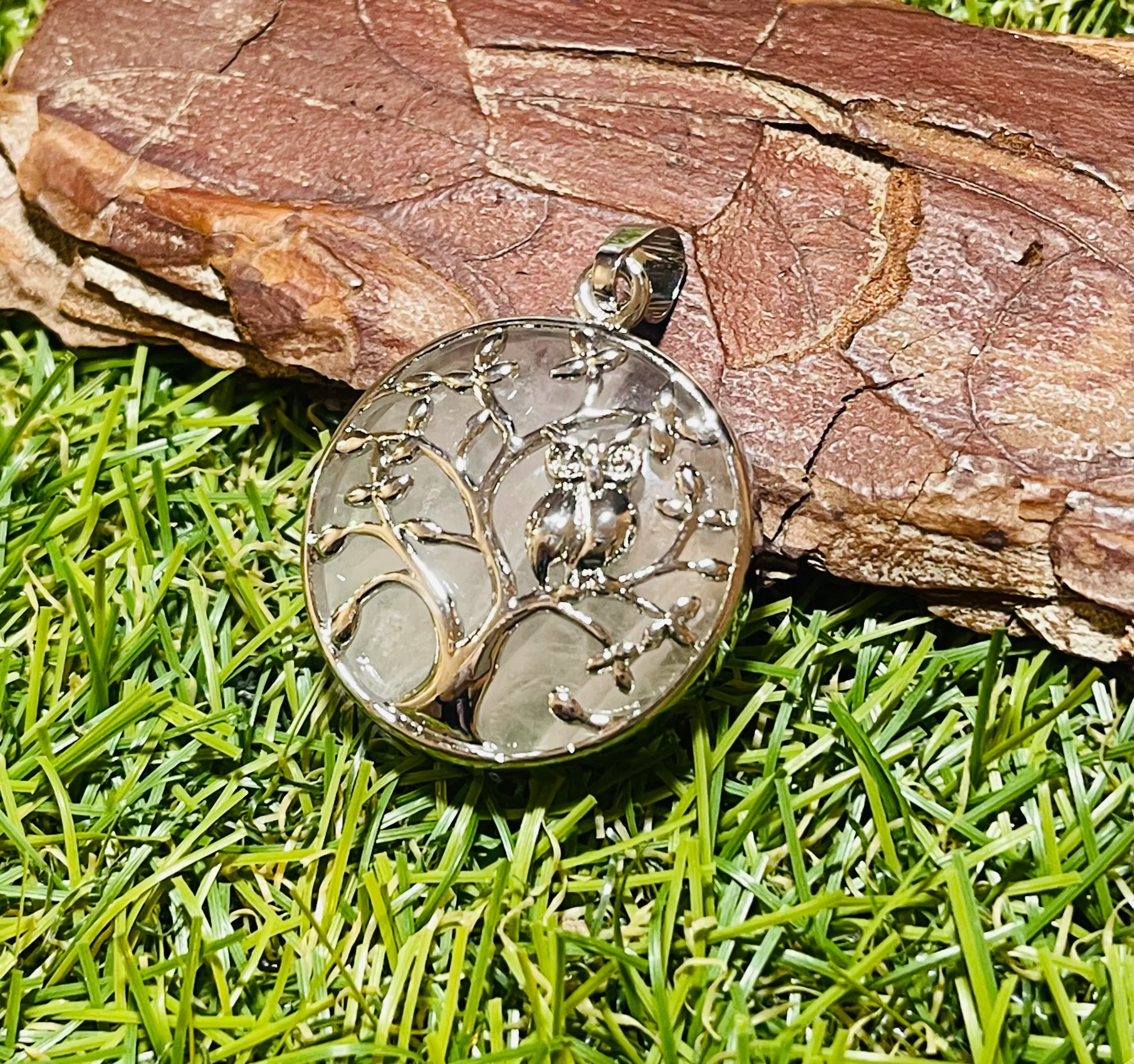 Pendentif en Quartz rose avec arbre et hibou