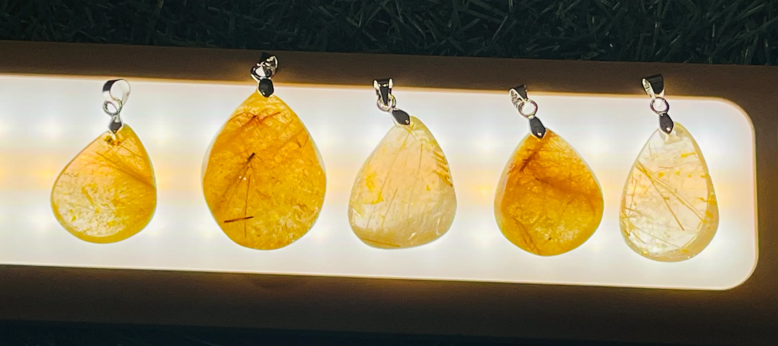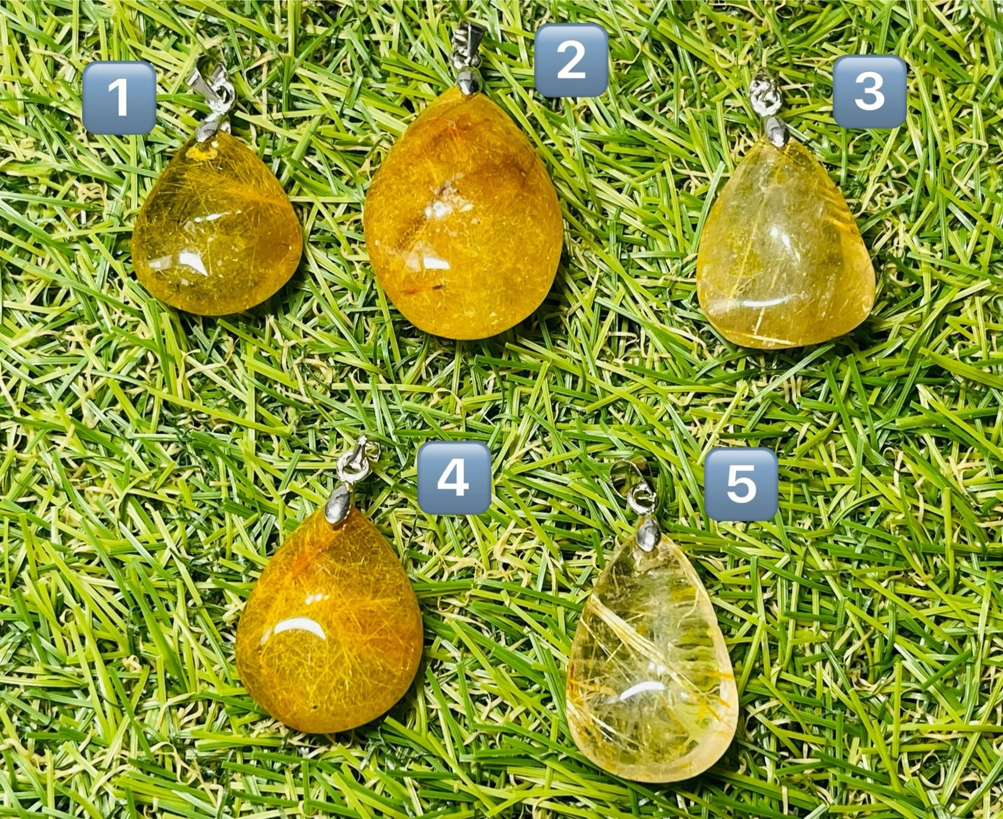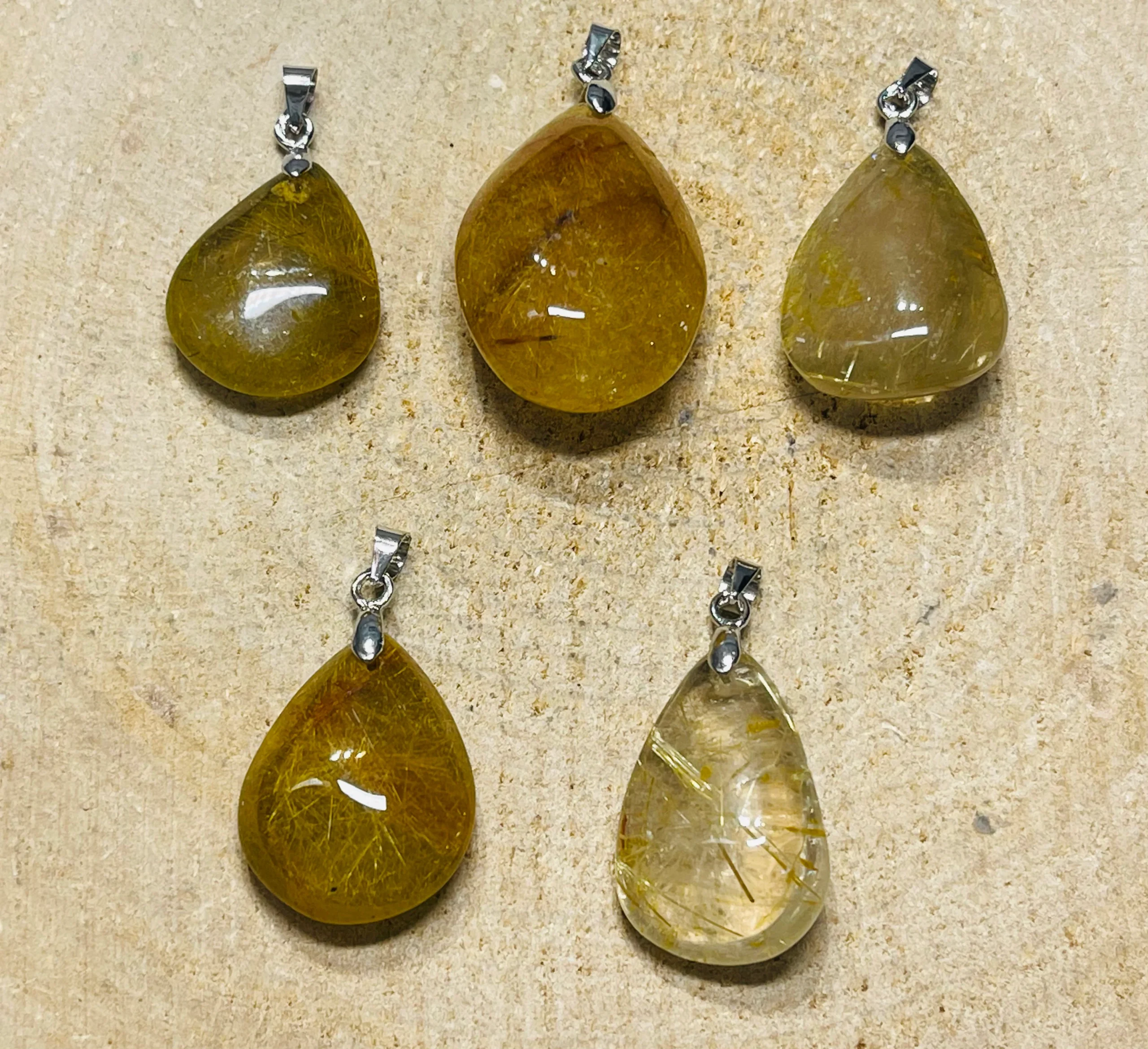 Il s’agit de pendentif en Quartz rutile doré. Entre 2-3 x 1,7-2,1 cm. Bélière en laiton argenté.