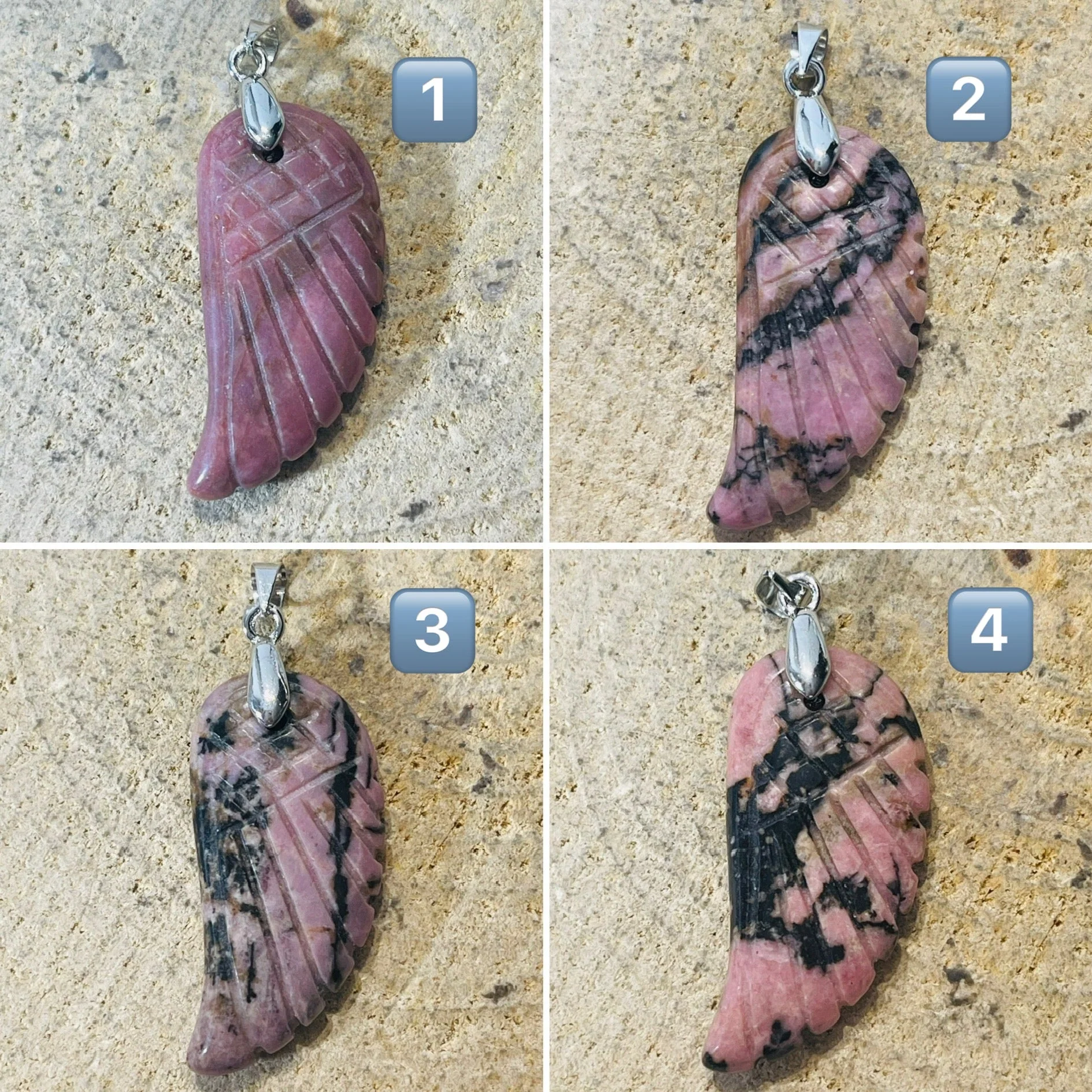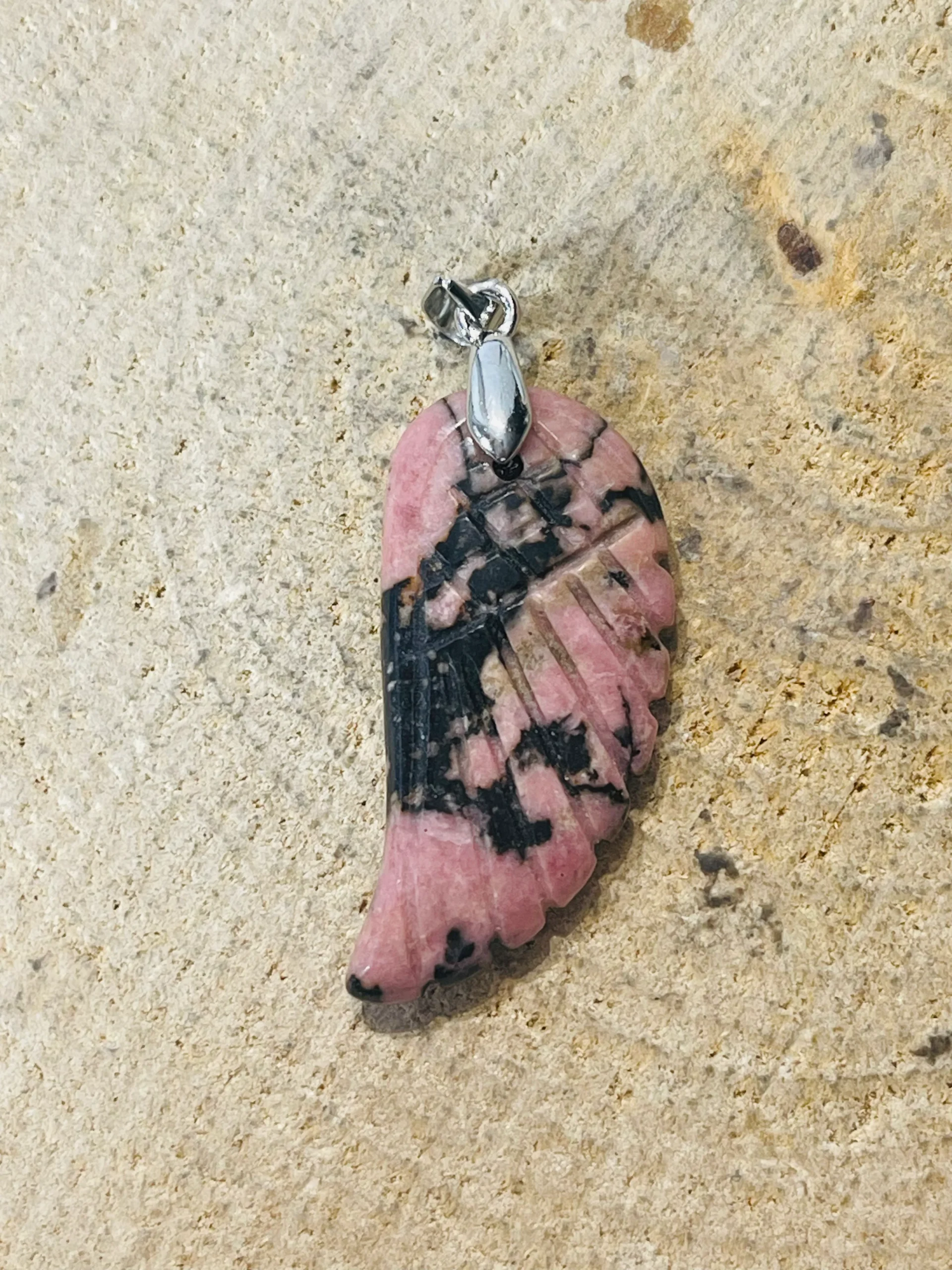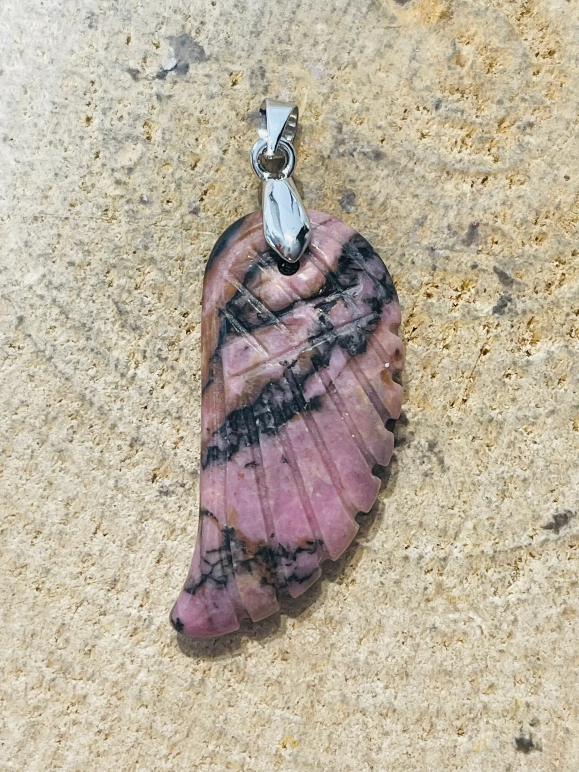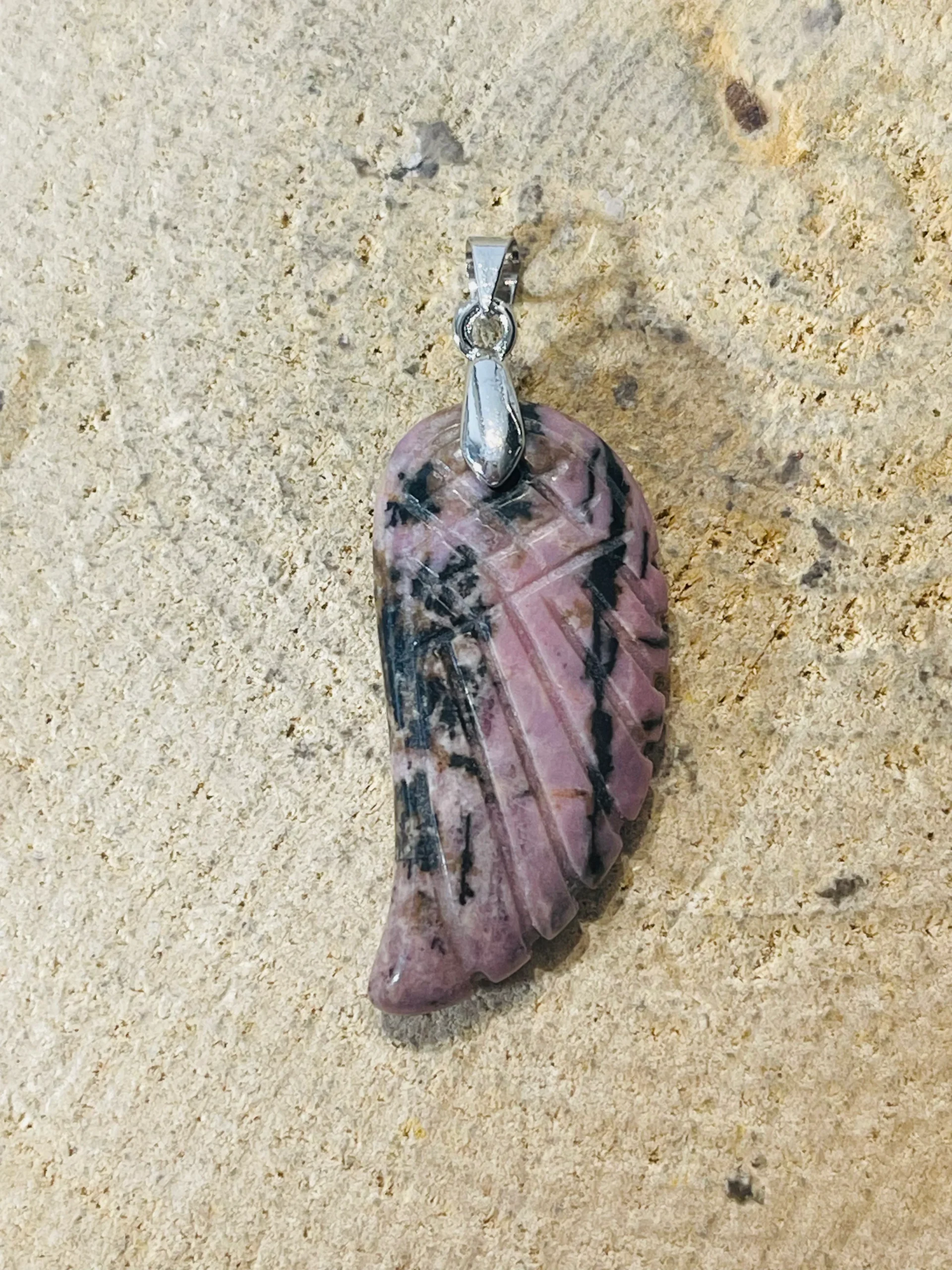 PENDENTIF AILE EN RHODONITE. Il s’agit d’un Pendentif en forme d’Aile d’ange en Rhodonite. Dimensions : 36 x 15 mm. Vendu à l’unité.