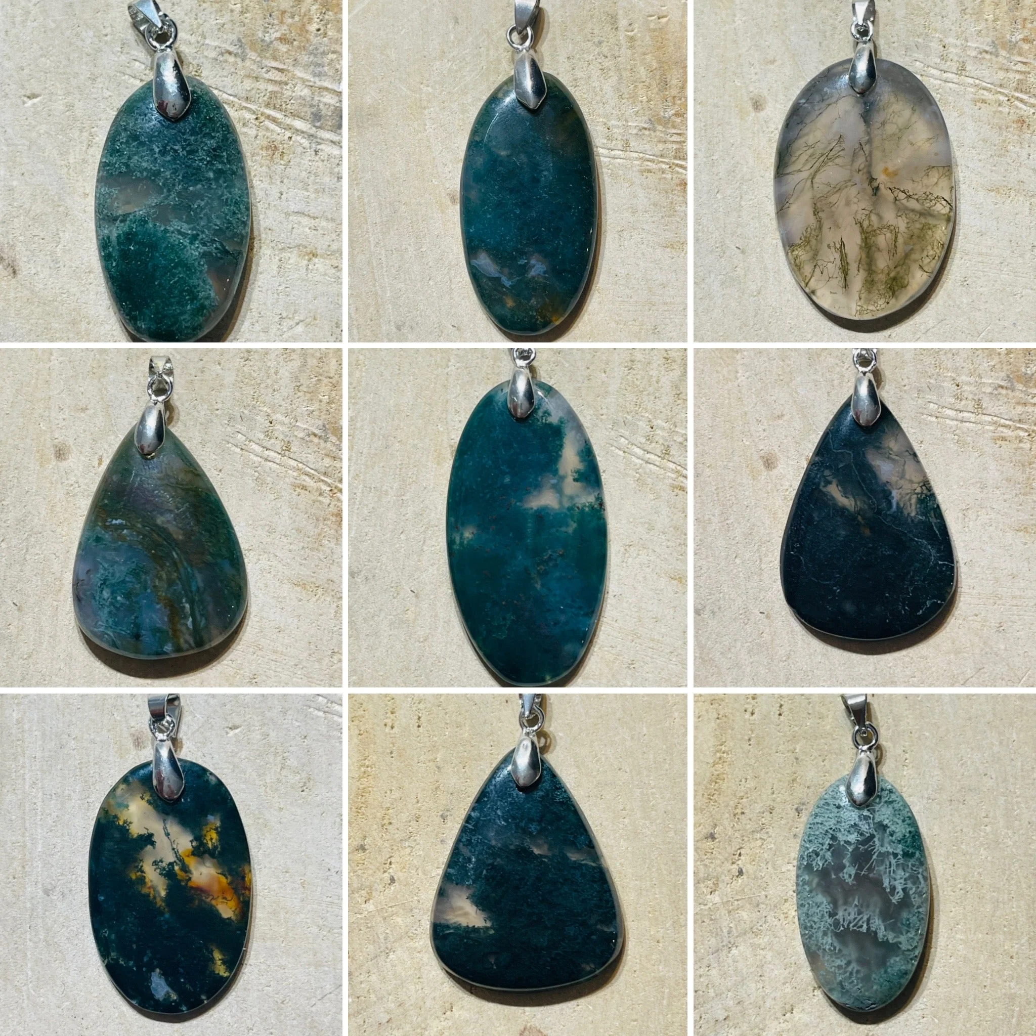 Il s’agit de 9 pendentifs en Agate mousse cabochon.