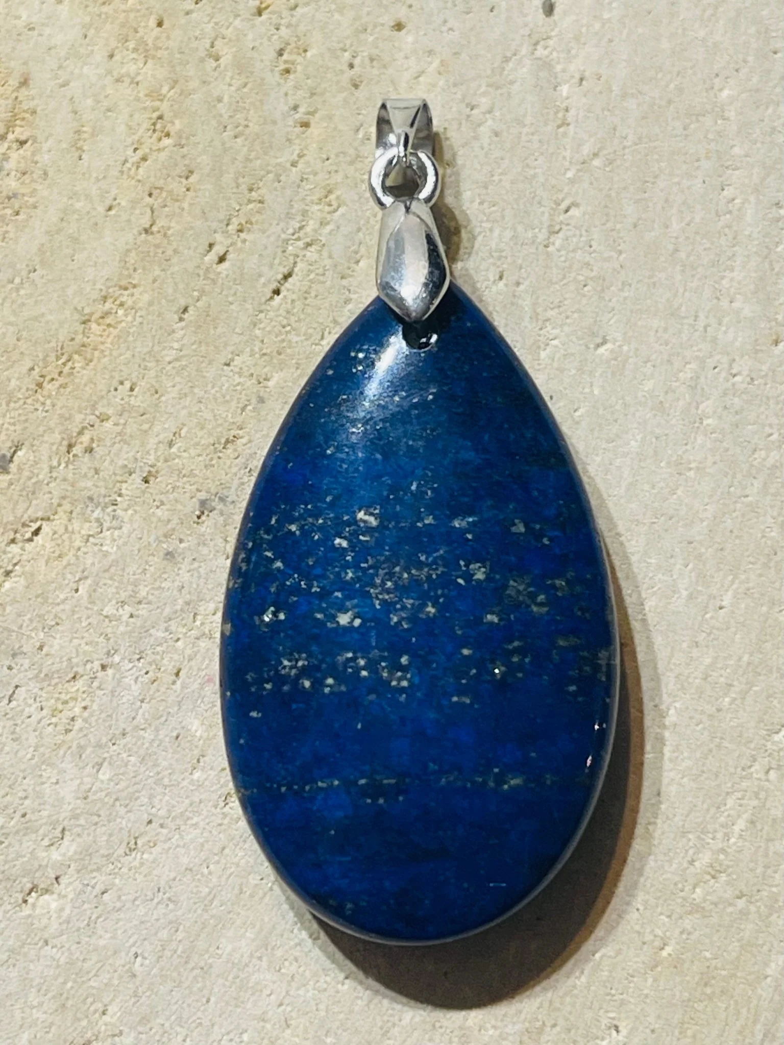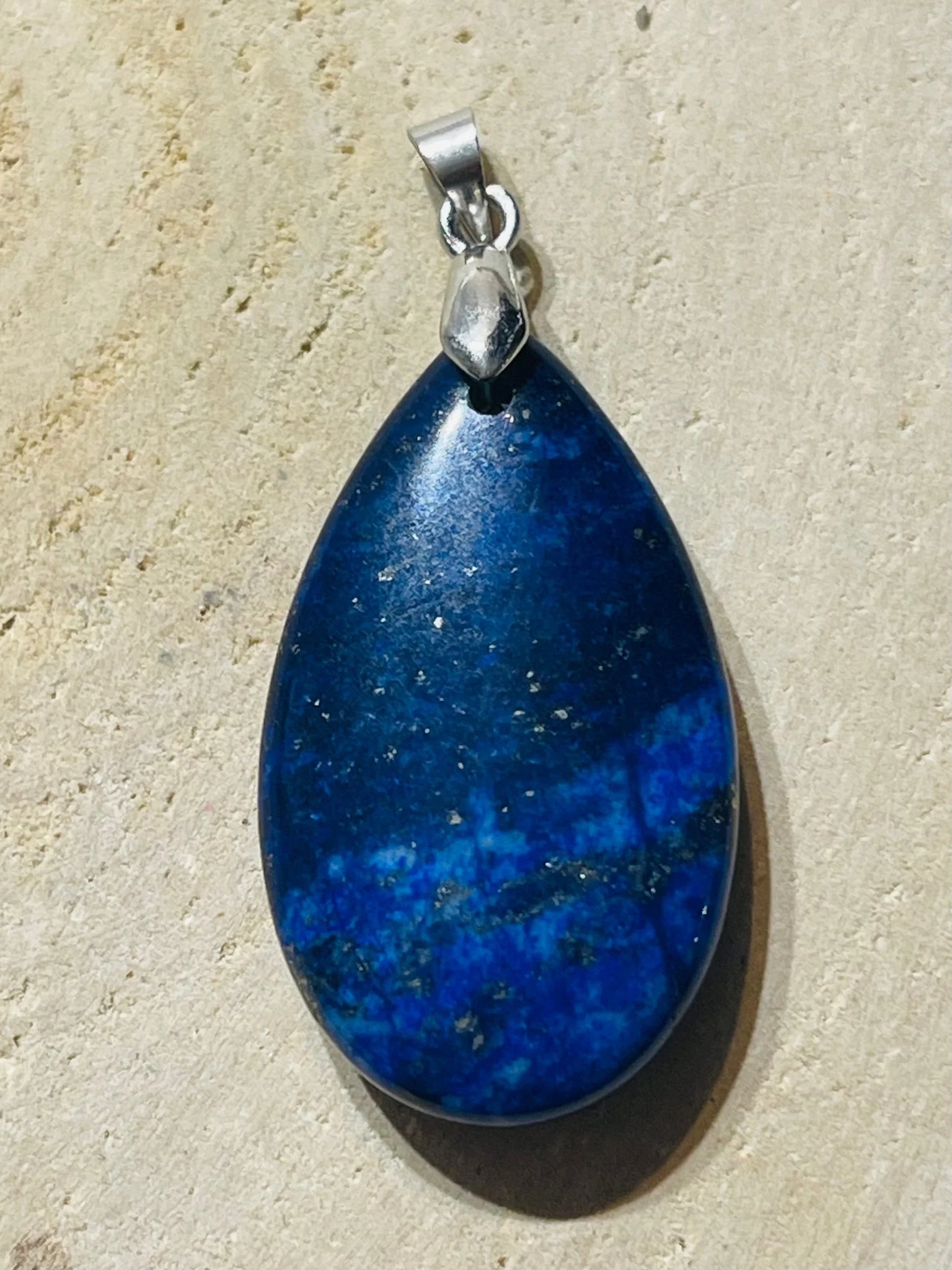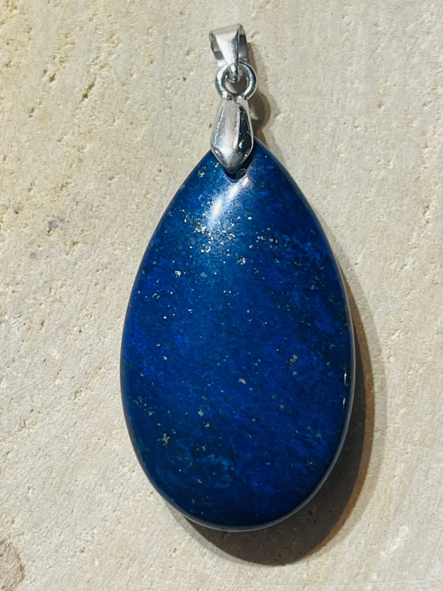 Il s’agit de pendentifs en Lapis lazuli. 35 x 20 mm. Bélière en laiton argenté. Vertus : le Lapis Lazuli stimule l’intellectuel, la créativité, l’imagination, l’ingéniosité et la finesse d’esprit.