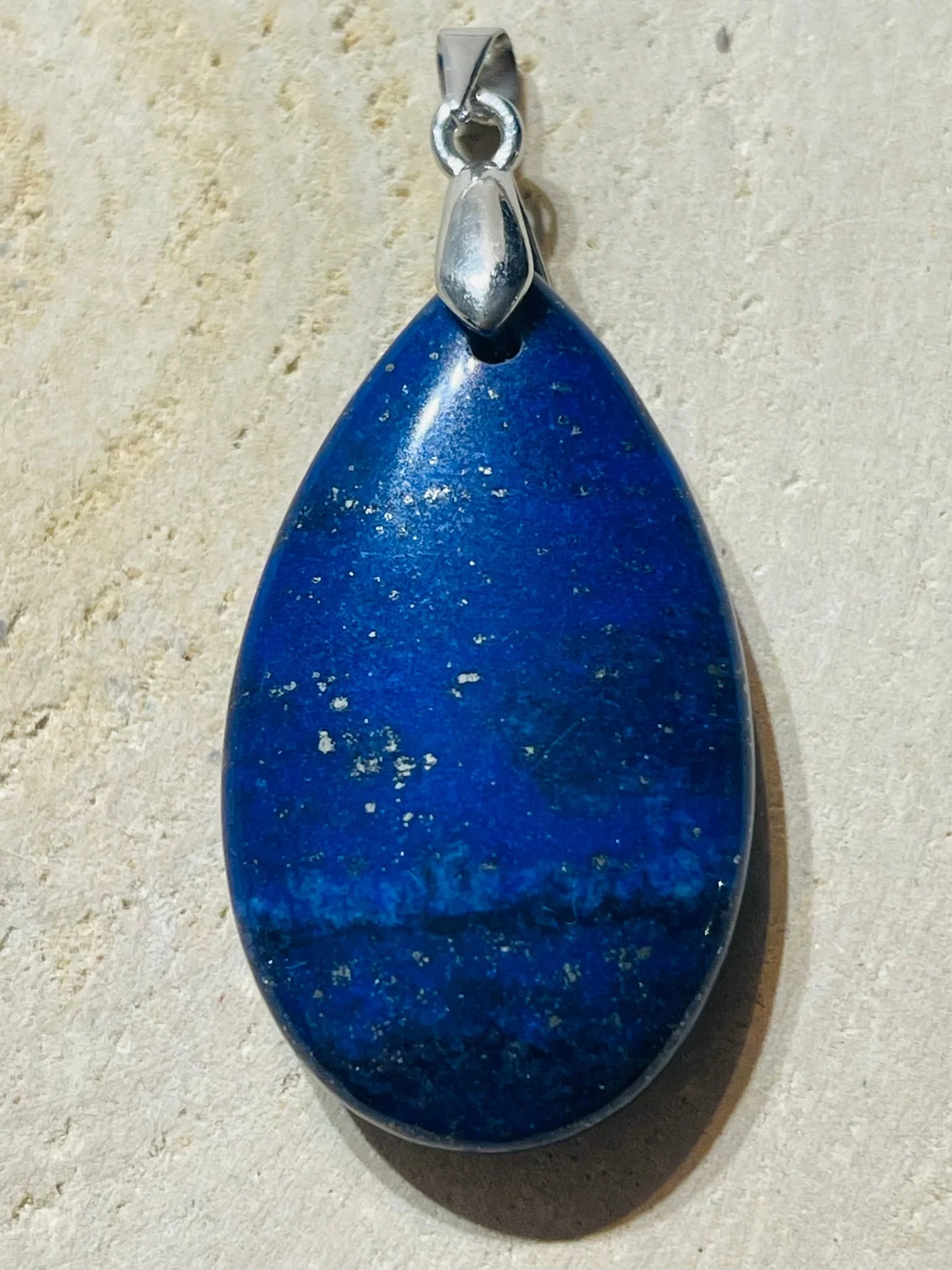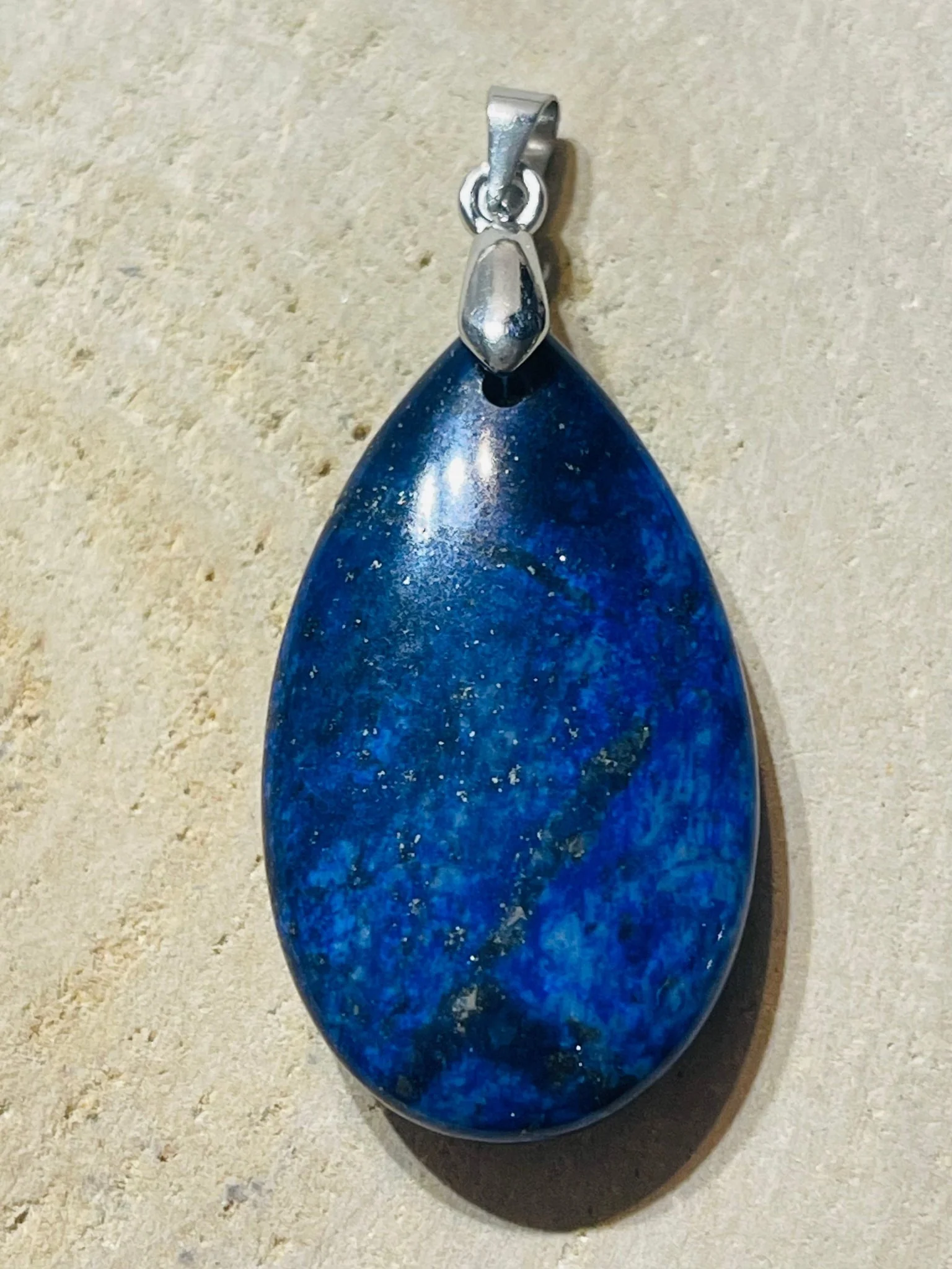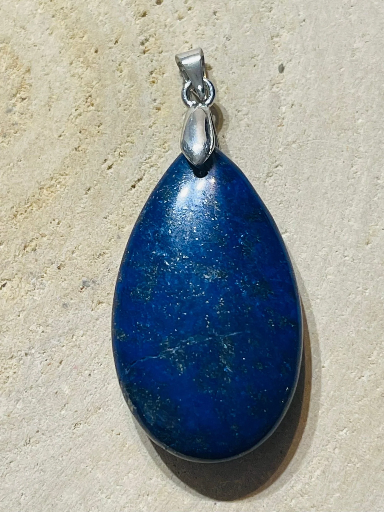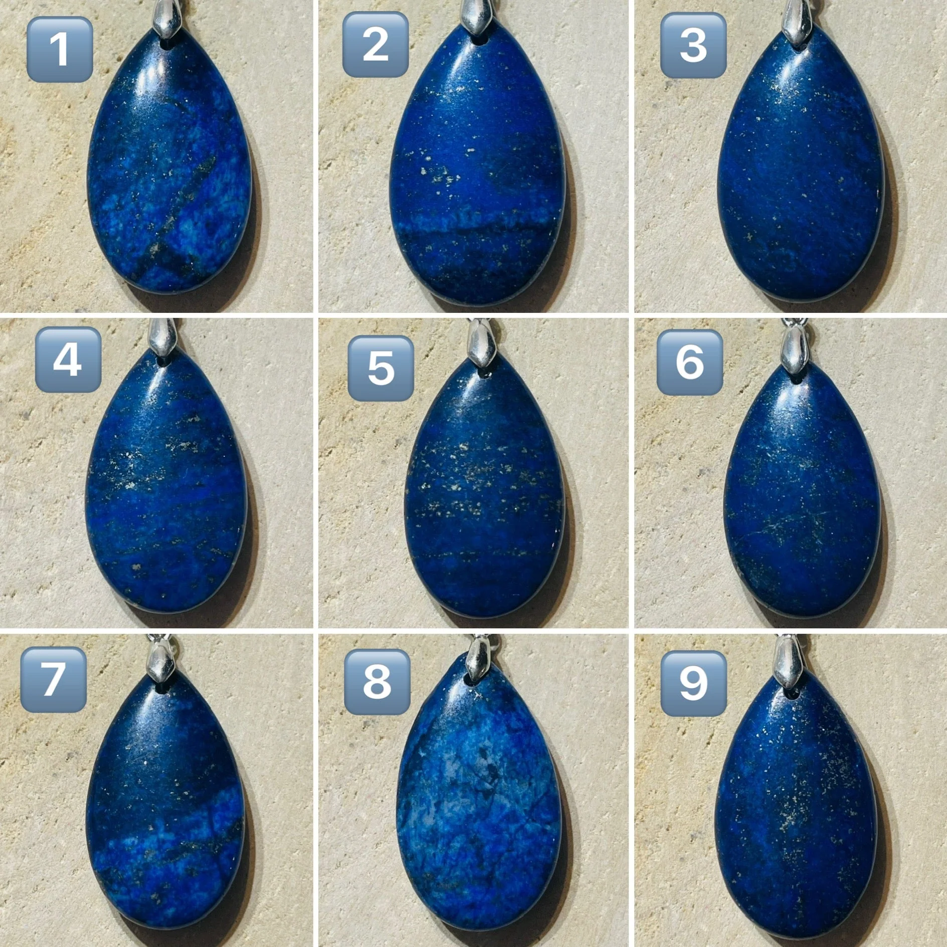 Il s’agit de pendentifs en Lapis lazuli. 35 x 20 mm. Bélière en laiton argenté. Vertus : le Lapis Lazuli stimule l’intellectuel, la créativité, l’imagination, l’ingéniosité et la finesse d’esprit.