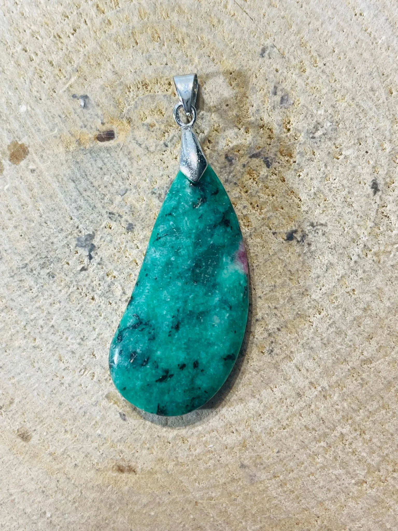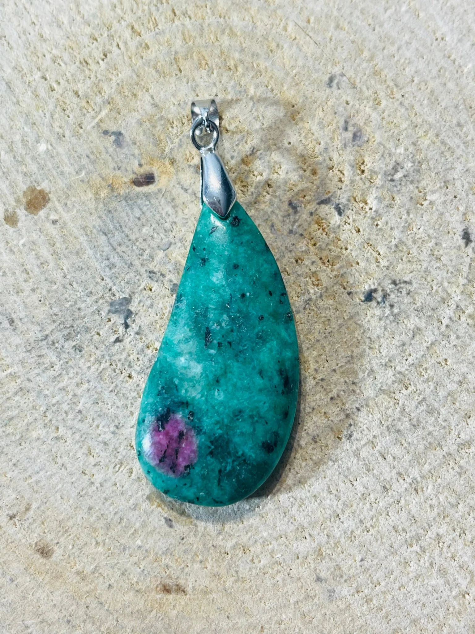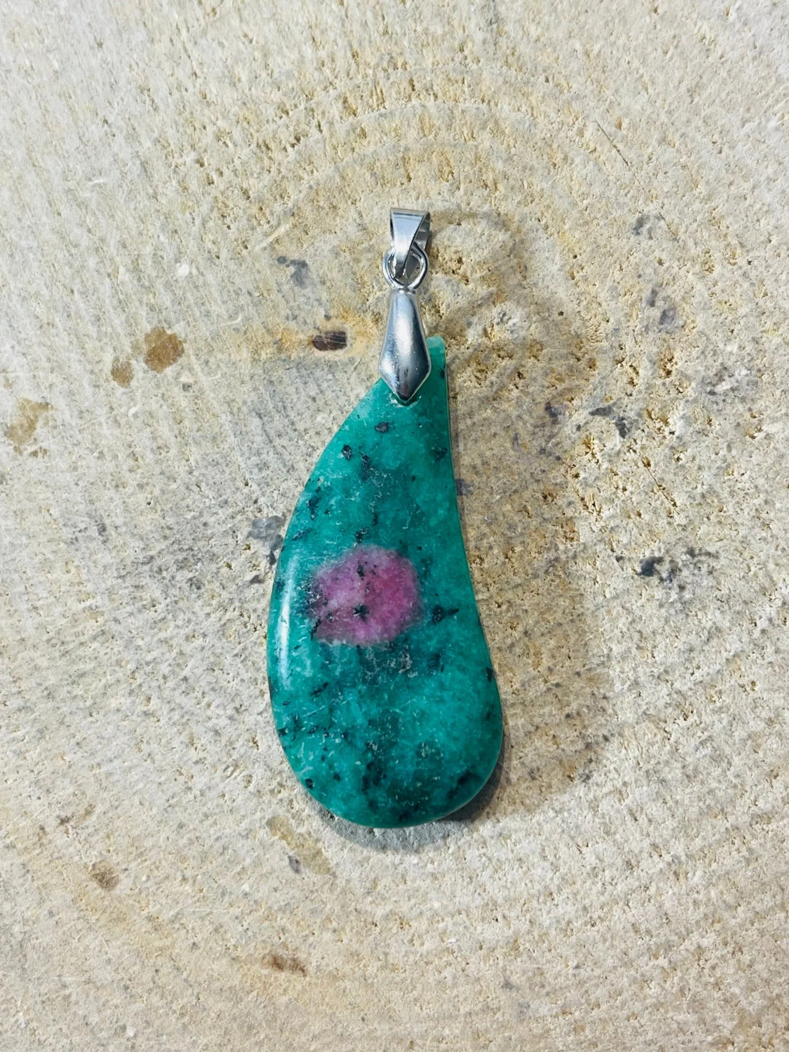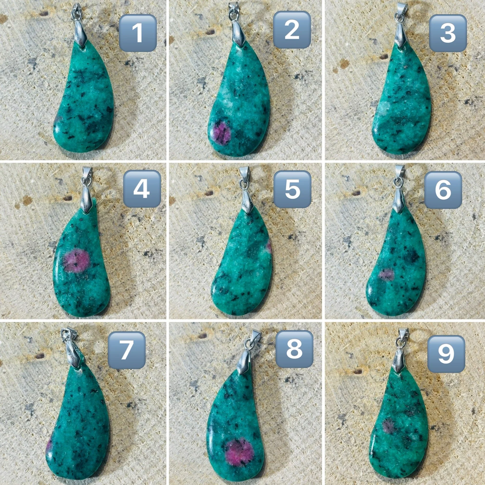 Il s’agit de Pendentifs en Rubis zoisite cabochon en forme de goutte. (43 x 20 mm). Bélière en laiton argenté. 9 pendentifs au choix. Vertus : accroît la motivation, stimule l’énergie (créatrice), soulage colère et chagrin.
