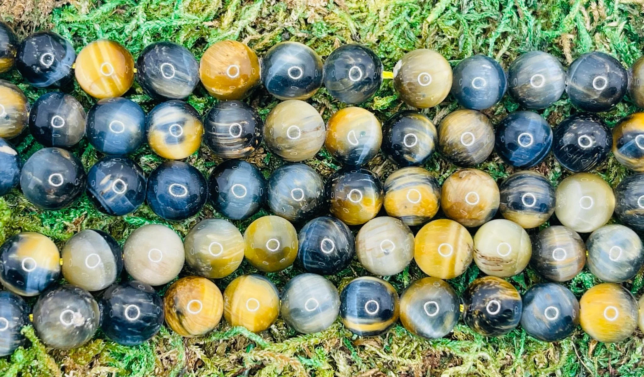 Il s’agit de perles en pierre naturelle véritable en Oeil de Tigre jaune et bleu.